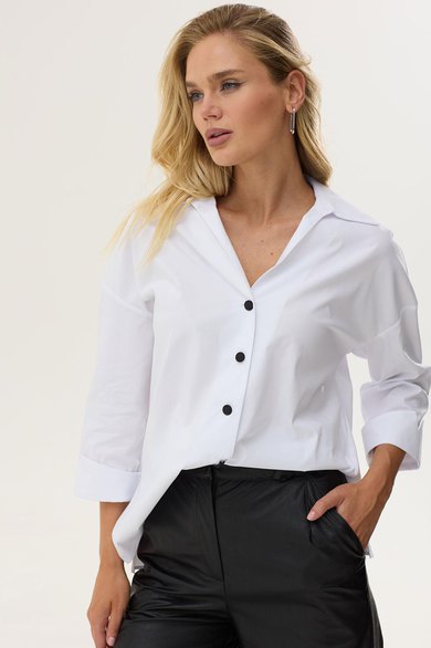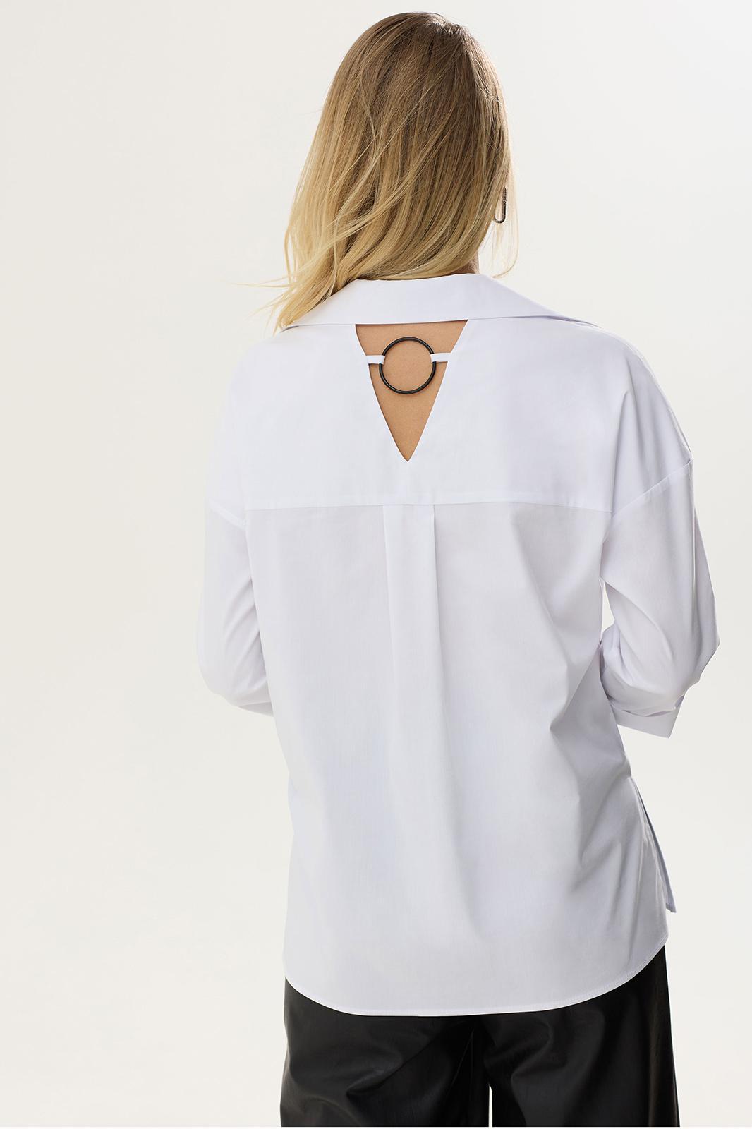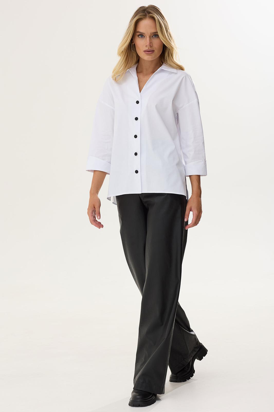 Стильная блузка прямого силуэта из хлопковой ткани с удлиненной спинкой. Воротник отложной на стойке с застежкой на петли и пуговицы. На спинке фигурный вырез с декоративной фурнитурой. На спинке кокетка со складками. В боковых швах разрезы. Обращаем ваше внимание, что фурнитура может незначительно отличаться от фото. Длина изделия: (44-48р -65см)(50-54р – 68см)(56-60р - 71см)