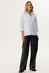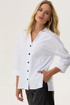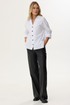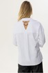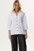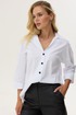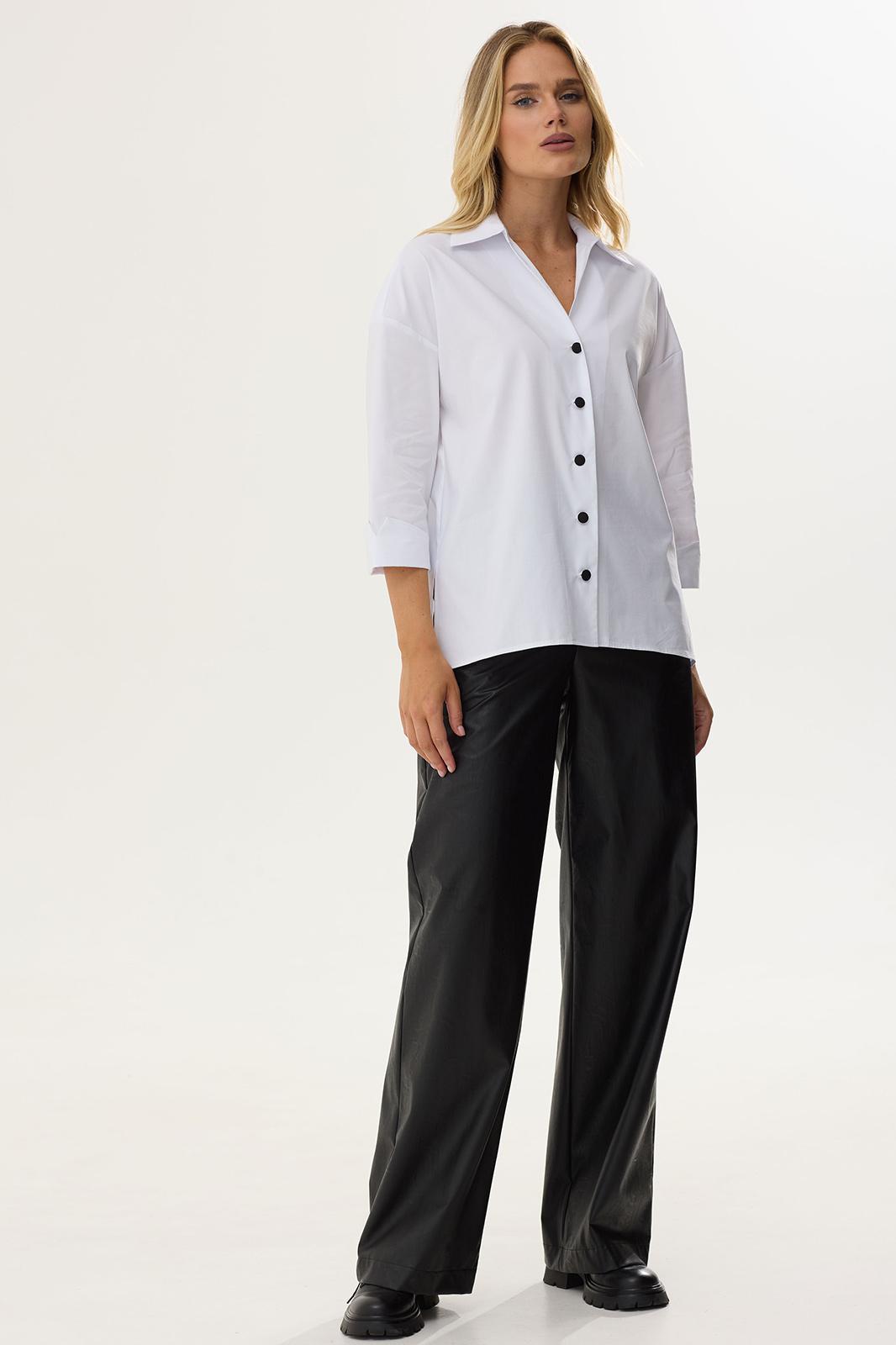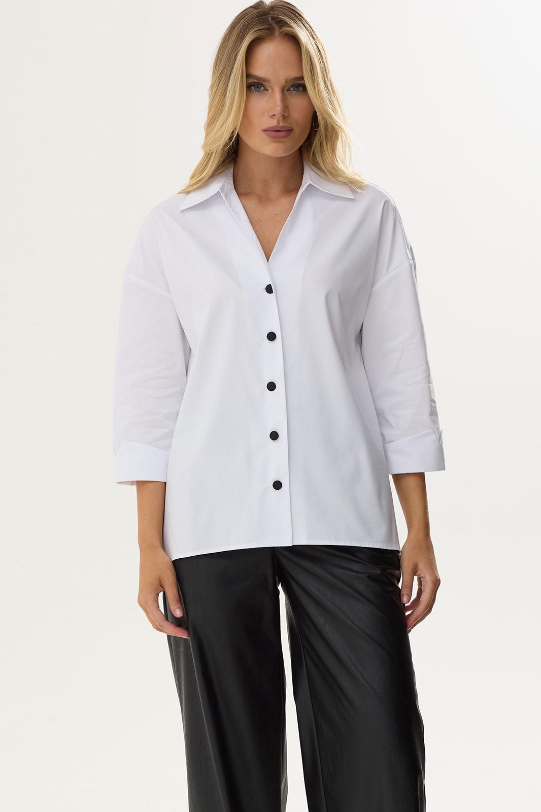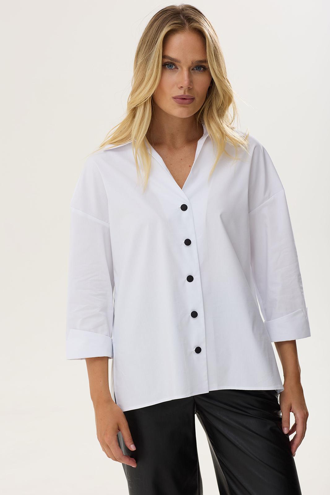 Стильная блузка прямого силуэта из хлопковой ткани с удлиненной спинкой. Воротник отложной на стойке с застежкой на петли и пуговицы. На спинке фигурный вырез с декоративной фурнитурой. На спинке кокетка со складками. В боковых швах разрезы. Обращаем ваше внимание, что фурнитура может незначительно отличаться от фото. Длина изделия: (44-48р -65см)(50-54р – 68см)(56-60р - 71см)