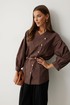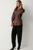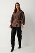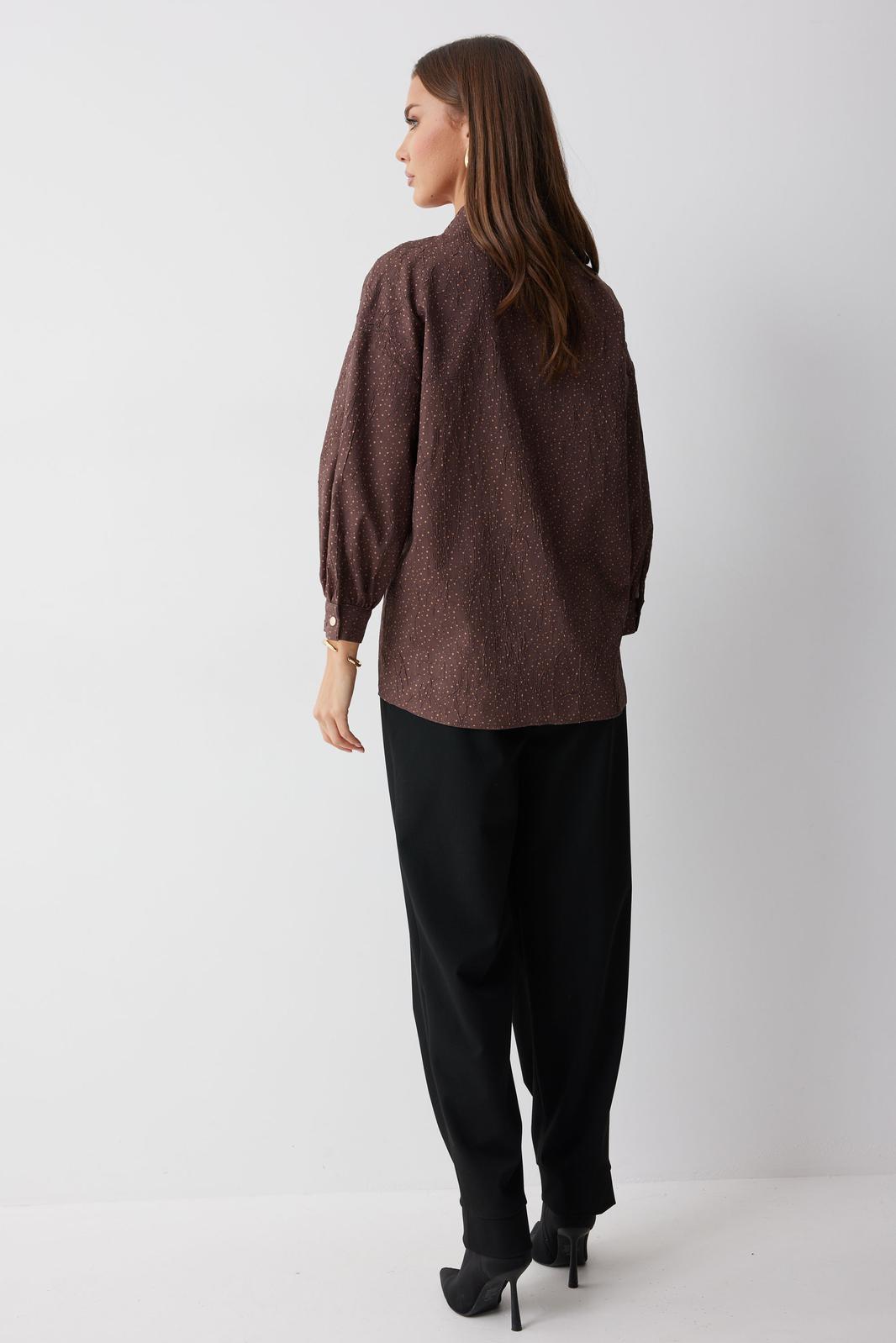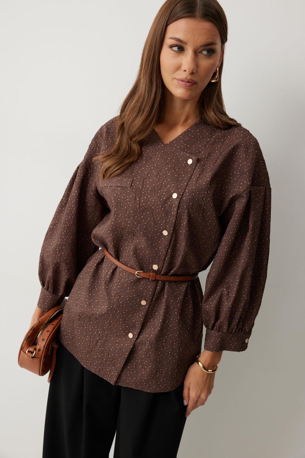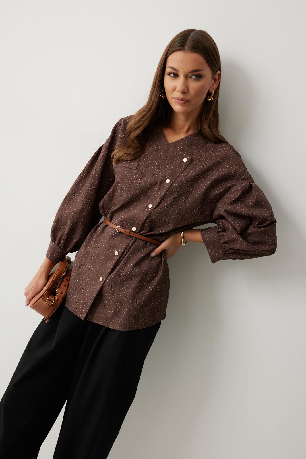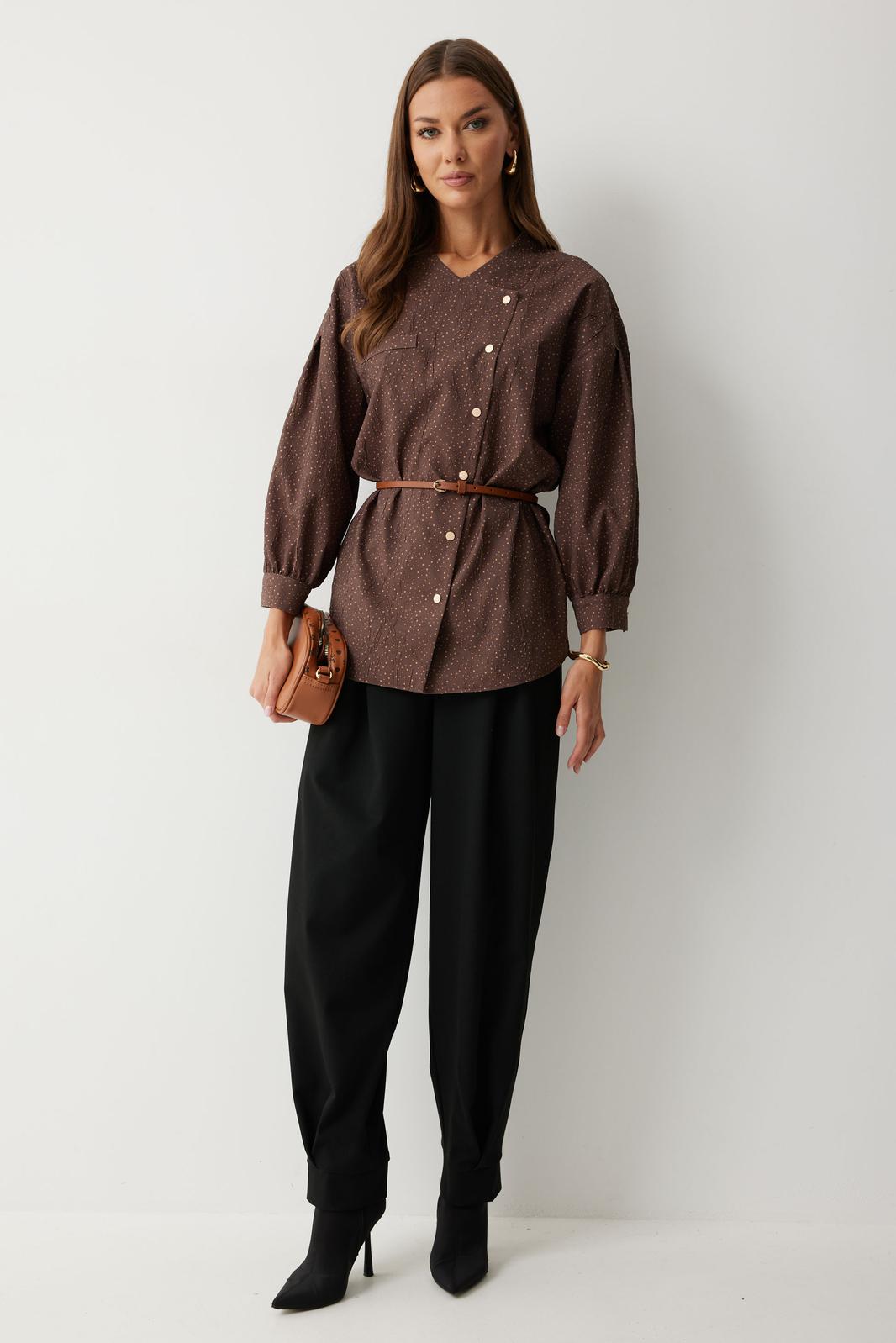 Ассиметричная блузка прямого силуэта. Низ фигурный. Рукав, спущенный с встречной складкой по центру. По низу манжета с застежкой на кнопку. По переду декоративная настрочная листочка. Ассиметричная двубортная застежка на кнопки. Воротник-стойка. Обращаем ваше внимание, что фурнитура может незначительно отличаться от фото.