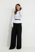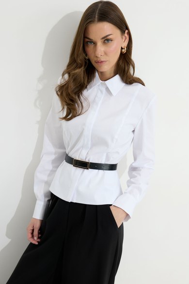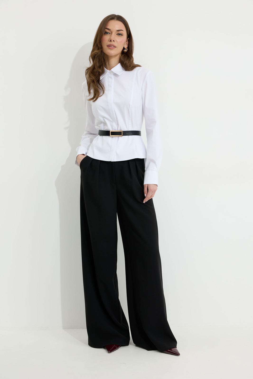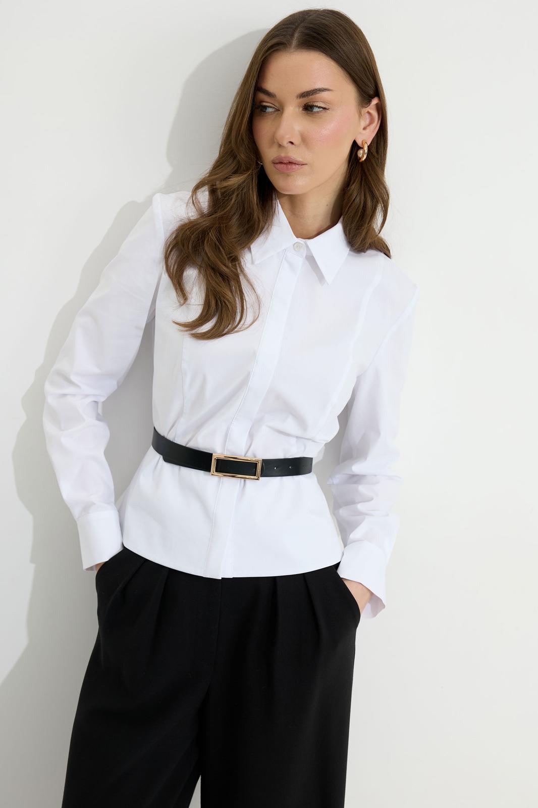 Блузка из хлопковой ткани со стрейчем. Прилегающего силуэта, отрезная по линии талии, с баской. Горловина овальной формы, с отложным воротником на отрезной стойке, стойка с застежкой на петлю и пуговицу. По переду отрезная супатная застежка на петли-пуговицы. По переду и спинке рельефы от плечевого шва до нижнего среза. Рукав длинный, втачной; с отрезной манжетой, с застежкой на петлю и пуговицу. Баска обтачная, по спинке фигурной формы. Обращаем Ваше внимание, что фурнитура может незначительно отличаться от фото.
