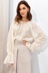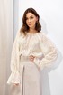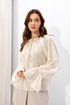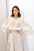 Блузка прямого силуэта из полупрозрачной блузочной ткани. Горловина округлая со сборкой, на спинке разрез “капля” с застежкой на петлю и пуговицу. Рукав покроя реглан удлиненный, по низу манжета.