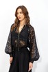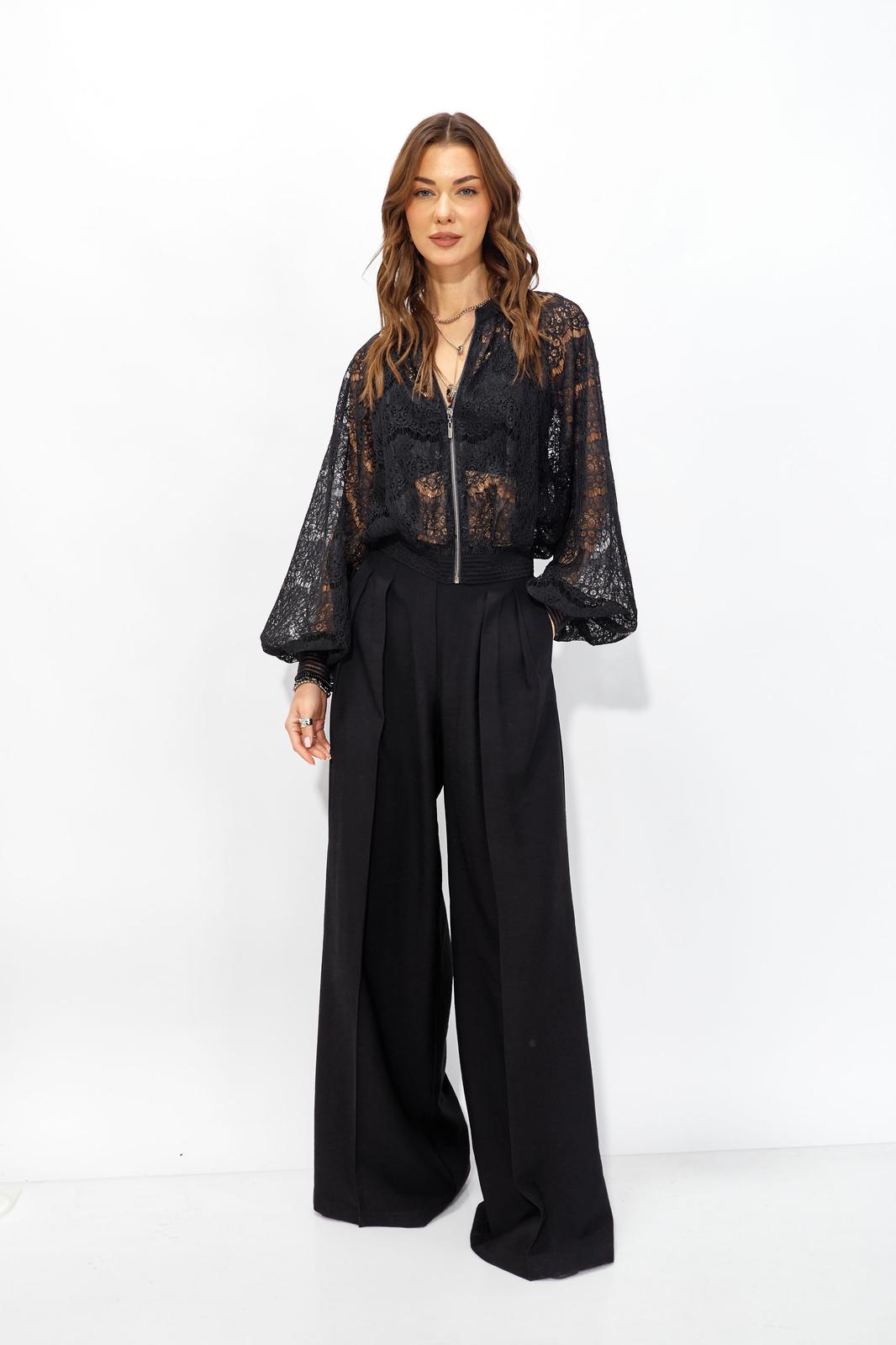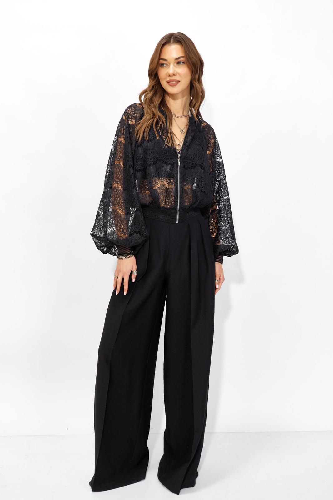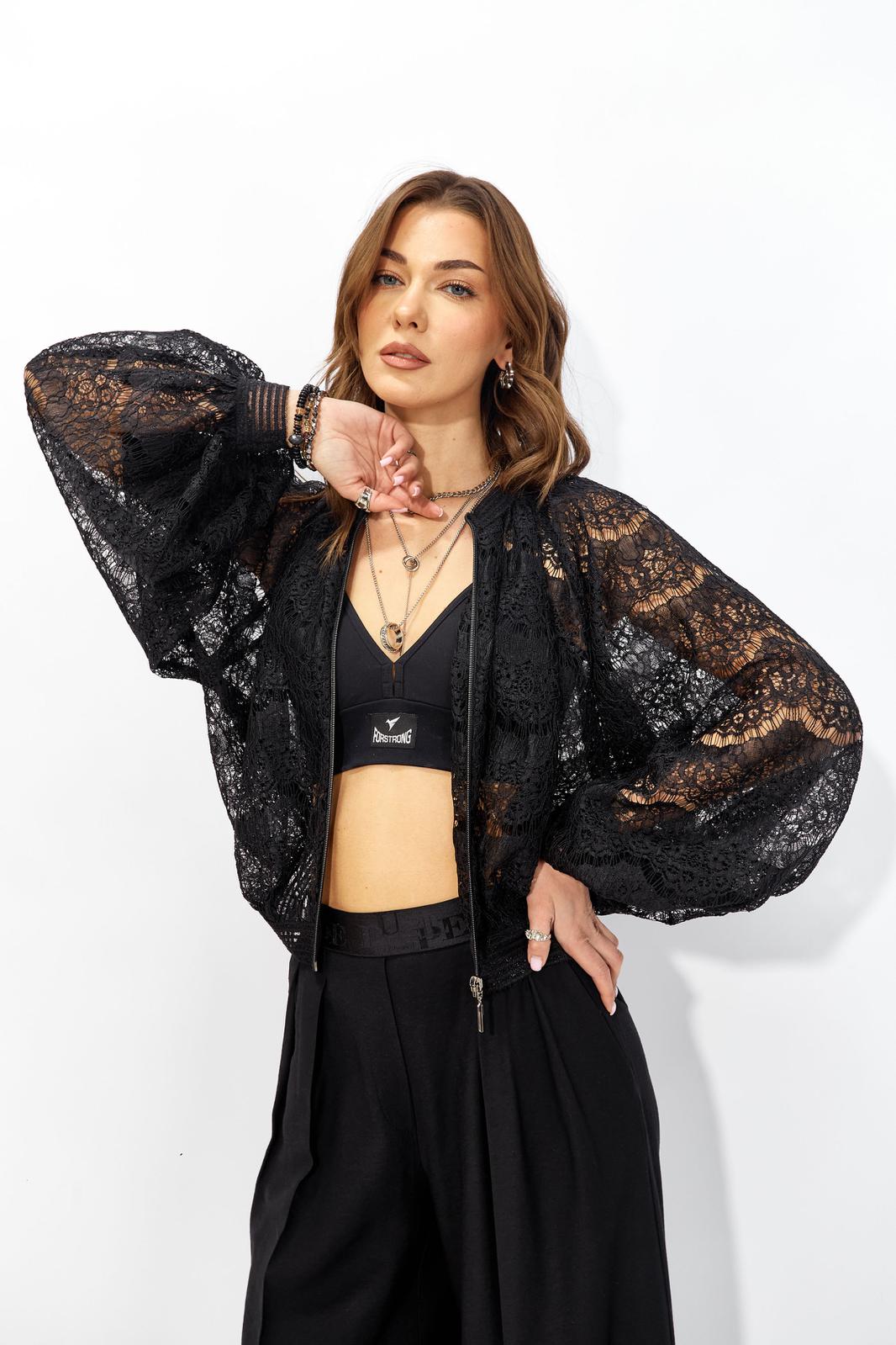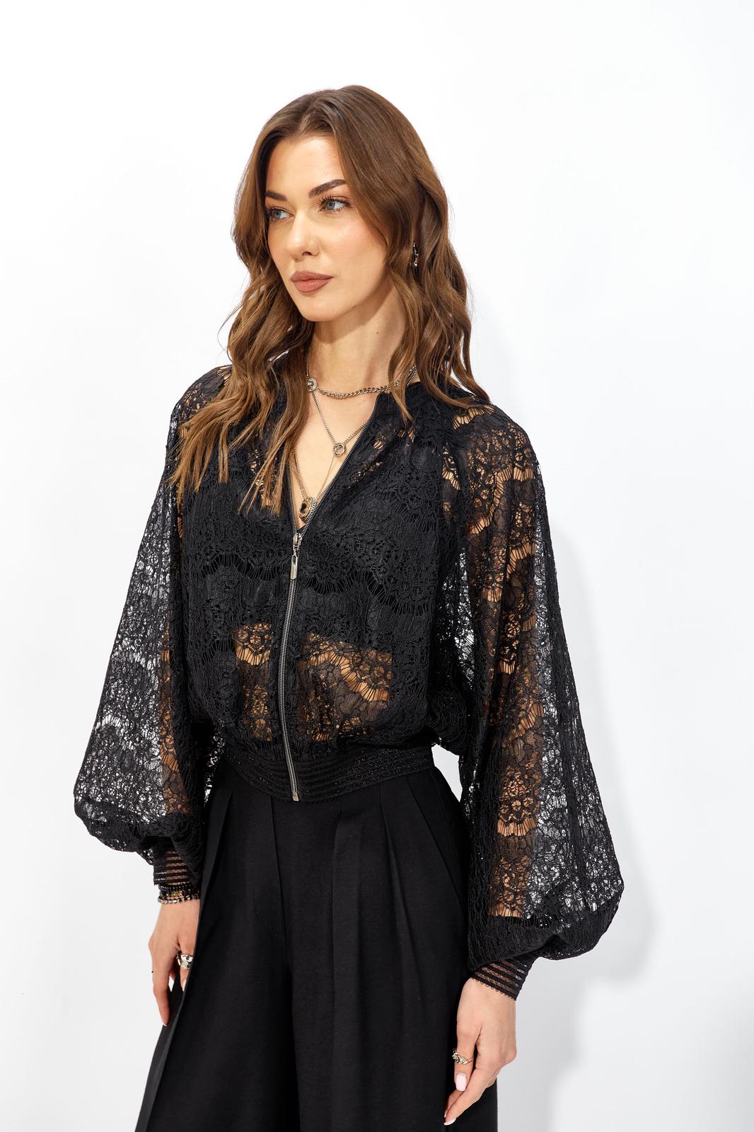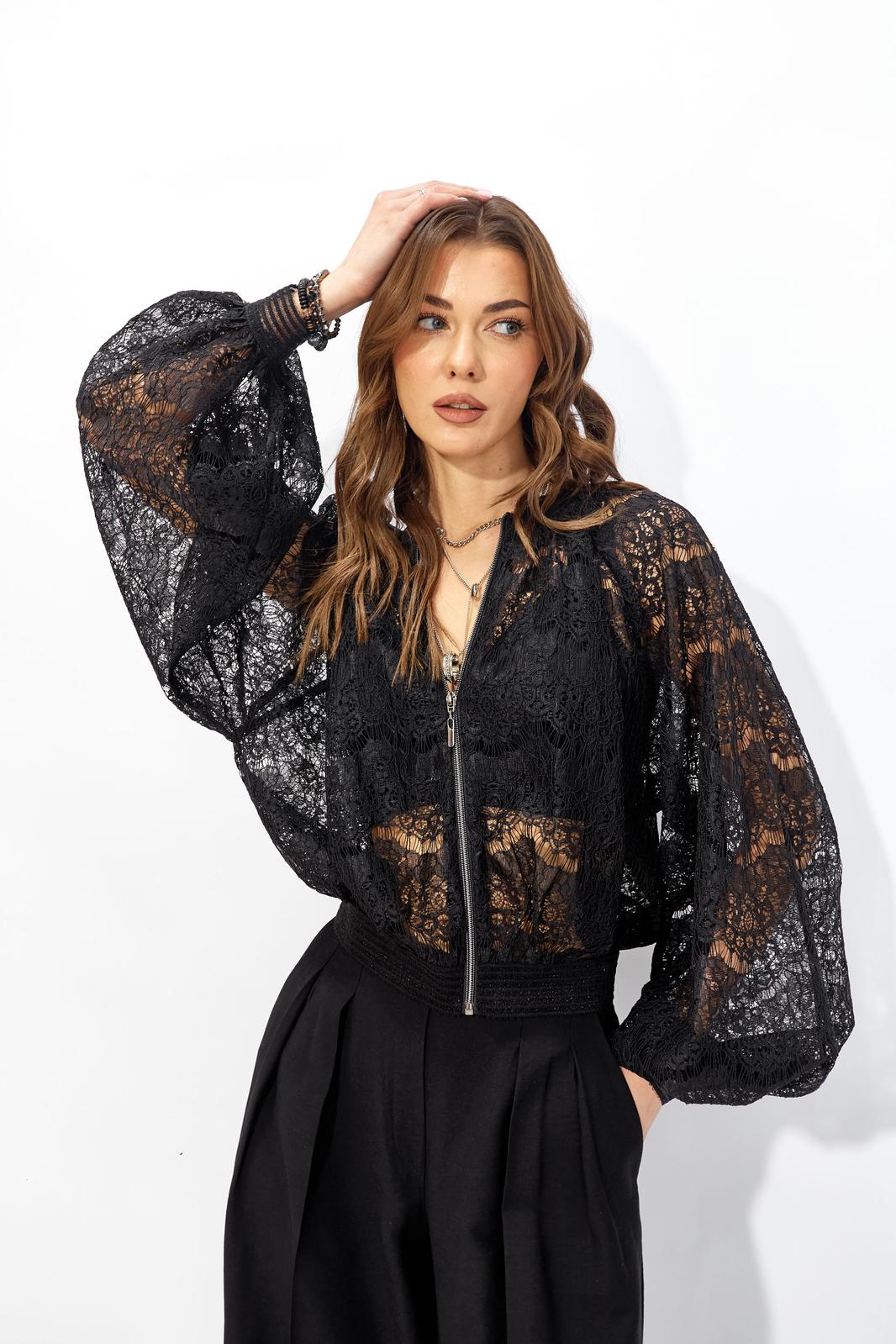 Жакет прямого силуэта из кружева. Горловина обработана декоративной резинкой, по центру застежка на молнию. Рукав со спущенной линией плеча, по низу декоративная резинка. По низу жакета притачная резинка. Обращаем ваше внимание, что фурнитура может отличаться от фото.