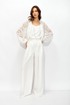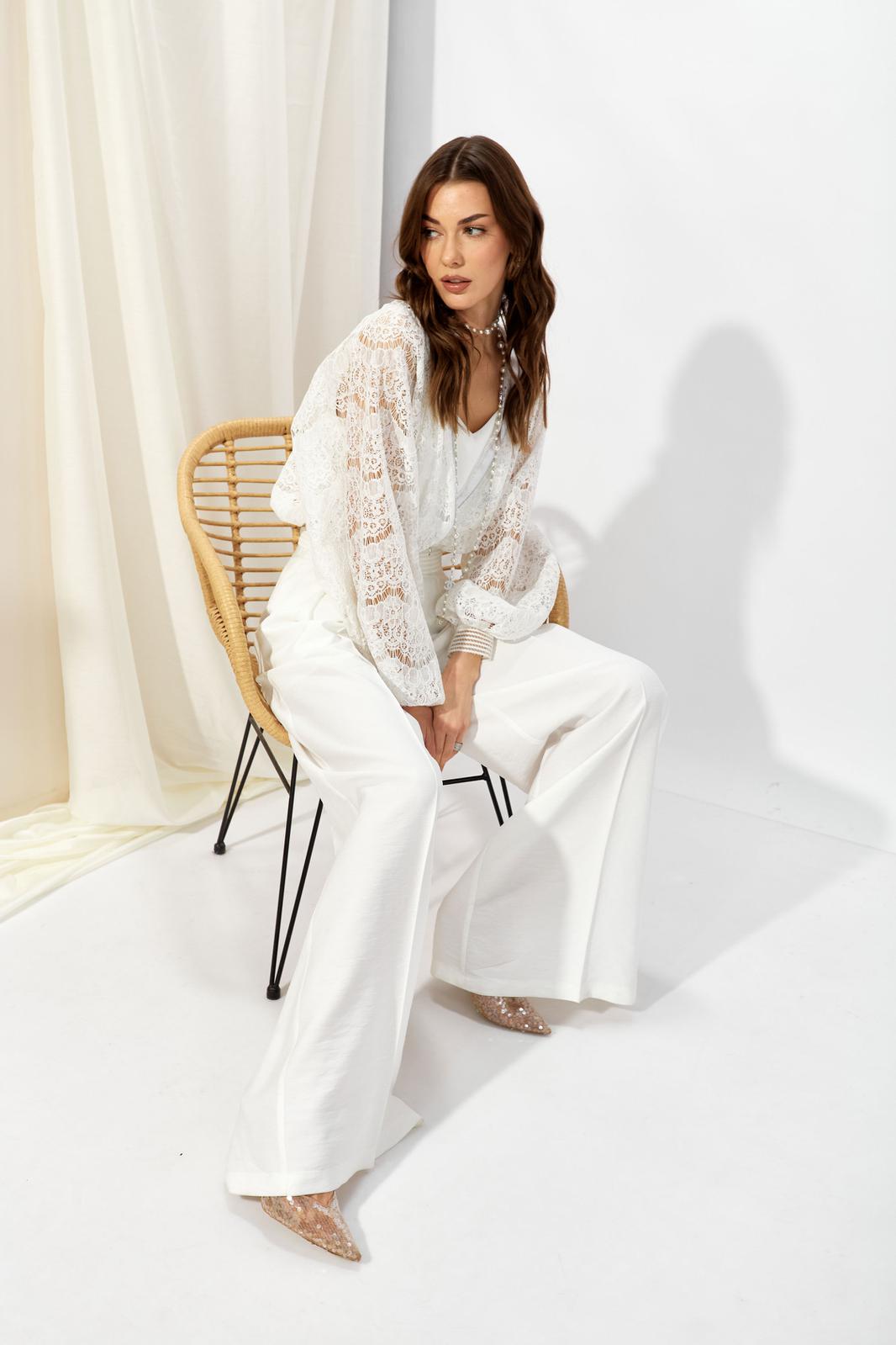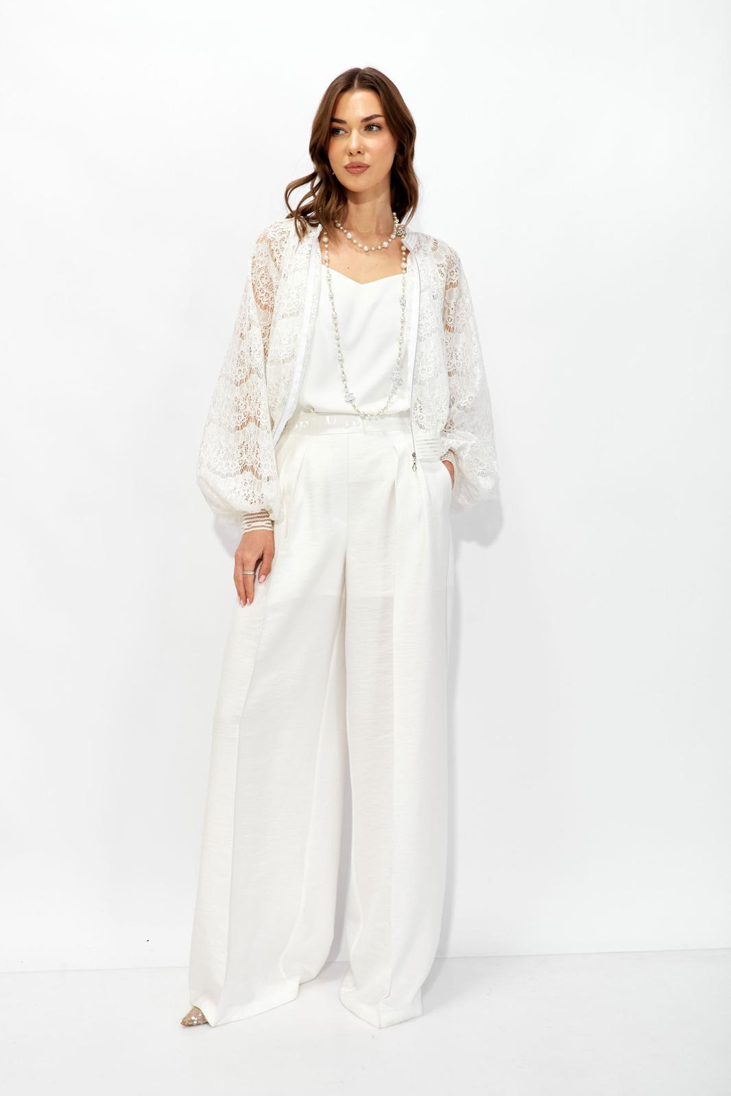Жакет прямого силуэта из кружева. Горловина обработана декоративной резинкой, по центру застежка на молнию. Рукав со спущенной линией плеча, по низу декоративная резинка. По низу жакета притачная резинка. Обращаем ваше внимание, что фурнитура может отличаться от фото.