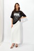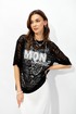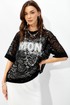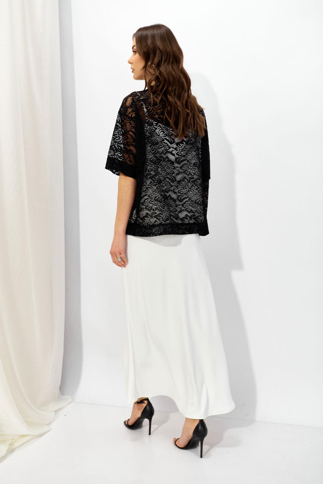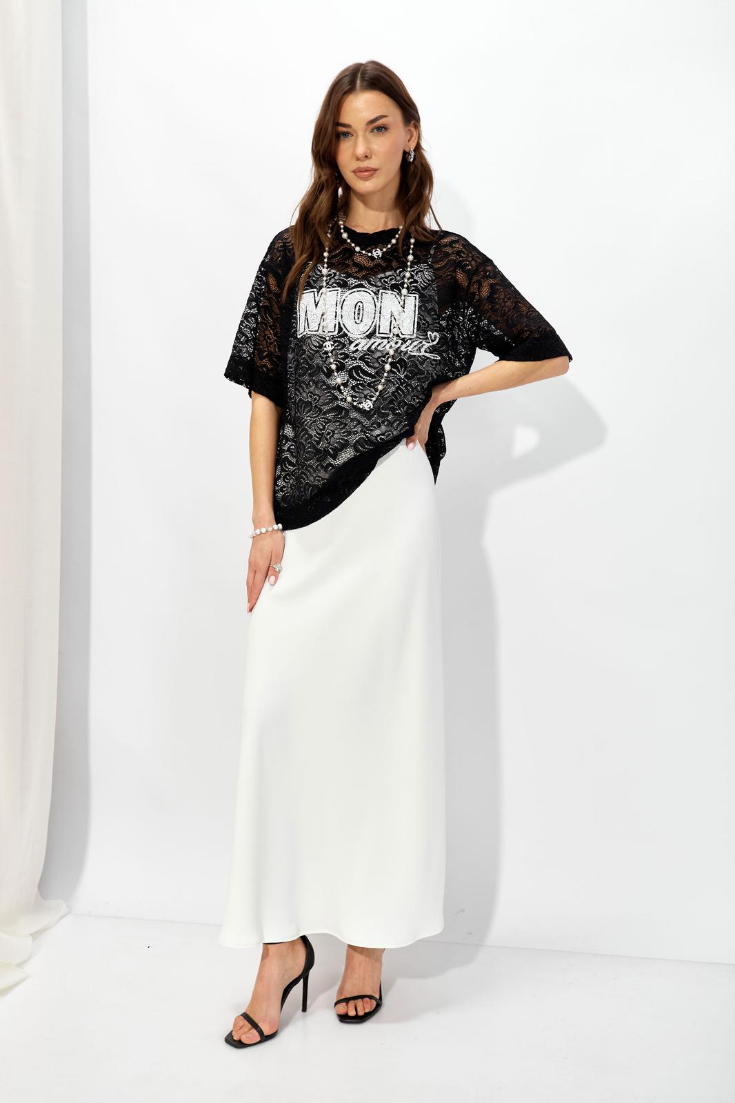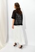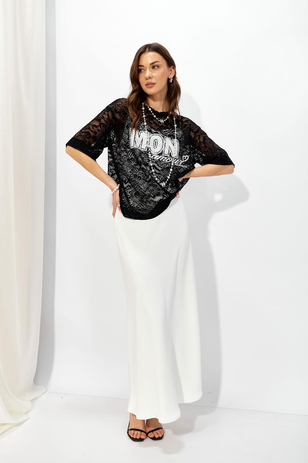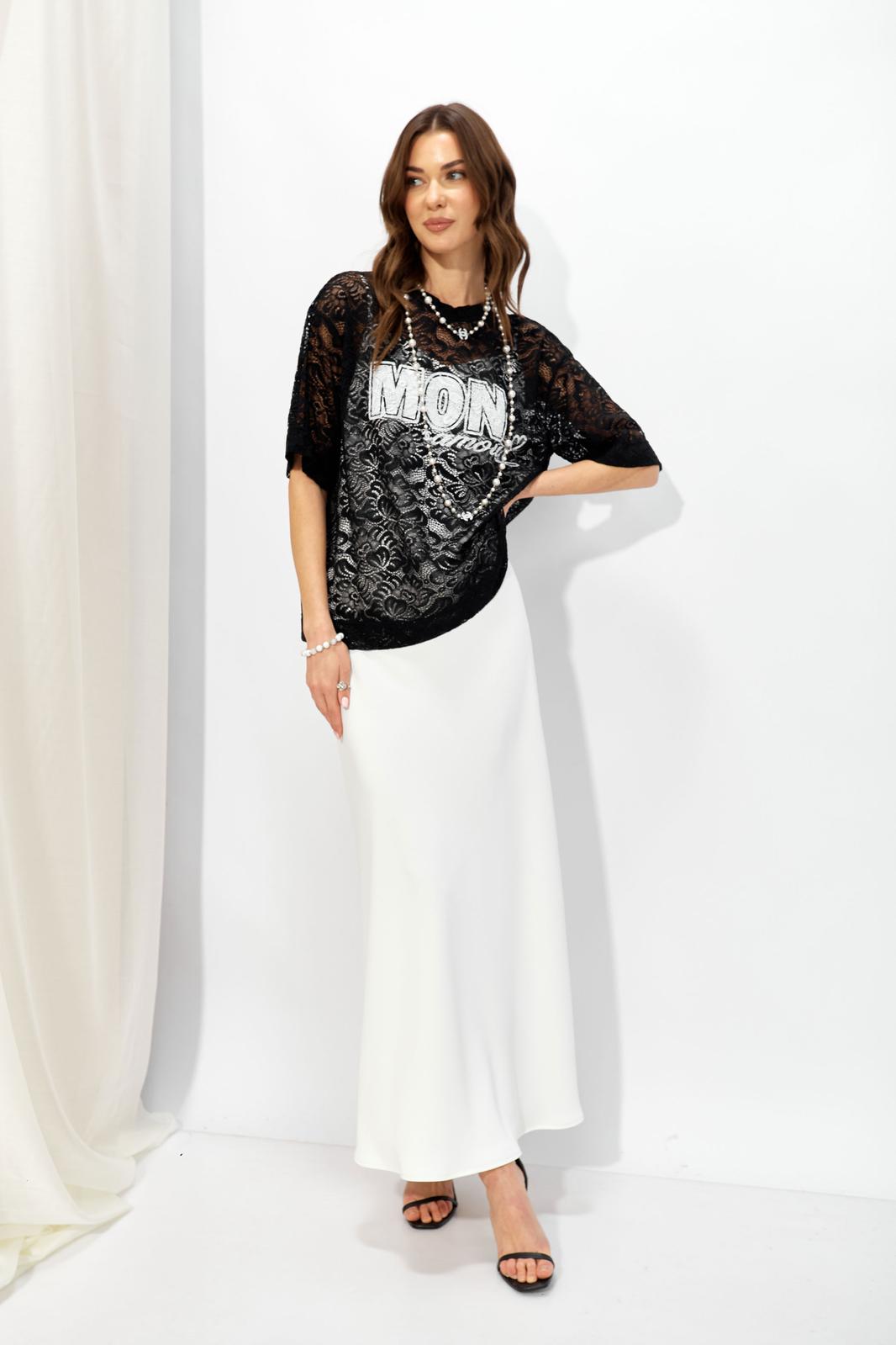 Оригинальный джемпер из эластичного кружева прямого силуэта, вырез горловины округлый, обработан притачной планкой. По переду выполнена дизайнерская печать контрастного цвета.