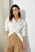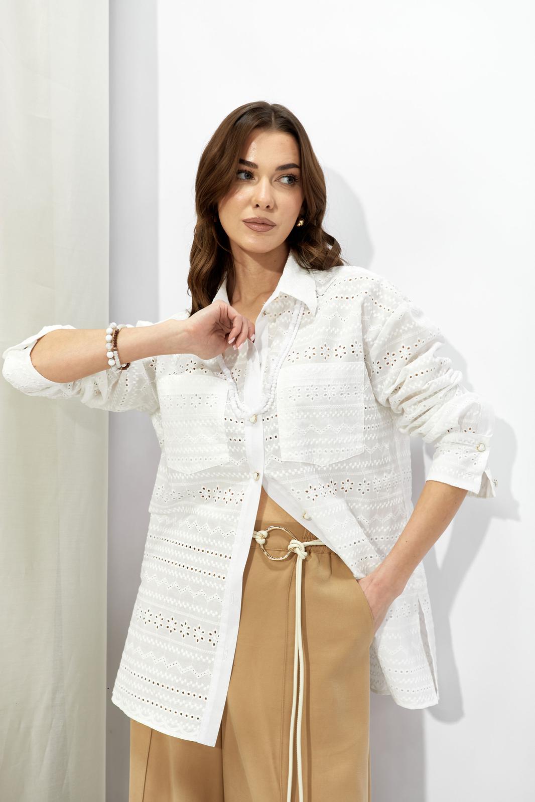 Блузка прямого силуэта из ришелье. Воротник рубашечного типа с центральной застежкой на петли и пуговицы. Рукав втачной длинный, по низу манжета на петли и пуговицы. По переду нагрудные карманы. На спинке кокетка и складки. По низу блузки в боковых швах разрезы. Обращаем ваше внимание, что фурнитура может отличаться от фото.