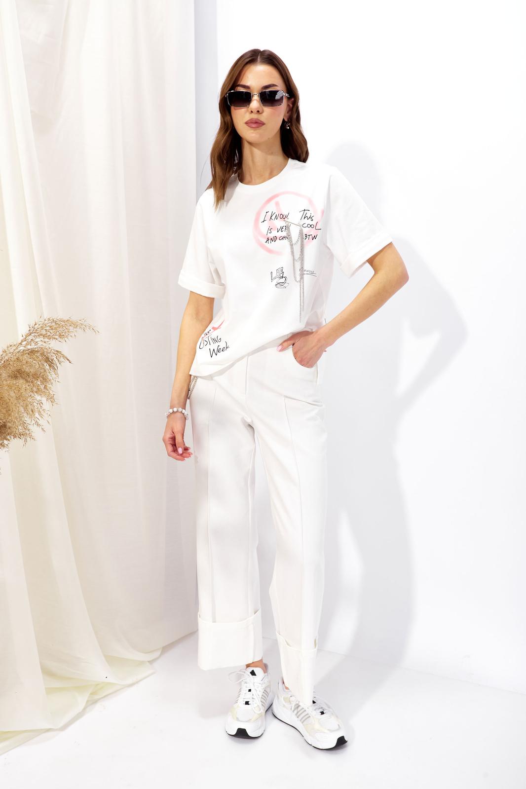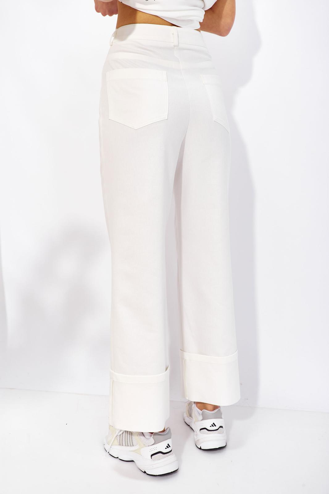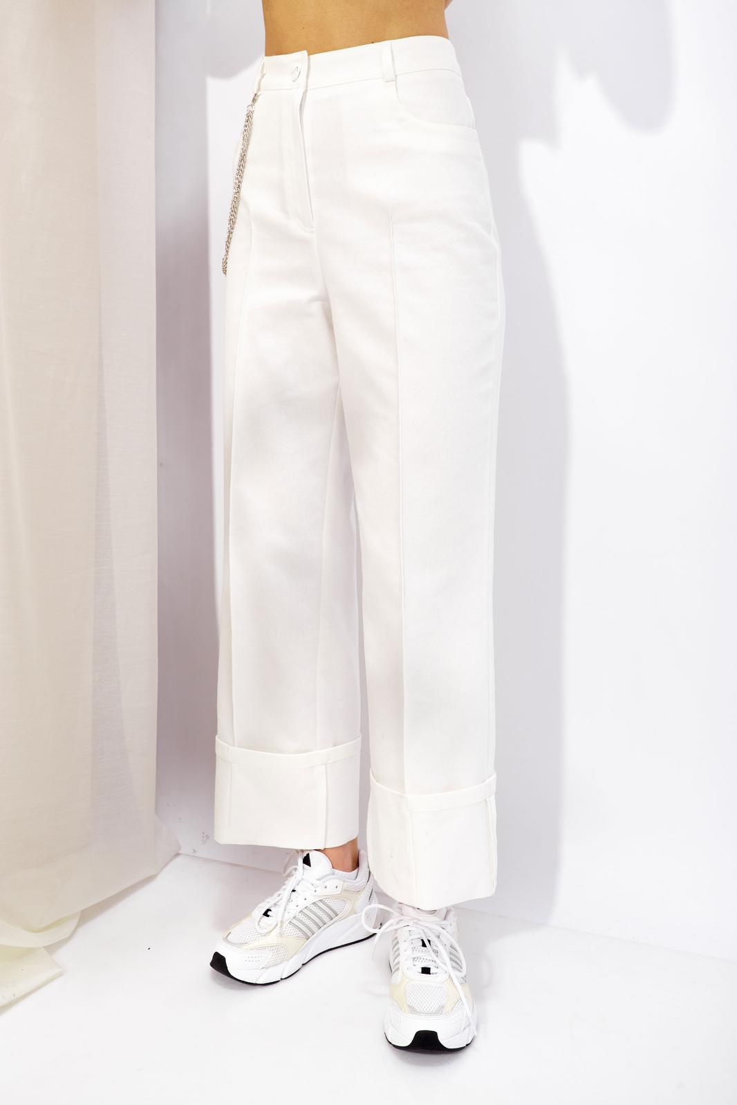 Брюки прямого силуэта из джинсовой ткани. По верху брюк притачной пояс со шлевками для ремня. На передних половинках обработаны карманы, декоративные защипы и застежка молния в среднем шве, на задних –кокетка и карманы. По поясу задних половинок брюк эластичная тесьма (резинка). Обращаем ваше внимание, что фурнитура может отличаться от фото. Декоративный элемент - цепочка в комплектацию не входит!