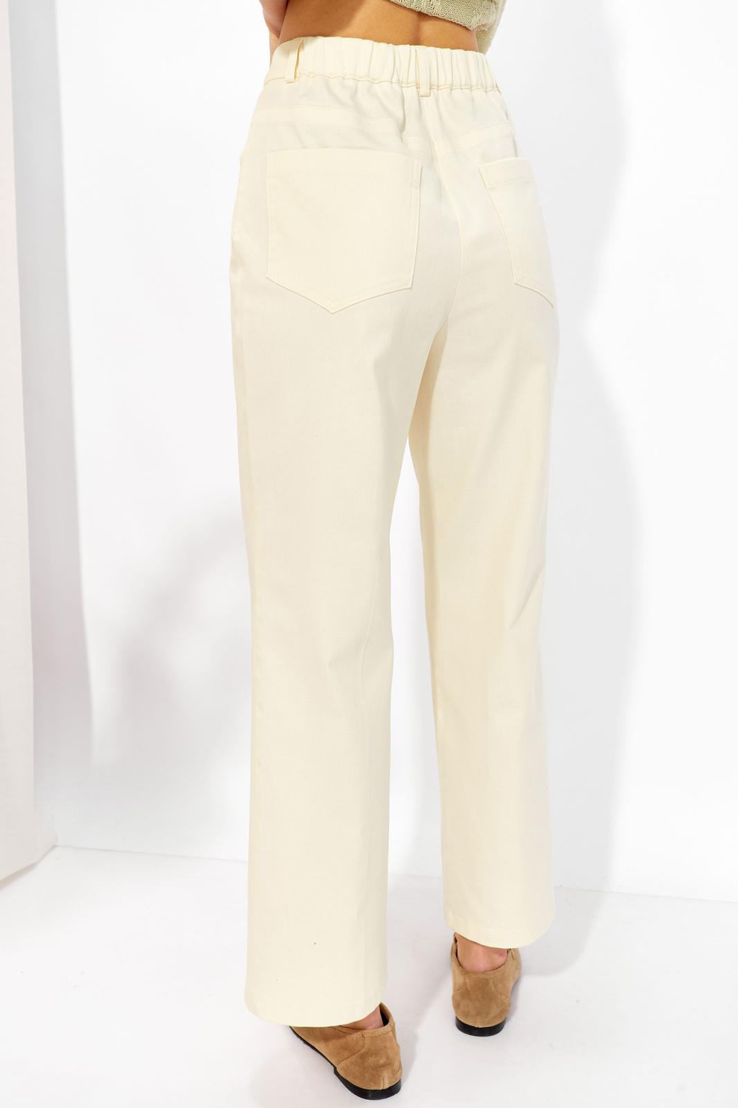 Брюки полуприлегающего силуэта из джинсовой ткани. По верху брюк притачной пояс со шлевками для ремня. На передних половинках обработаны карманы, декоративные защипы и застежка молния в среднем шве, на задних –кокетка и карманы. По поясу задних половинок брюк эластичная тесьма (резинка). Обращаем ваше внимание, что фурнитура может отличаться от фото.