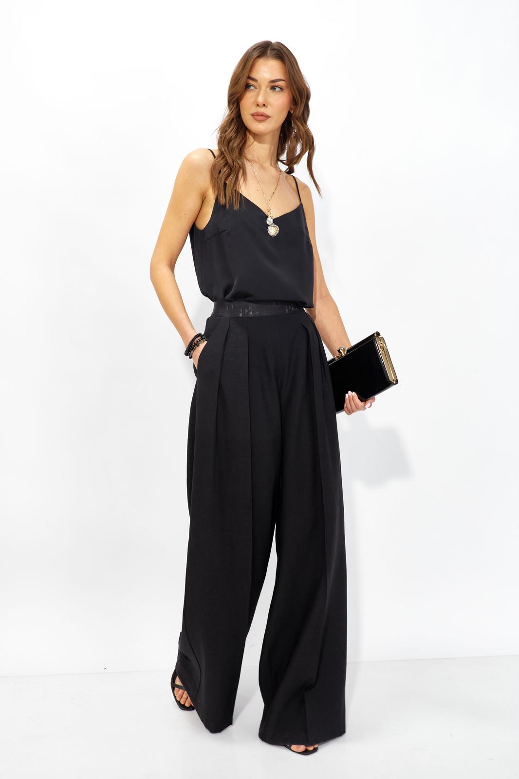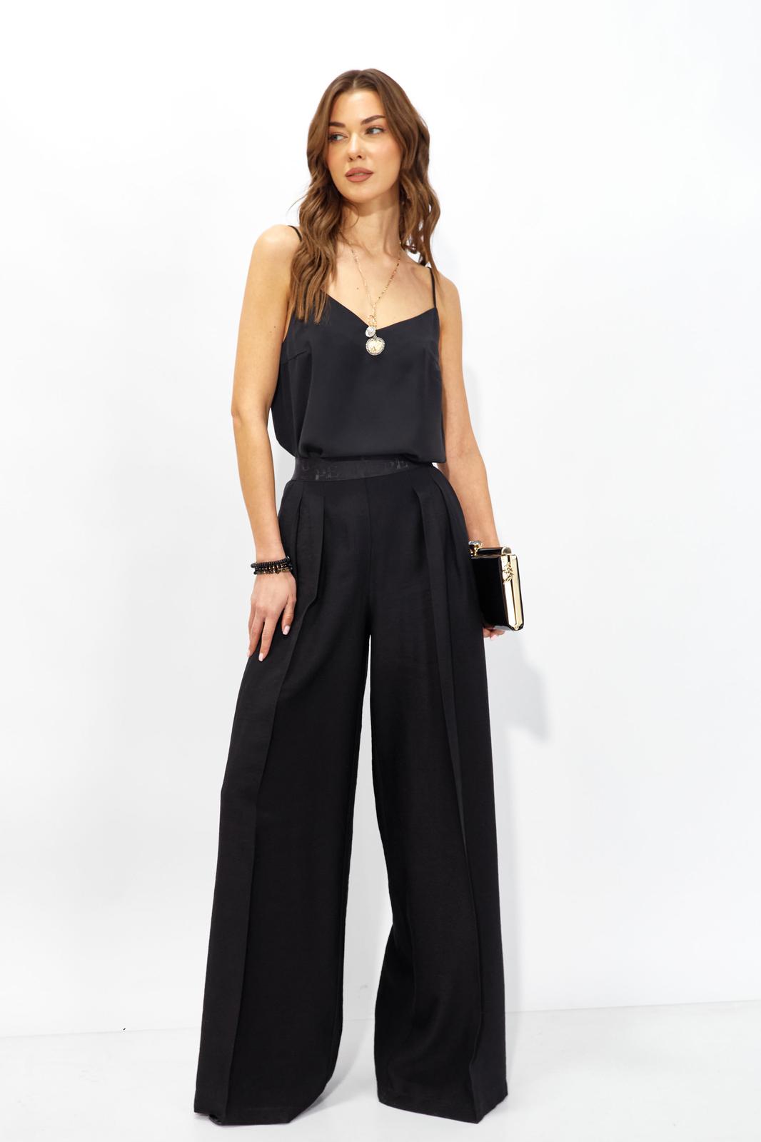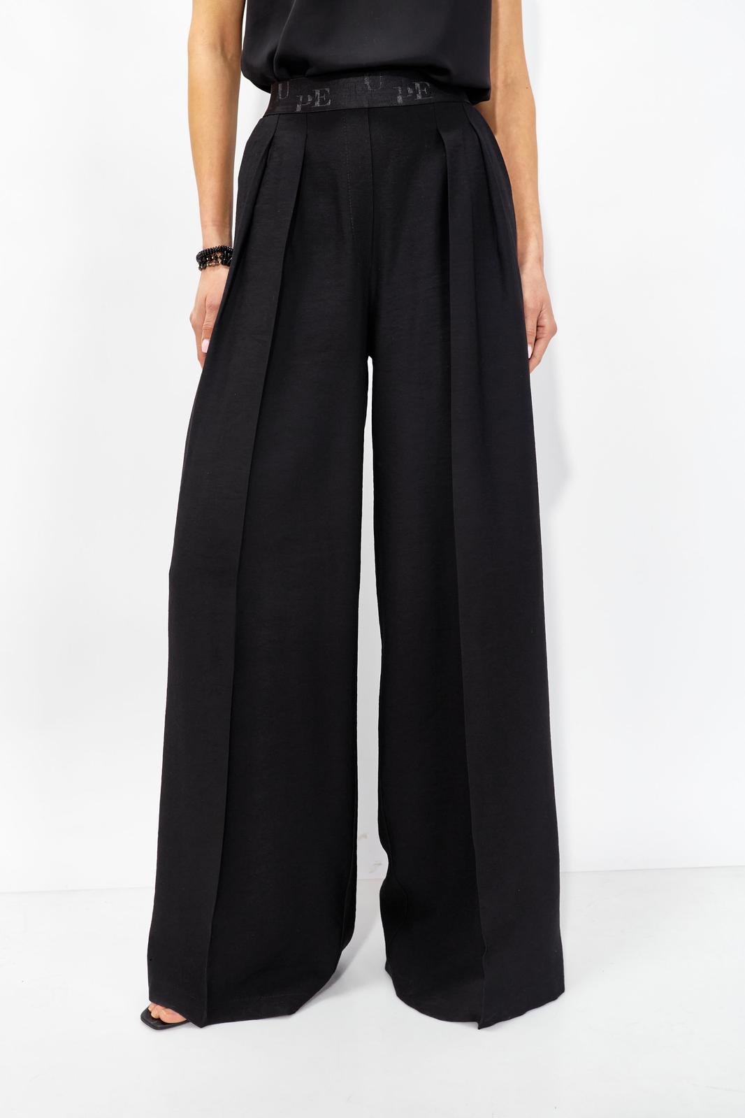 Брюки прямого силуэта из струящейся ткани. По верху брюк притачная декоративная резинка. По переду обработаны карманы в боковых швах и декоративные складки. На задних половинках брюк листочки. Обращаем ваше внимание, что фурнитура может отличаться от фото.