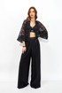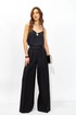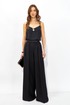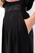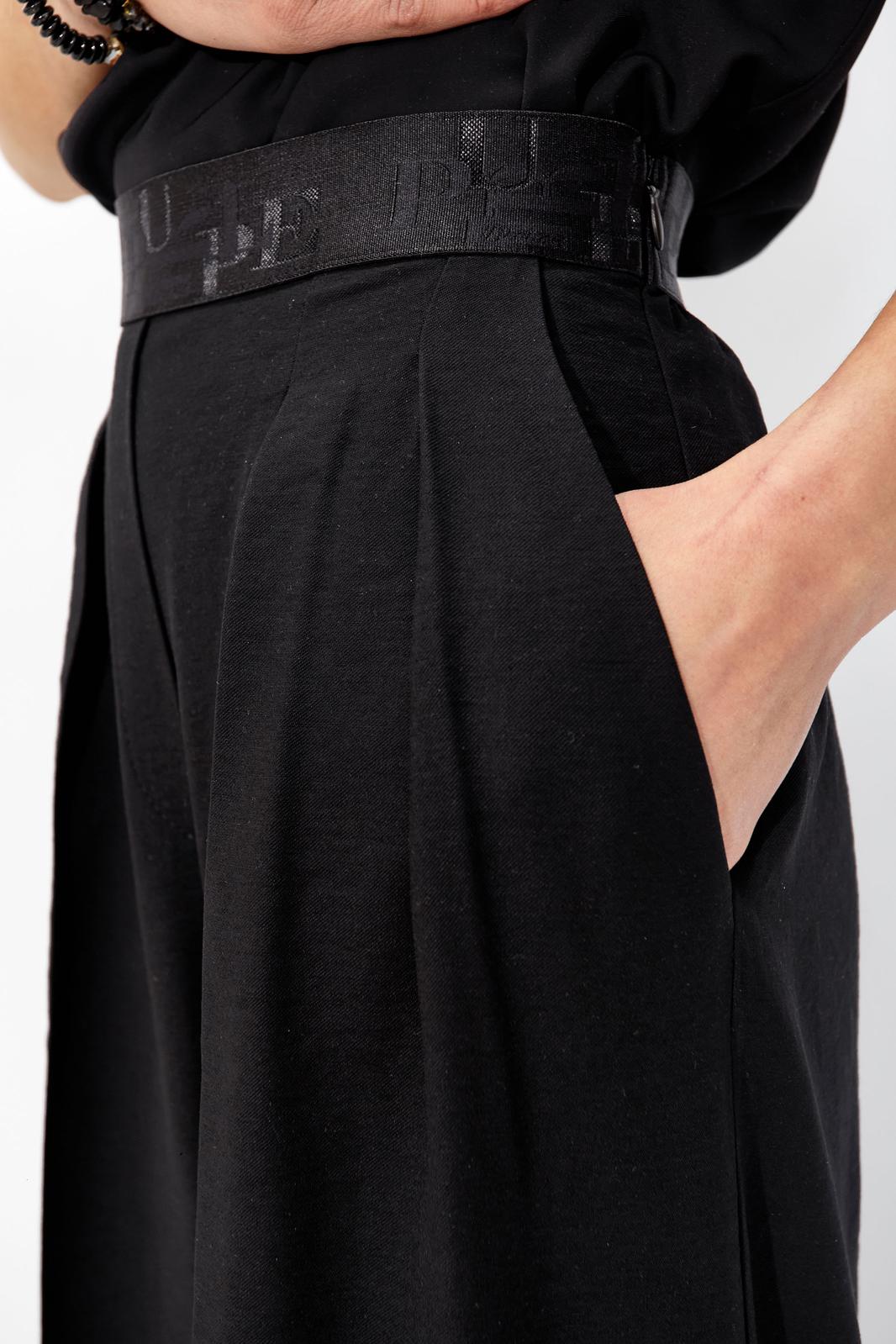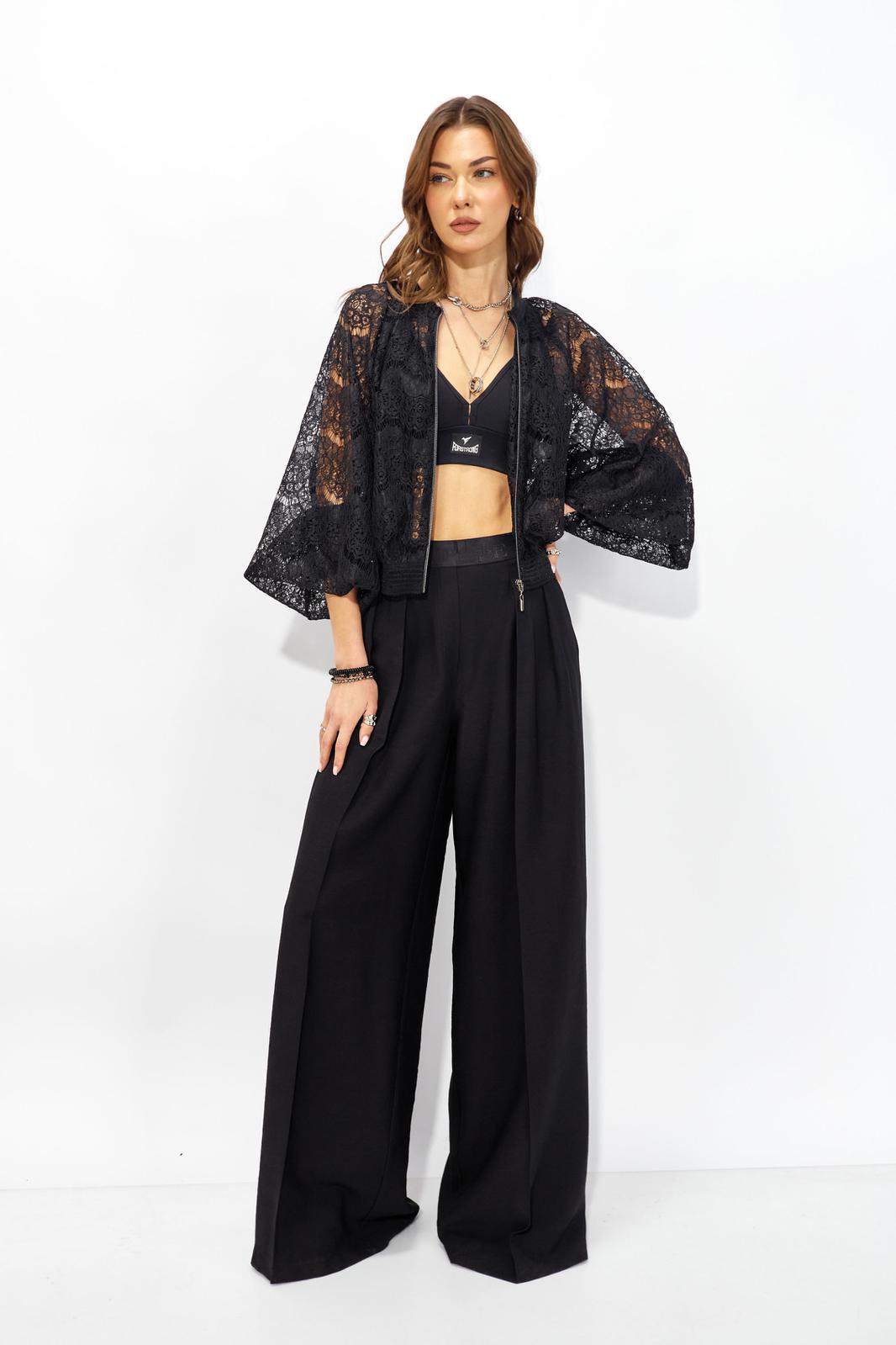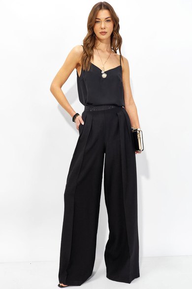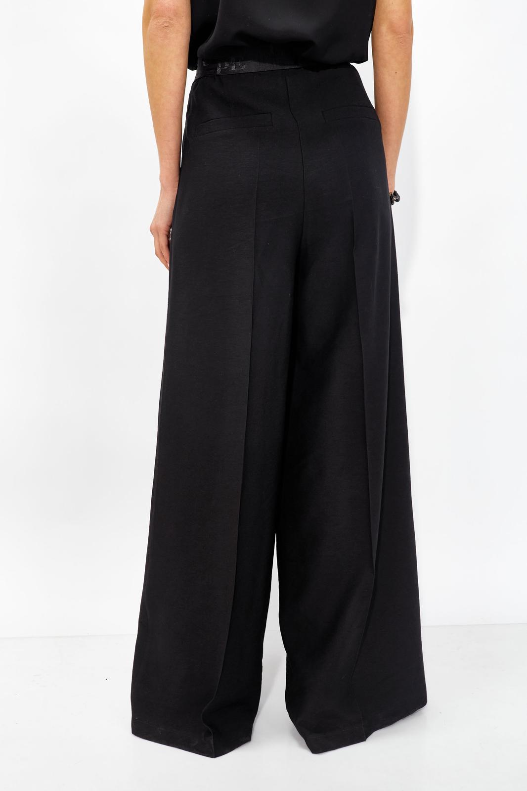 Брюки прямого силуэта из струящейся ткани. По верху брюк притачная декоративная резинка. По переду обработаны карманы в боковых швах и декоративные складки. На задних половинках брюк листочки. Обращаем ваше внимание, что фурнитура может отличаться от фото.