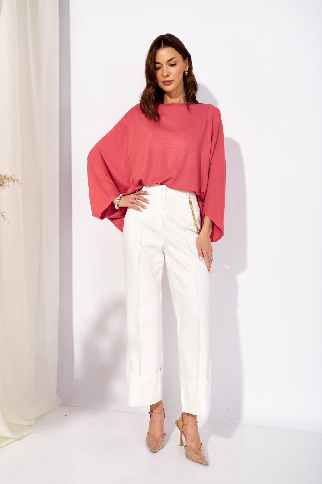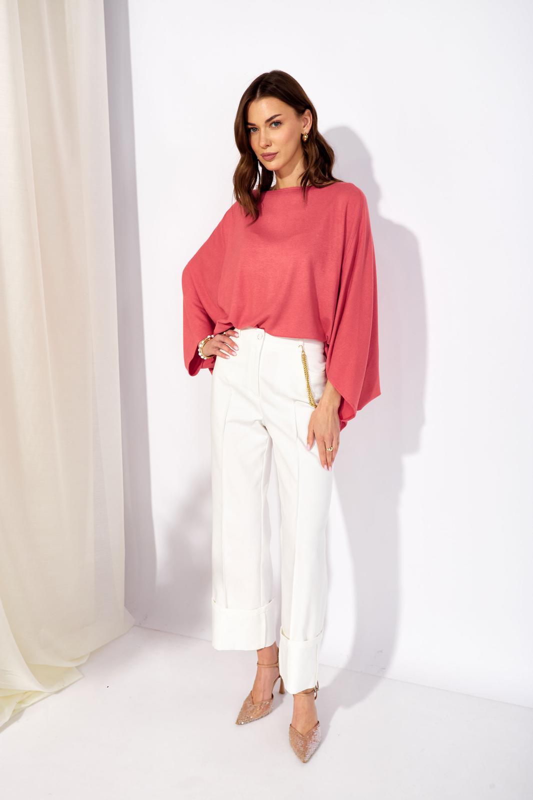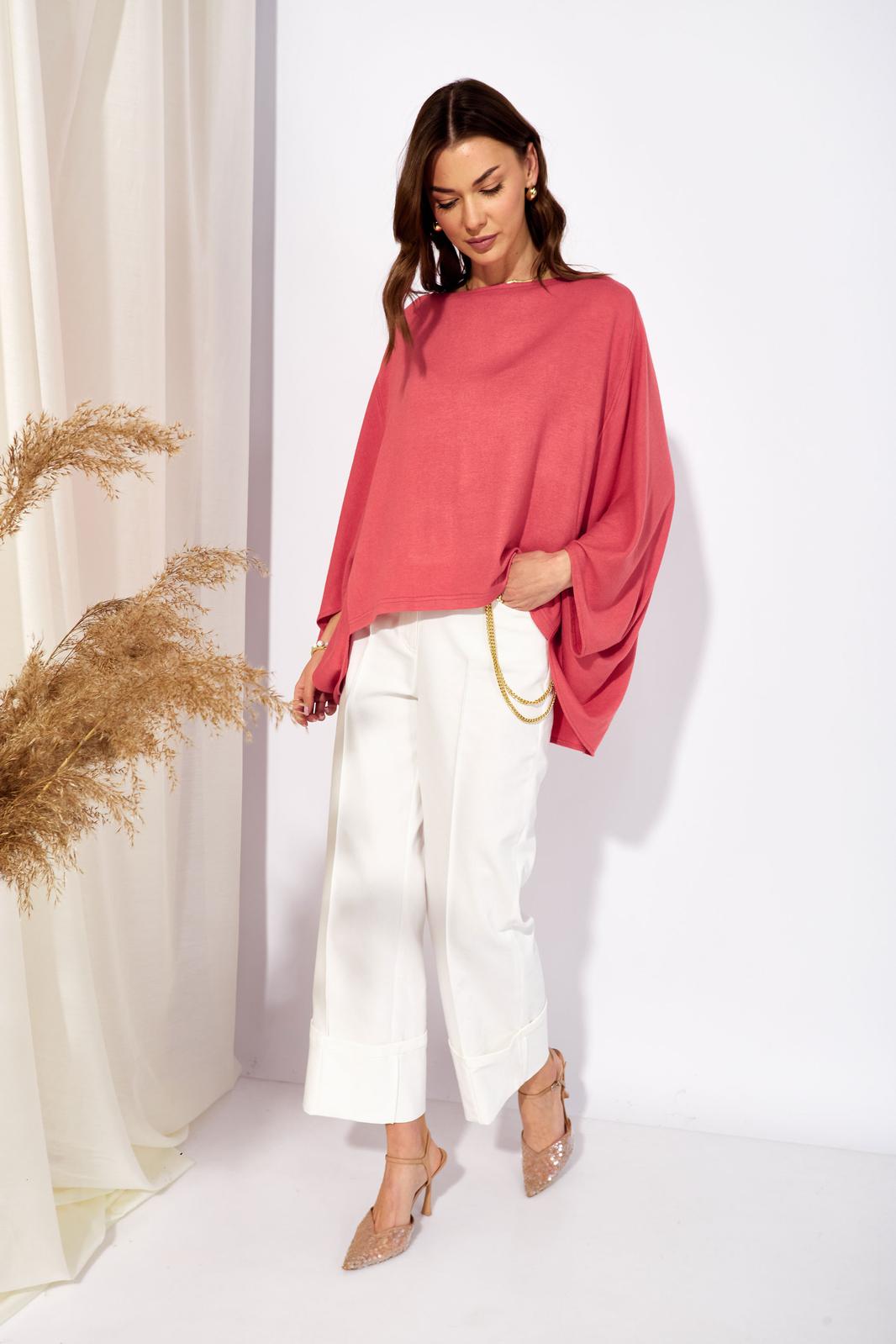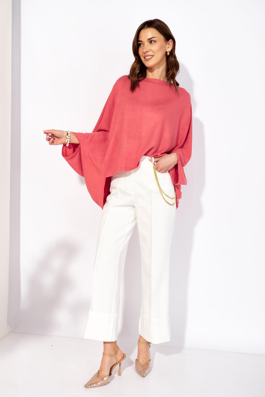 Джемпер свободного кроя из трикотажного полотна с фигурным низом. Горловина –лодочка. Рукав цельнокроеный.