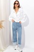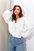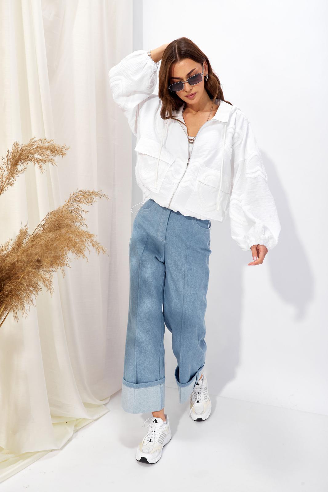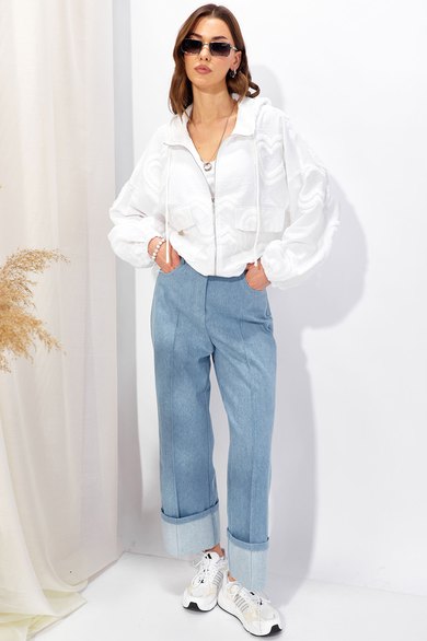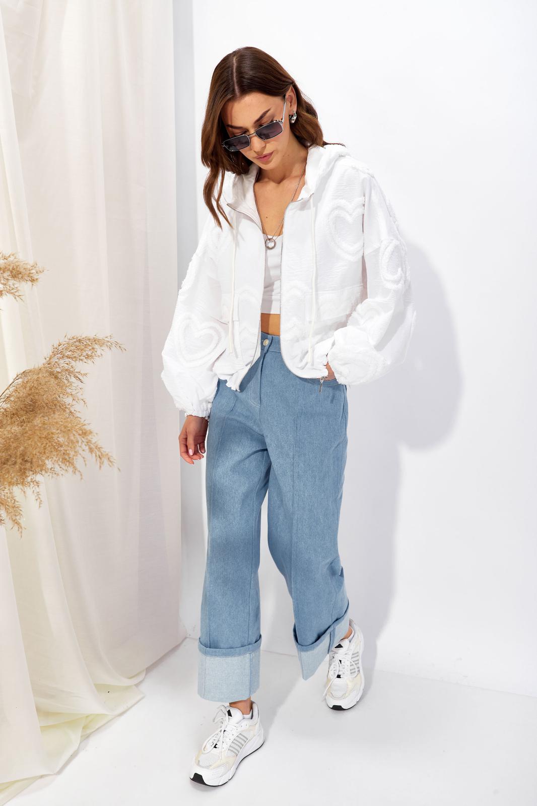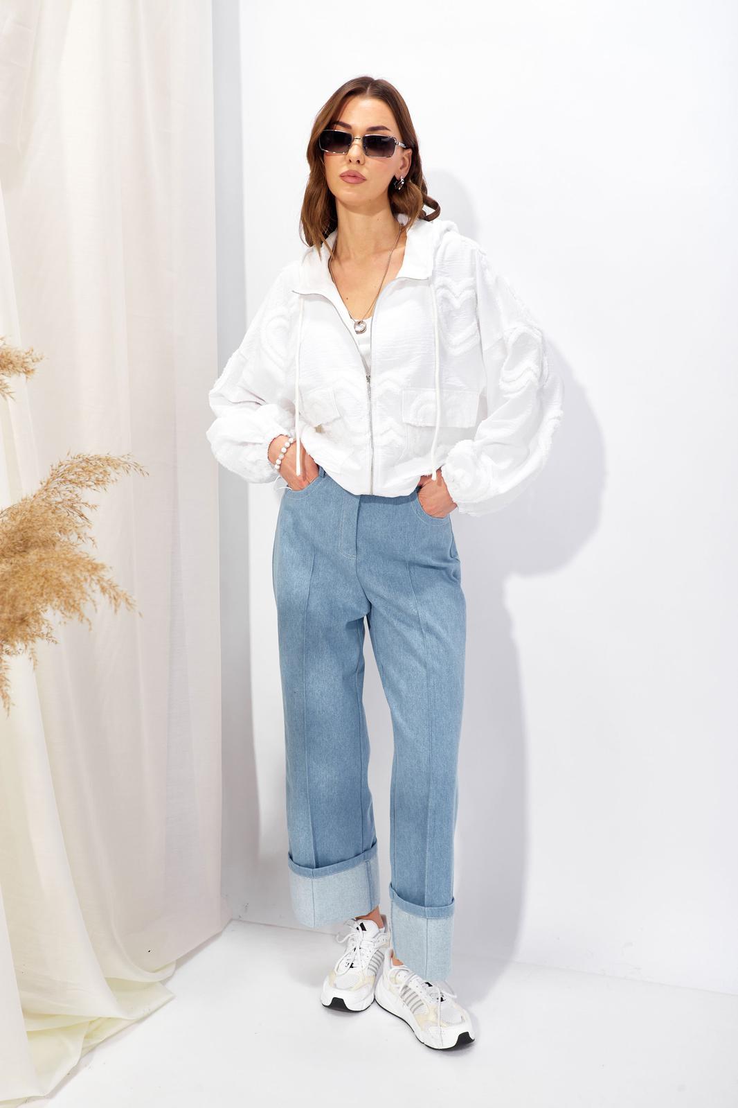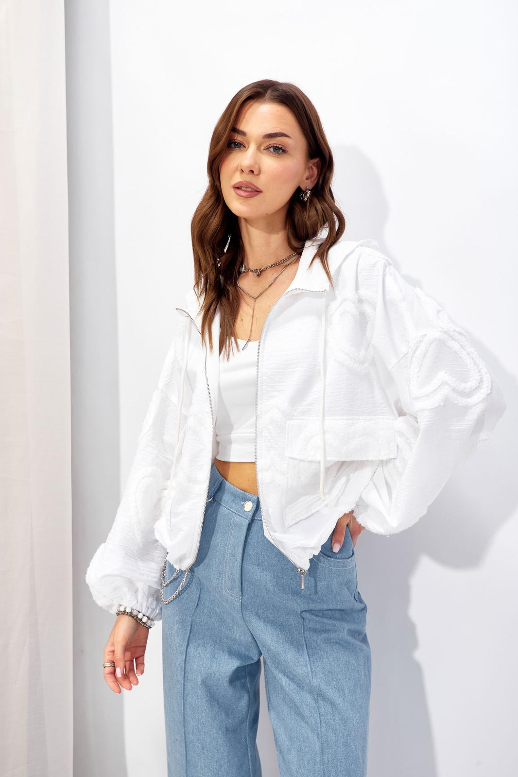 Жакет прямого силуэта из хлопковой ткани. Жакет с капюшоном на цельнокроенной стойке, с застежкой по центру на молнию. Рукав со спущенной линией плеча, по низу расширенный на резинке. По низу жакета резинка для регулирования степени прилегания. По переду накладные карманы с клапанами. Жакет частично на хлопковой подкладке.