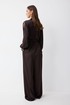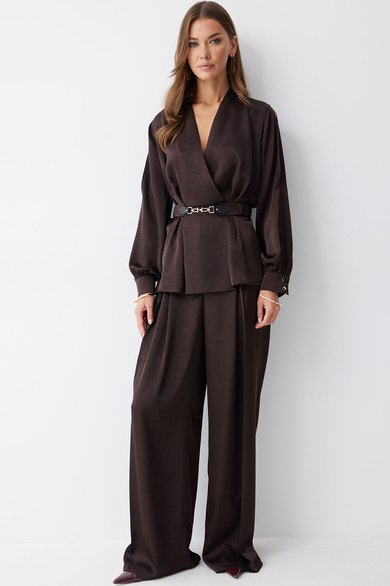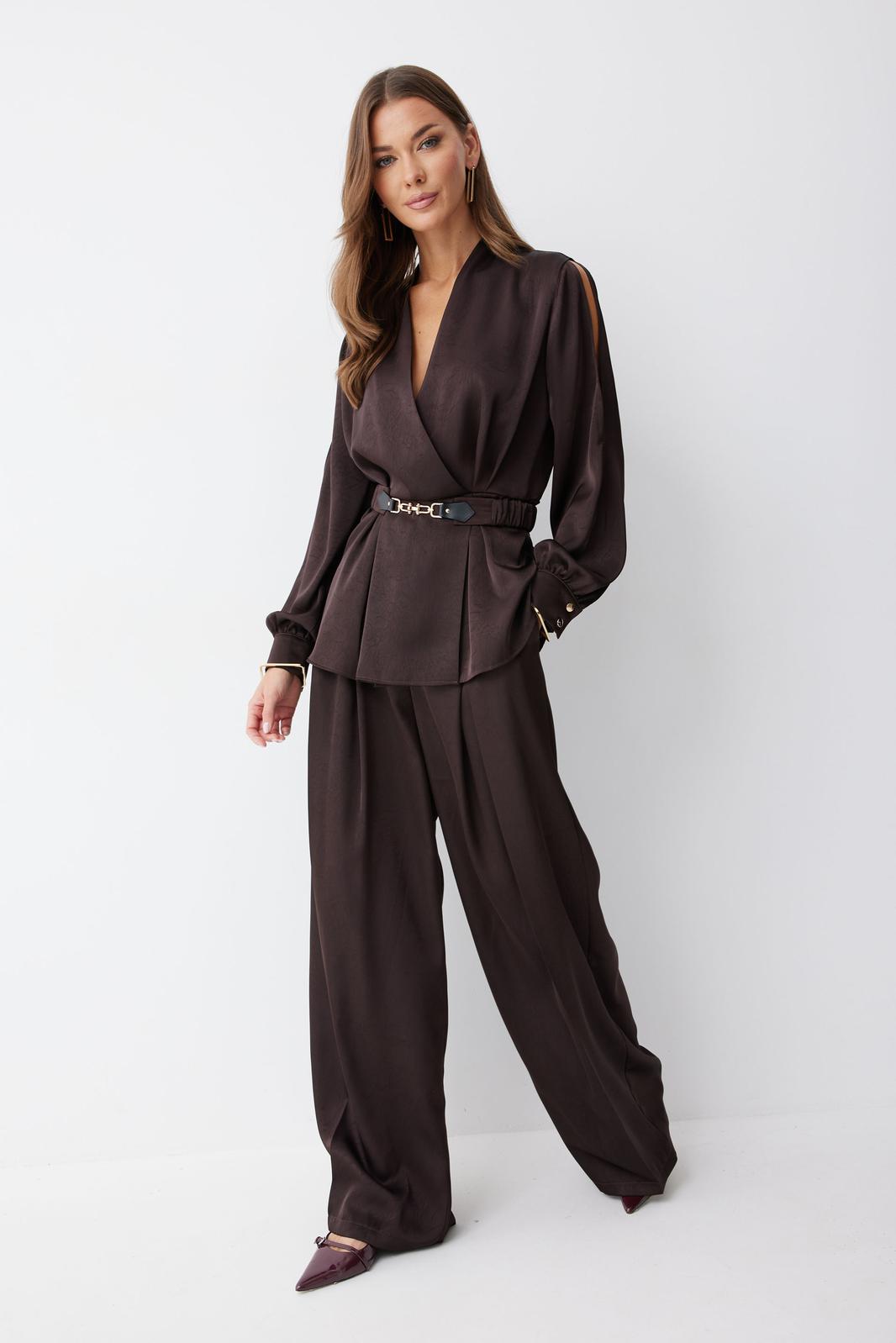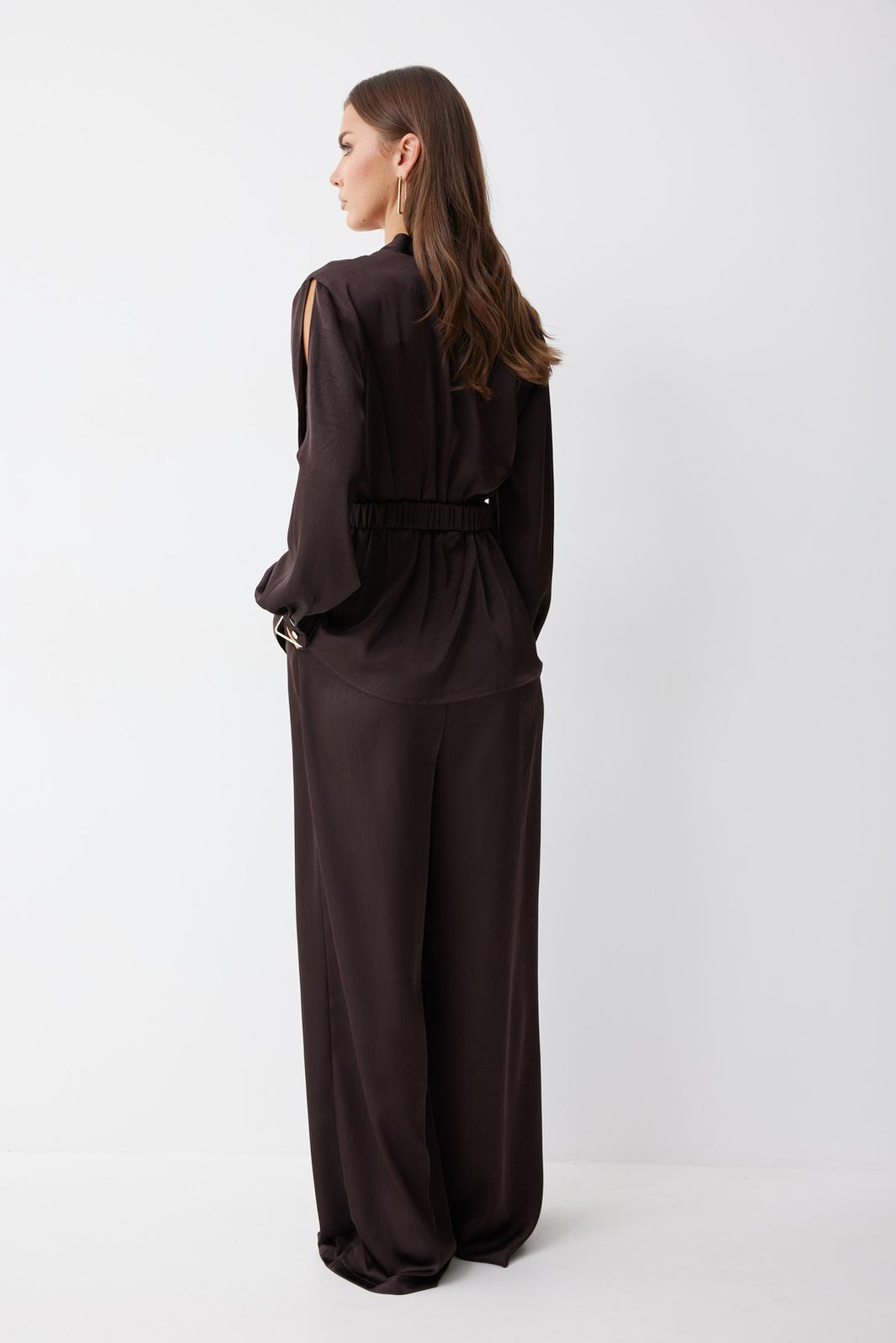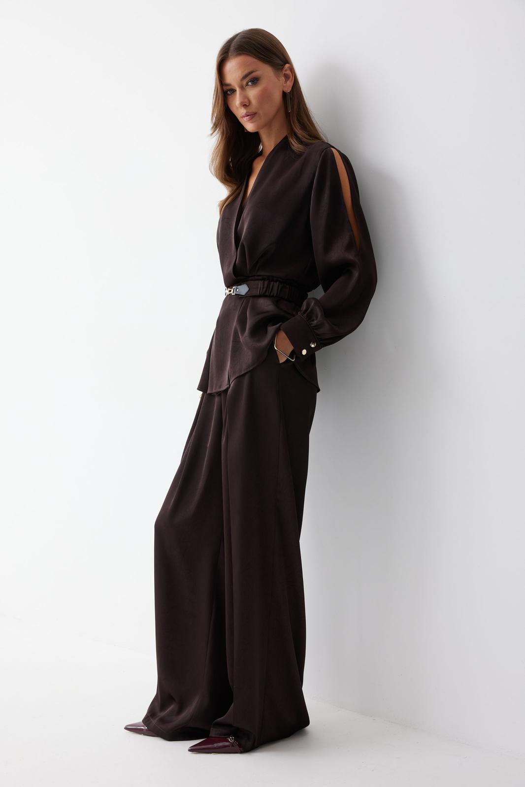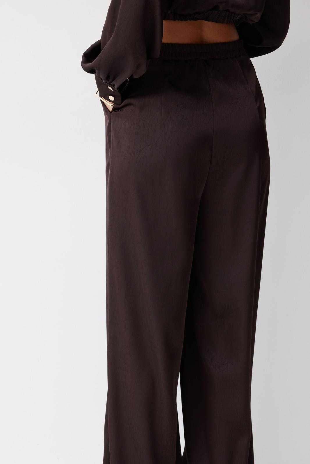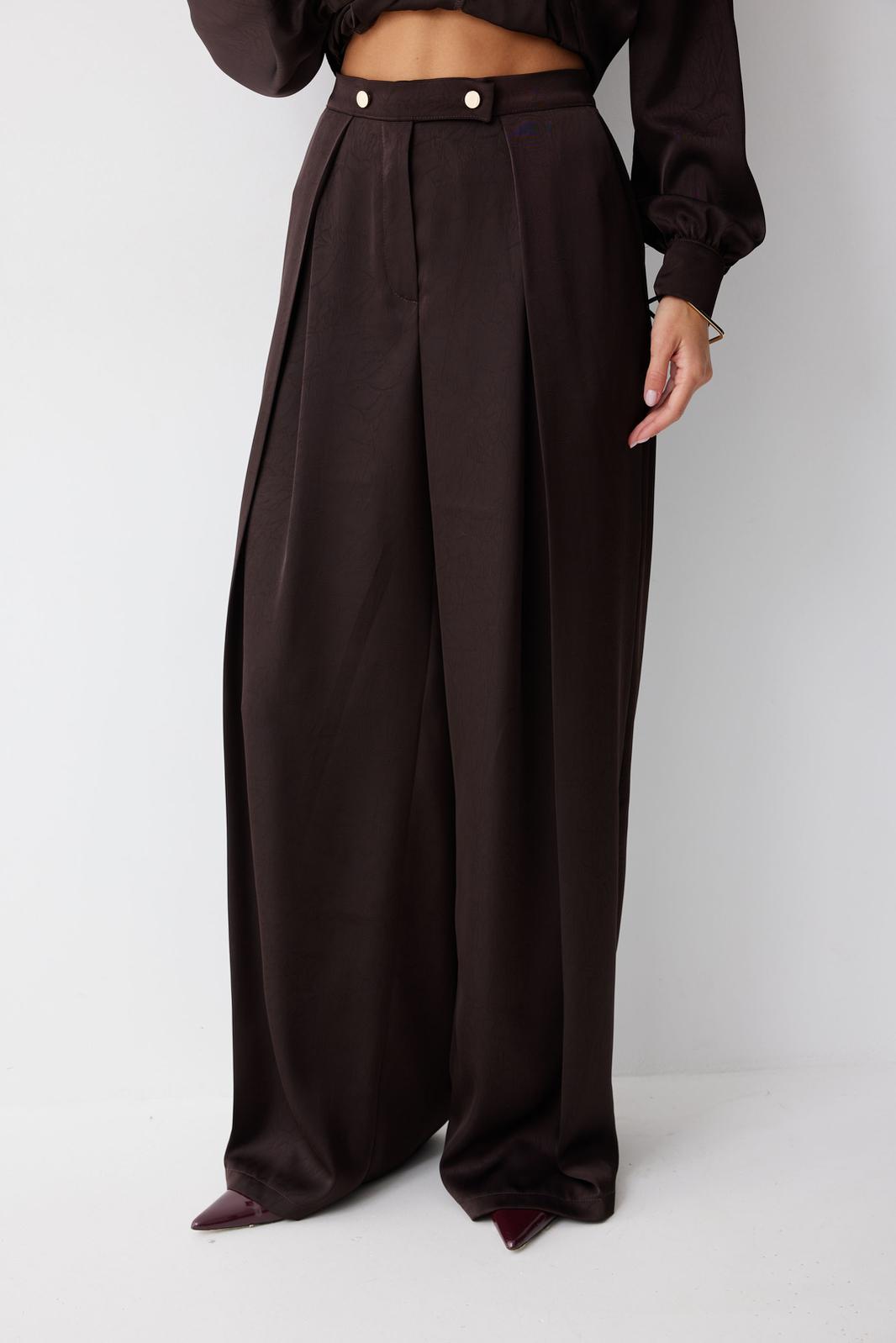 Брюки прямого силуэта расширенные книзу из струящейся ткани. По верху брюк притачной пояс с застежкой на петли и пуговицы. На передних половинках обработана застежка молния в среднем шве. На передних половинках карманы и декоративные складки. По поясу задних половинок брюк резинка и вытачки. Обращаем ваше внимание, что фурнитура может отличаться от фото.