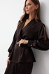 Блузка полуприлегающего силуэта расширенная книзу из струящейся ткани. Рукав втачной, с разрезом в области плеча, по низу манжета с застежкой на петли и пуговицы. Блузка отрезная по линии талии. По переду от подреза вверх и вниз декоративные складки. На спинке в подрез вставлена резинка. В комплект входит съемный ремень. Обращаем ваше внимание, что фурнитура может отличаться от фото.