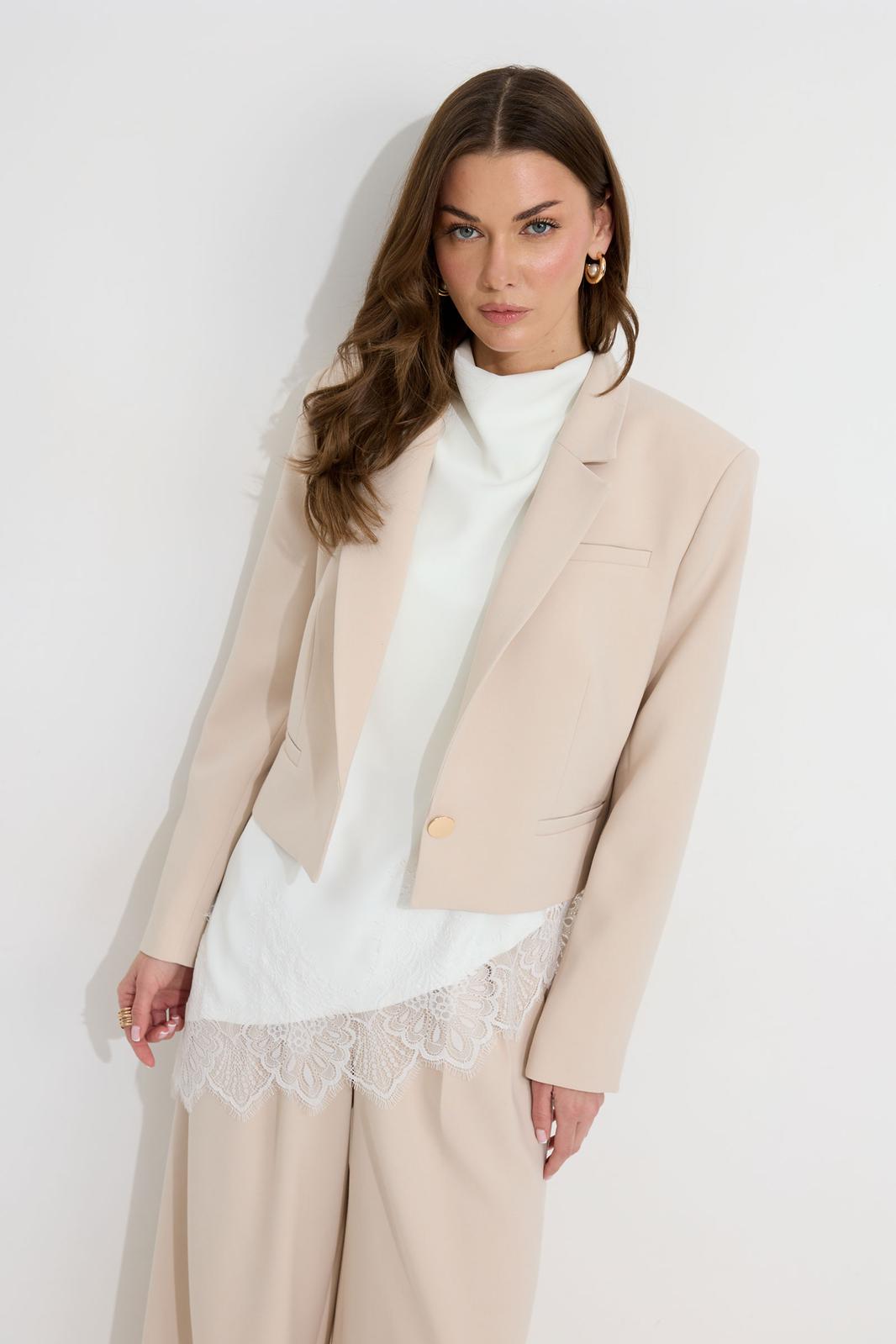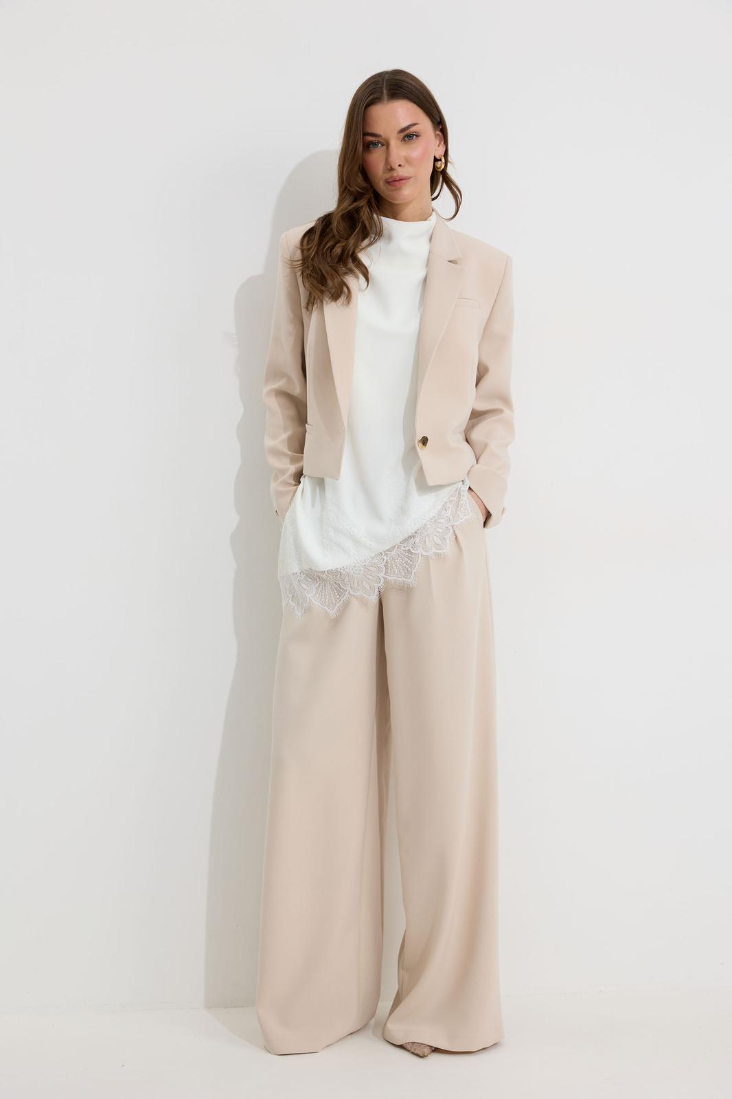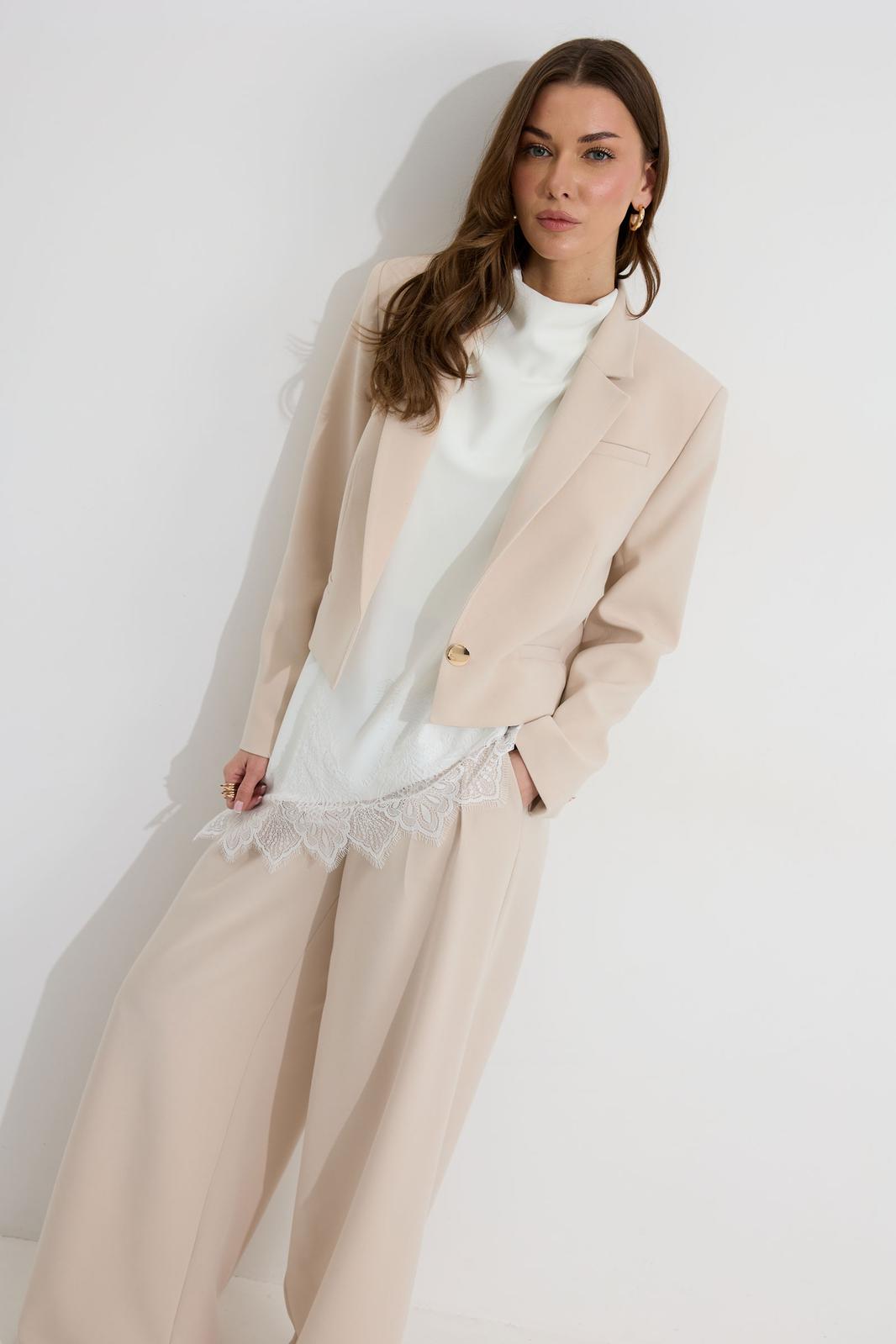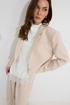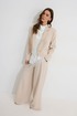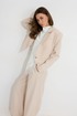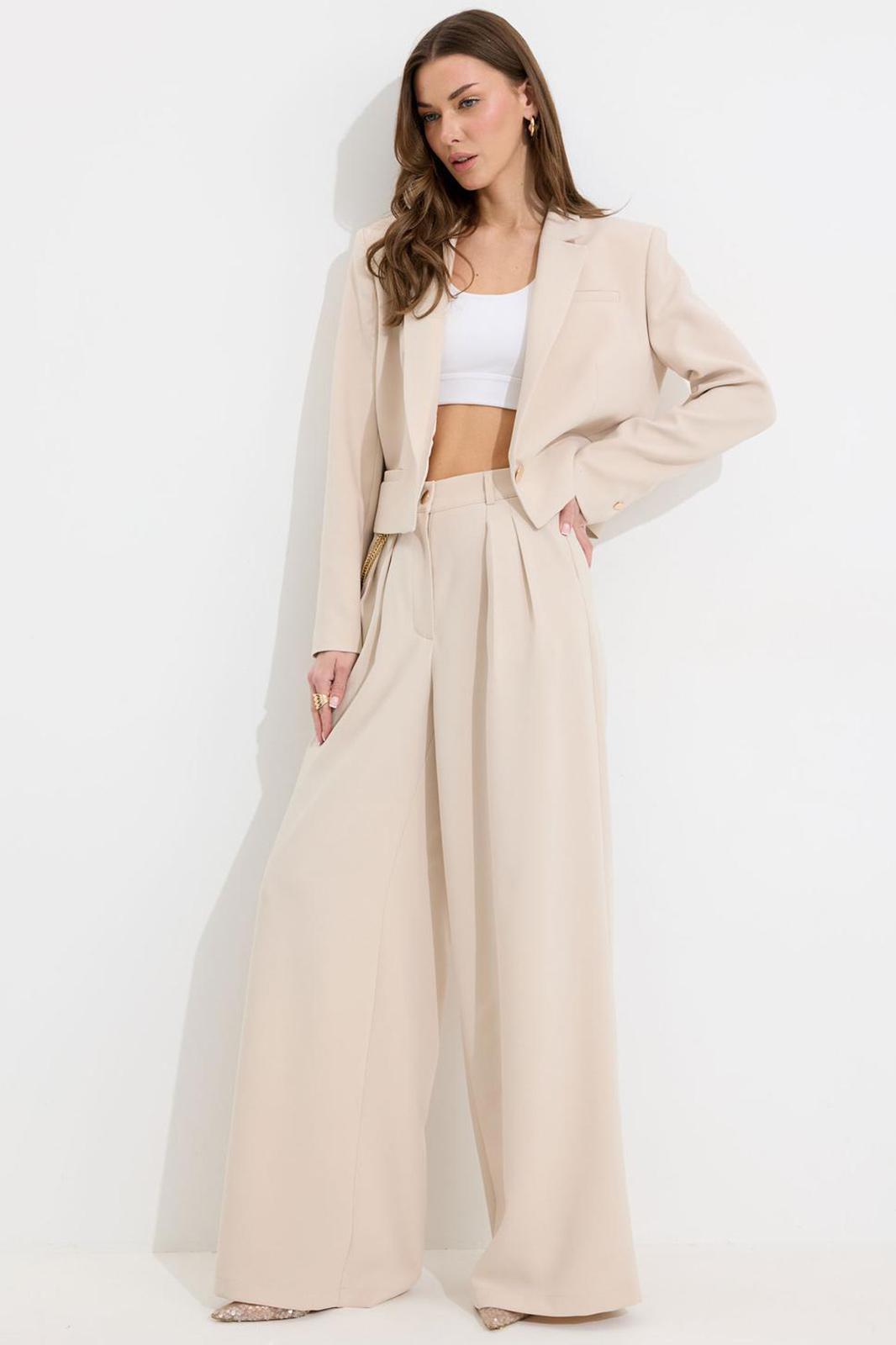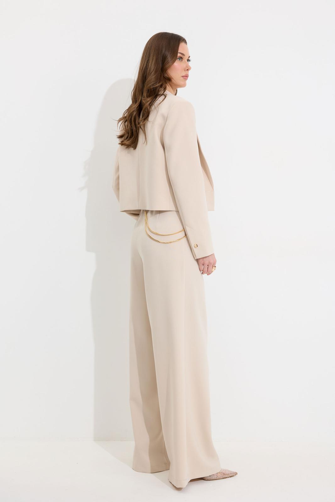 Костюм двойка, состоящи их жакета и брюк. Жакет из поливискозной ткани. Полуприлегающего силуэта, линия плеча немного расширена. Жакет укороченный. С отложным воротником и лацканами. По переду застежка на петлю и пуговицу. По переду отрезные бочки, переходящий на спинку, и талиевые вытачки, по низу горизонтальные карманы, вход оформлен листочкой. По левой полочке выше линии груди карман-обманка, вход оформлен листочкой. По спинке средний шов. Рукав длинный, двухшовный, с имитацией шлицы; шлица с застежкой на петлю и пуговицу. Жакет на подкладке. Обращаем Ваше внимание, что фурнитура может незначительно отличаться от фото.