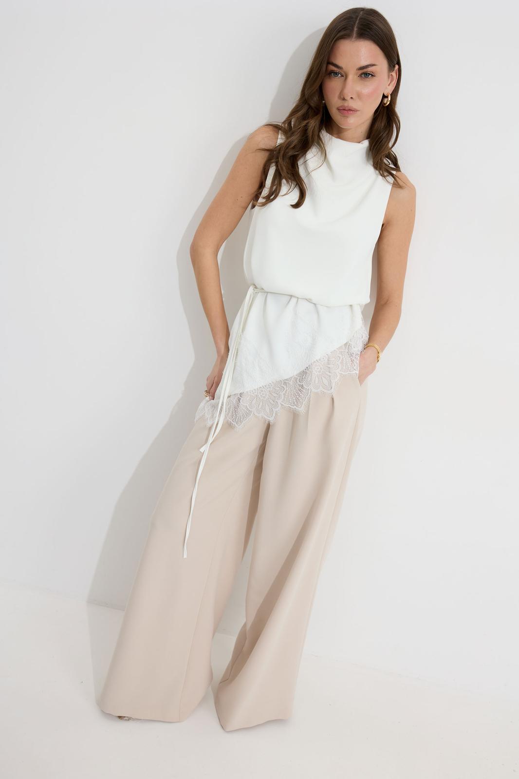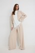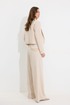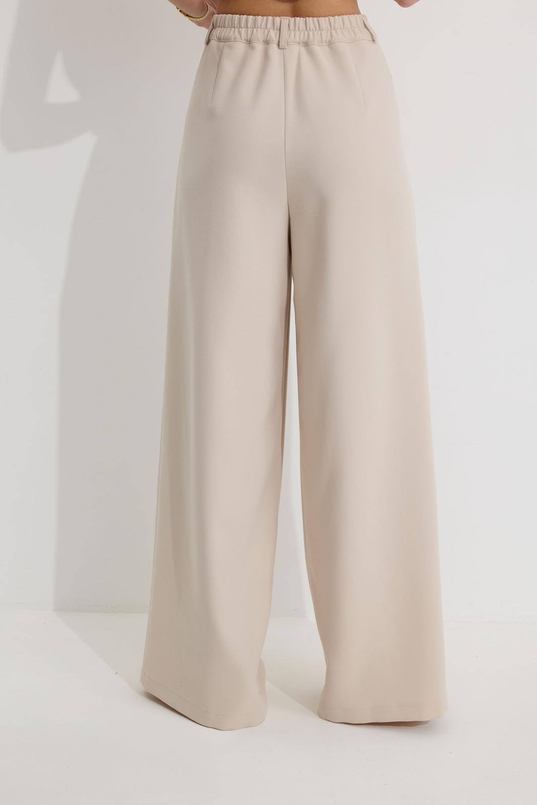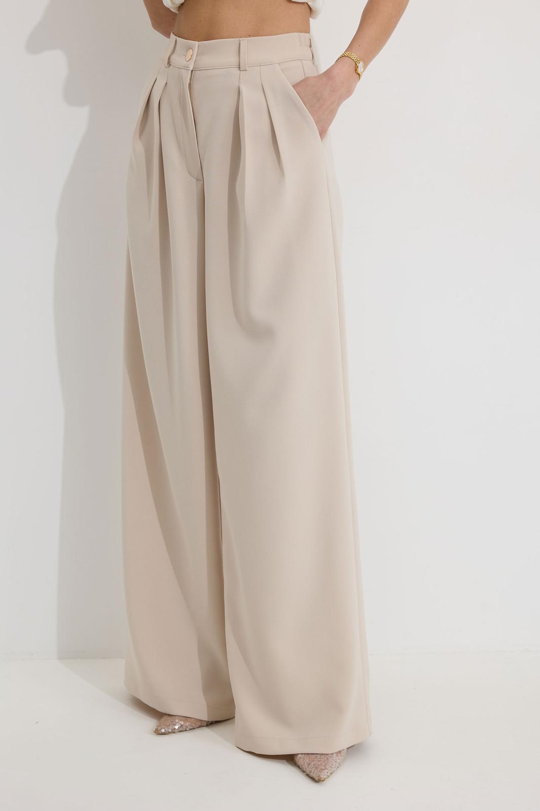 Брюки из поливискозной ткани, прямого, расширенного силуэта. На передних половинах брюк по две складки, выходящих из-под пояса, складки застрочены на несколько сантиметров. По переду застежка на молнию по типу гульфик. Брюки по переду с карманами в отрезных бочках. Пояс по переду с застежкой на петлю и пуговицу. Со шлевками по переду и спинке. По спинке в пояс вставлена резинка. На задних половинах брюк вытачки. Обращаем Ваше внимание, что фурнитура может незначительно отличаться от фото.