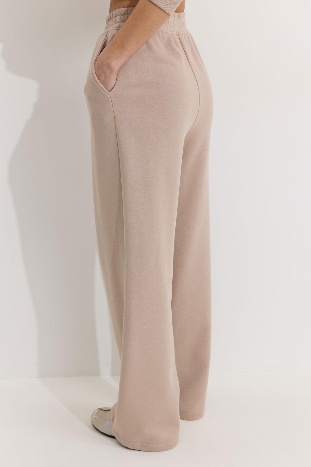 Брюки прямого силуэта расширенные книзу из трикотажного полотна. По верху брюк притачной пояс. По переду наклонные карманы. По низу брюк кулиса с завязками для регулирования длины изделия. Обращаем ваше внимание, что фурнитура может отличаться от фото.