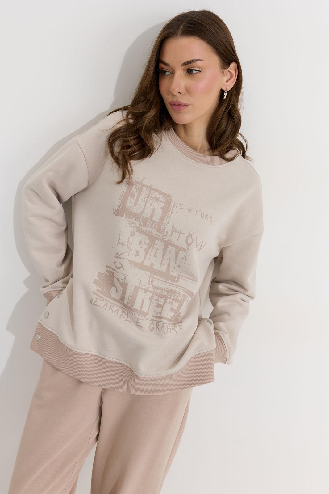 Джемпер прямого силуэта из трикотажного полотна. Горловина округлая. Рукав со спущенной линией плеча, по низу манжета из отделочной ткани. По низу в боковых швах декоративная шлица с кнопками. По низу джемпера притачной пояс из отделочной ткани. По переду дизайнерская печать. Обращаем ваше внимание, что фурнитура может отличаться от фото.