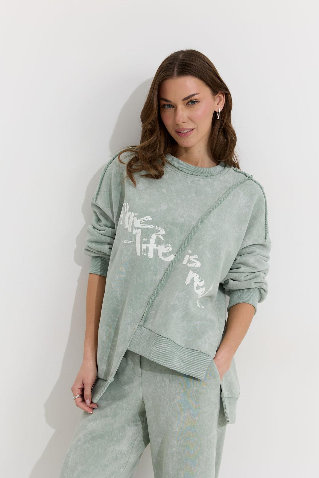 Ассиметричный джемпер прямого силуэта из трикотажного полотна. Горловина округлая. Рукав со спущенной линией плеча . По переду и спинке декоративный шов, по низу пояс с нашивкой. По низу джемпера и рукава декоративная сетка.