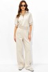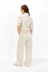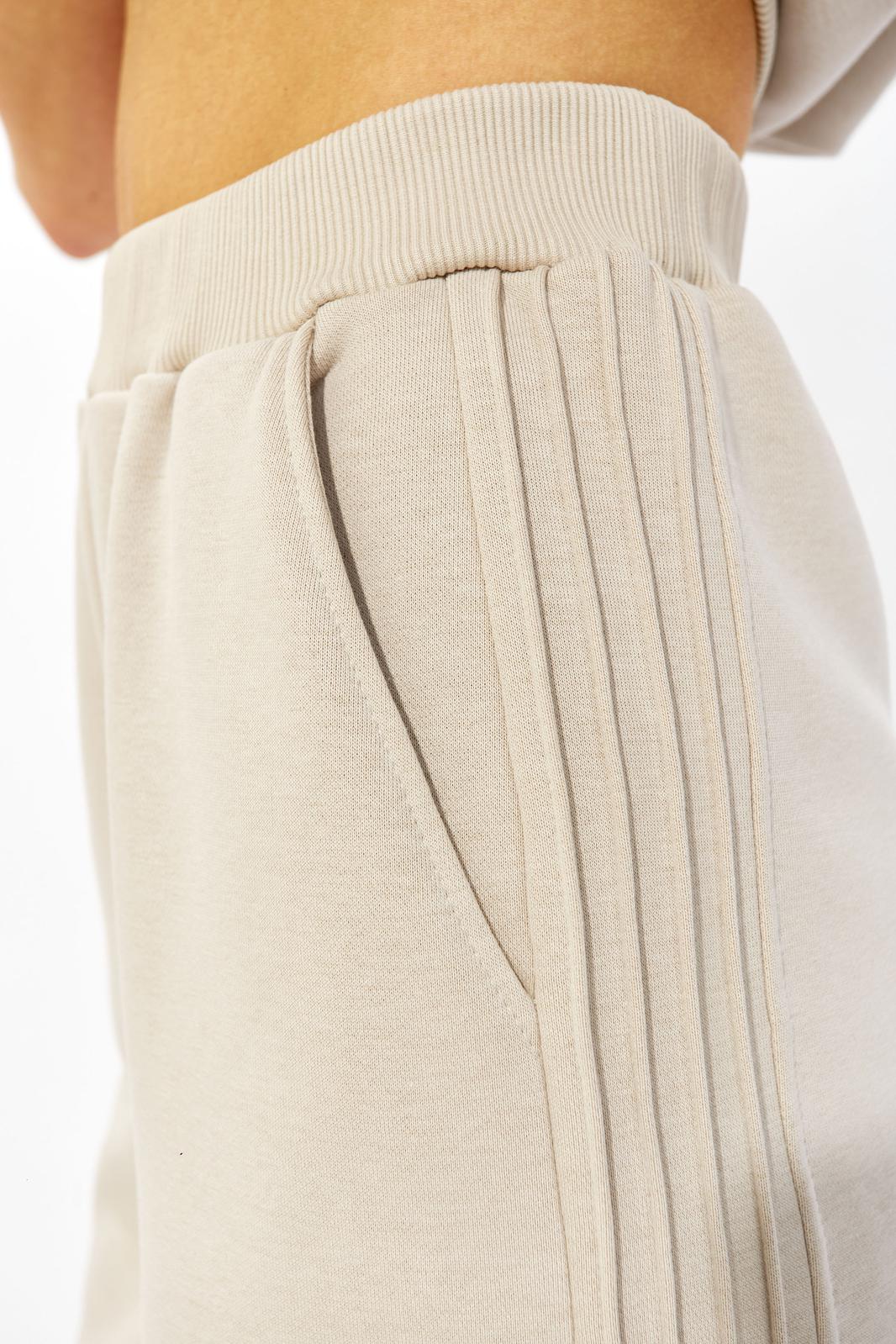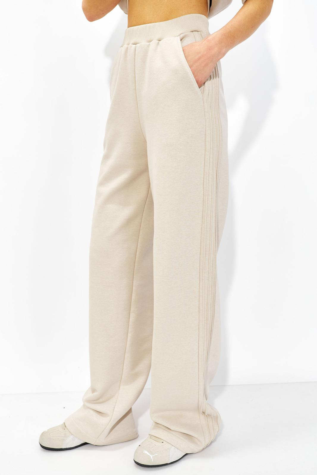 Брюки прямого силуэта расширенные книзу из трикотажного полотна. По верху брюк притачной пояс. По переду наклонные карманы. По бокам притачная планка с декоративными защипами.