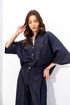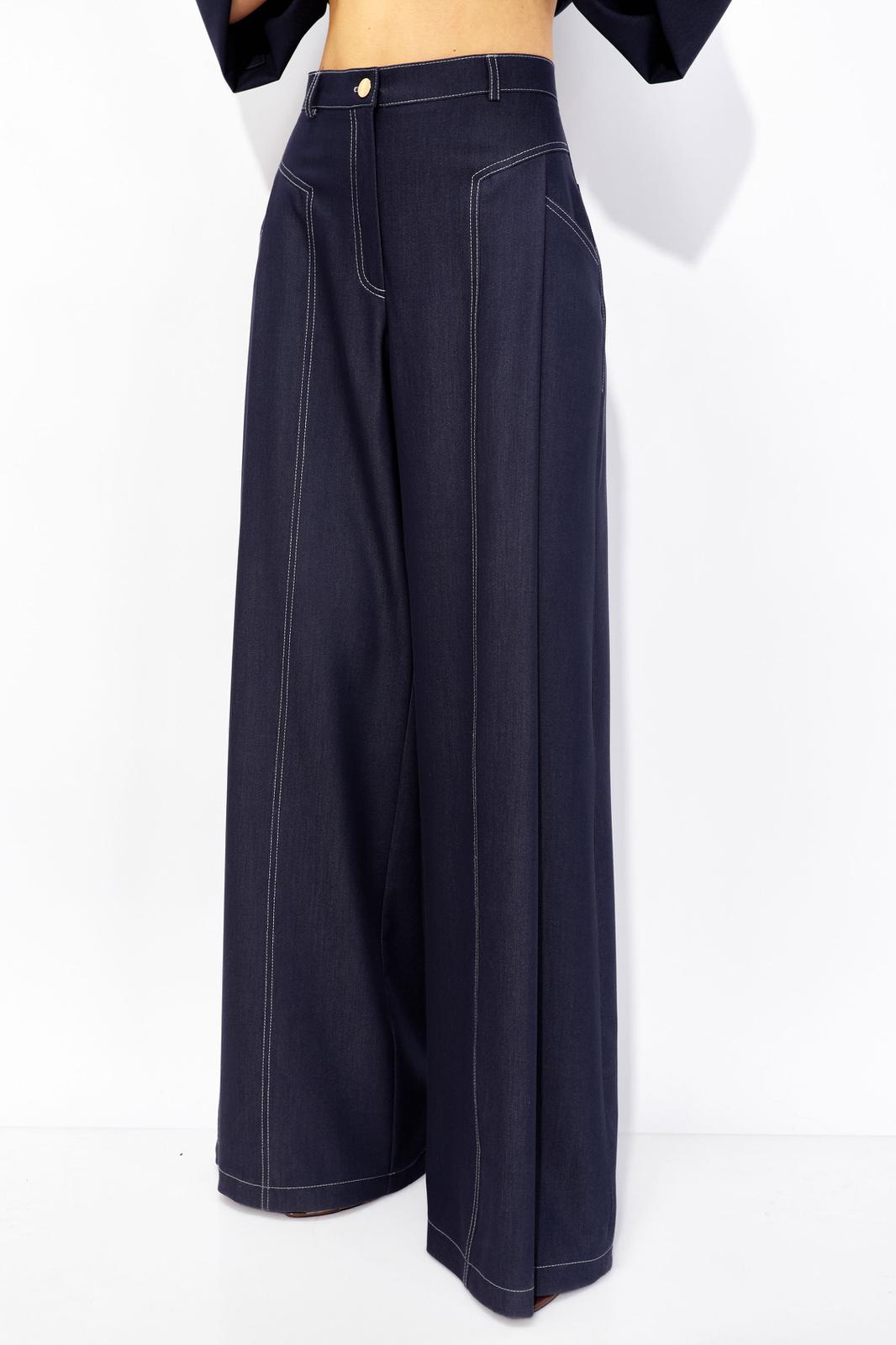Брюки прямого силуэта расширенные книзу из костюмной ткани под джинс. По верху притачной пояс со шлевками для ремня. На передних половинках обработаны карманы, декоративная складка, застежка молния в среднем шве, на задних – вытачки с карманами. По поясу задних половинок брюк эластичная тесьма (резинка)от вытачки до вытачки. Обращаем ваше внимание, что фурнитура может отличаться от фото.