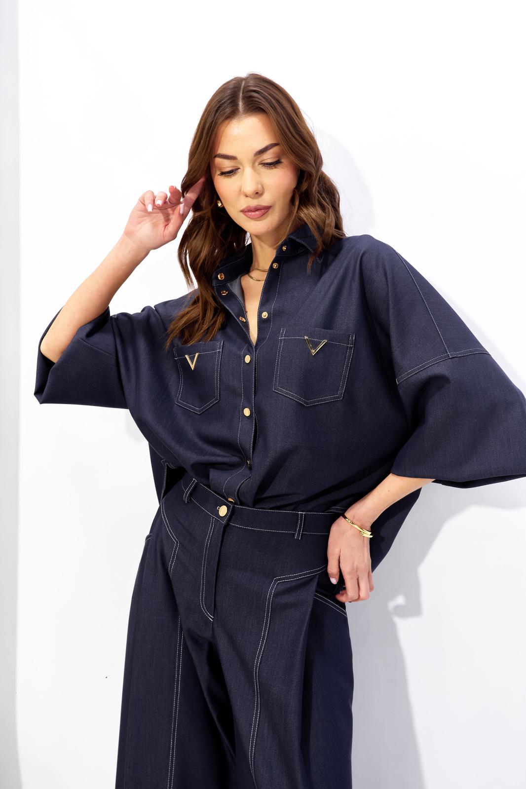 Блузка прямого силуэта слегка зауженная книзу из костюмной ткани под джинс с фигурным низом. Воротник рубашечного типа с застежкой по центру на кнопки. Рукав со спущенной линией плеча, по низу манжета с застежкой на кнопки. По переду накладные карманы. На спинке кокетка с декоративной складкой. По низу блузки в боковых швах разрезы. Обращаем ваше внимание, что фурнитура может отличаться от фото.