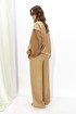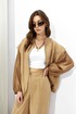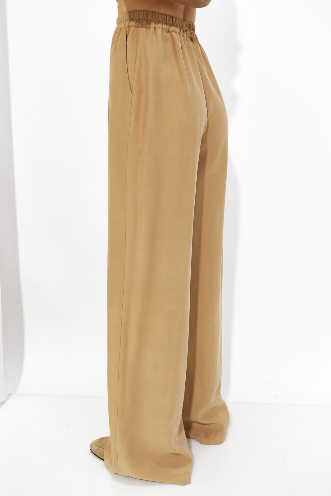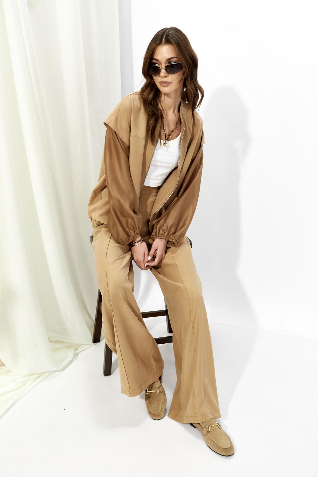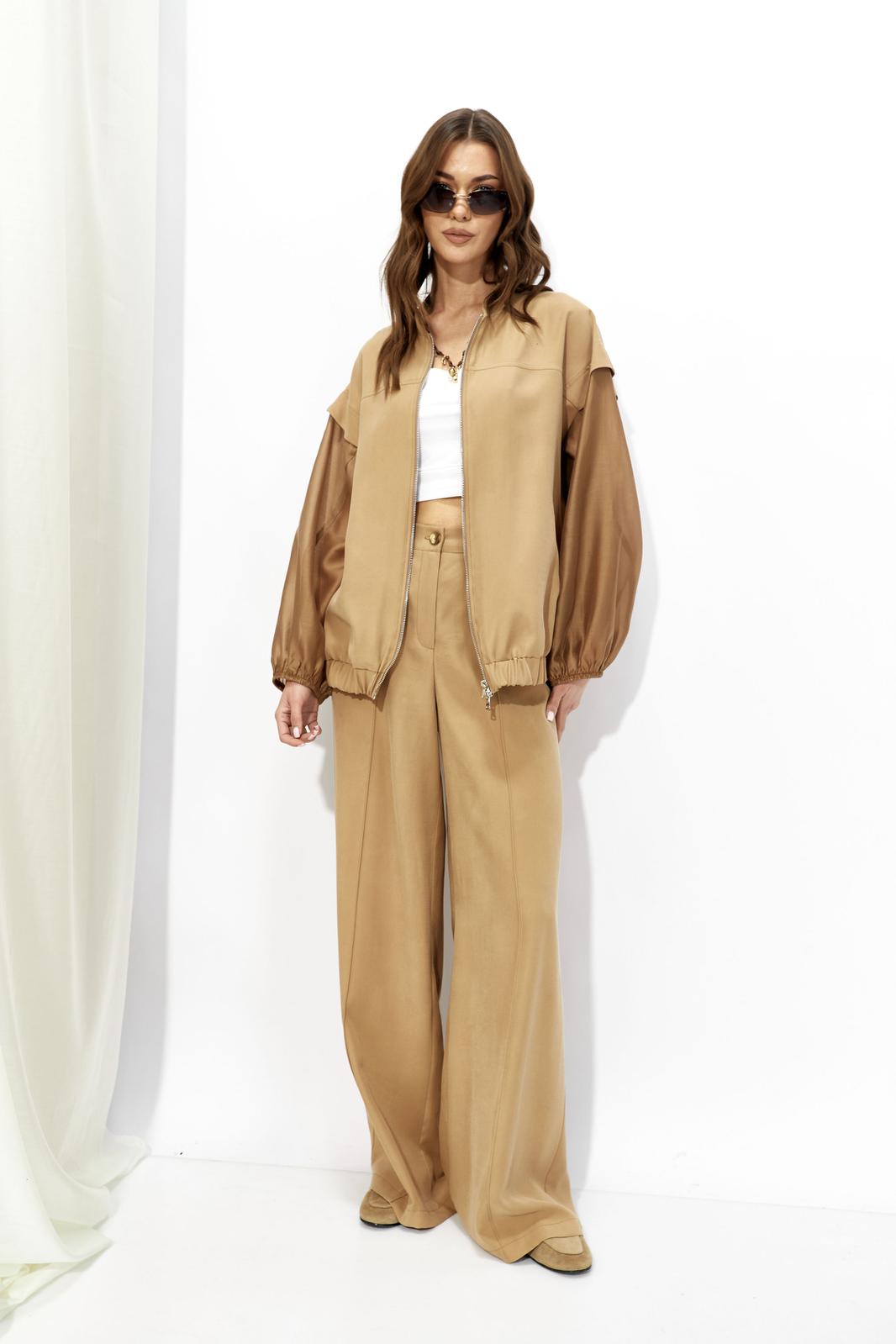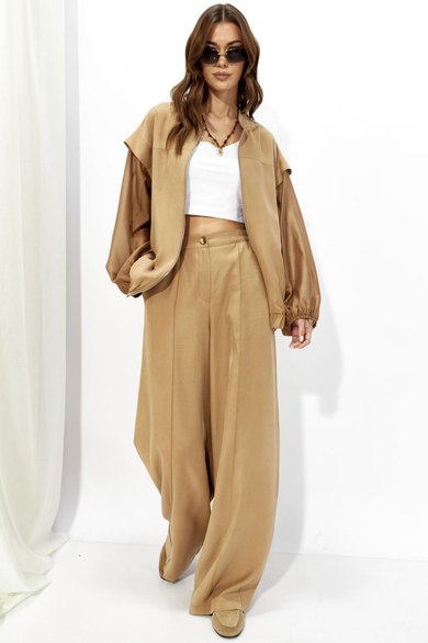 Костюм, состоящий из жакета и брюк из струящейся натуральной ткани. Жакет свободного расширенного силуэта со спущенной линией плеч, без подкладки, длиной до линии бёдер. Застежка центральная на металлическую молнию. Вырез горловины округлый с воротником стойкой. Рукава из полупрозрачной ткани со сборкой на резинку по низу. Перед и спинка с отрезными горизонтальными кокетками. На переде обработаны карманы с широкими листочками с декоративной строчкой. По низу изделия притачная планка с частичной сборкой на резинку, по переду и спинке до боковых рельефов. Брюки свободного силуэта, расширенные к низу. Пояс притачной с застежкой на молнию и пуговицу, и с частичной эластичной тесьмой. Передние половинки с боковыми карманами, с наклонным входом. По центру передних половинок брюк застрочены канты. . Обращаем ваше внимание, что фурнитура может отличаться от фото.