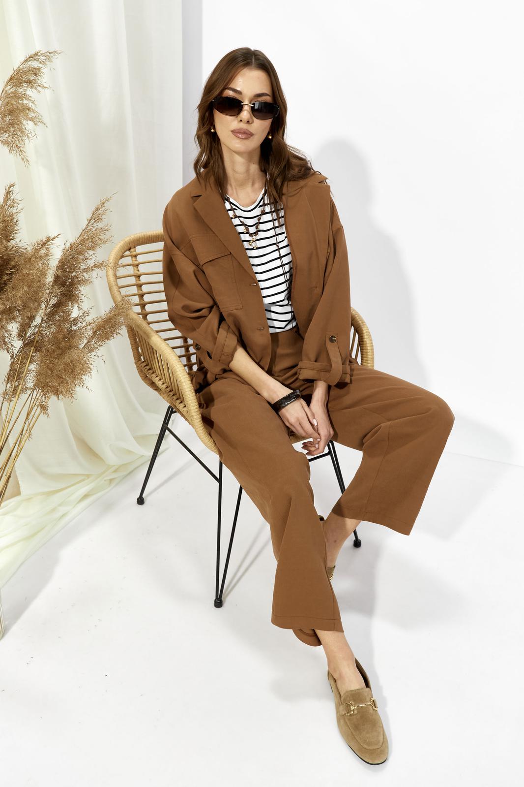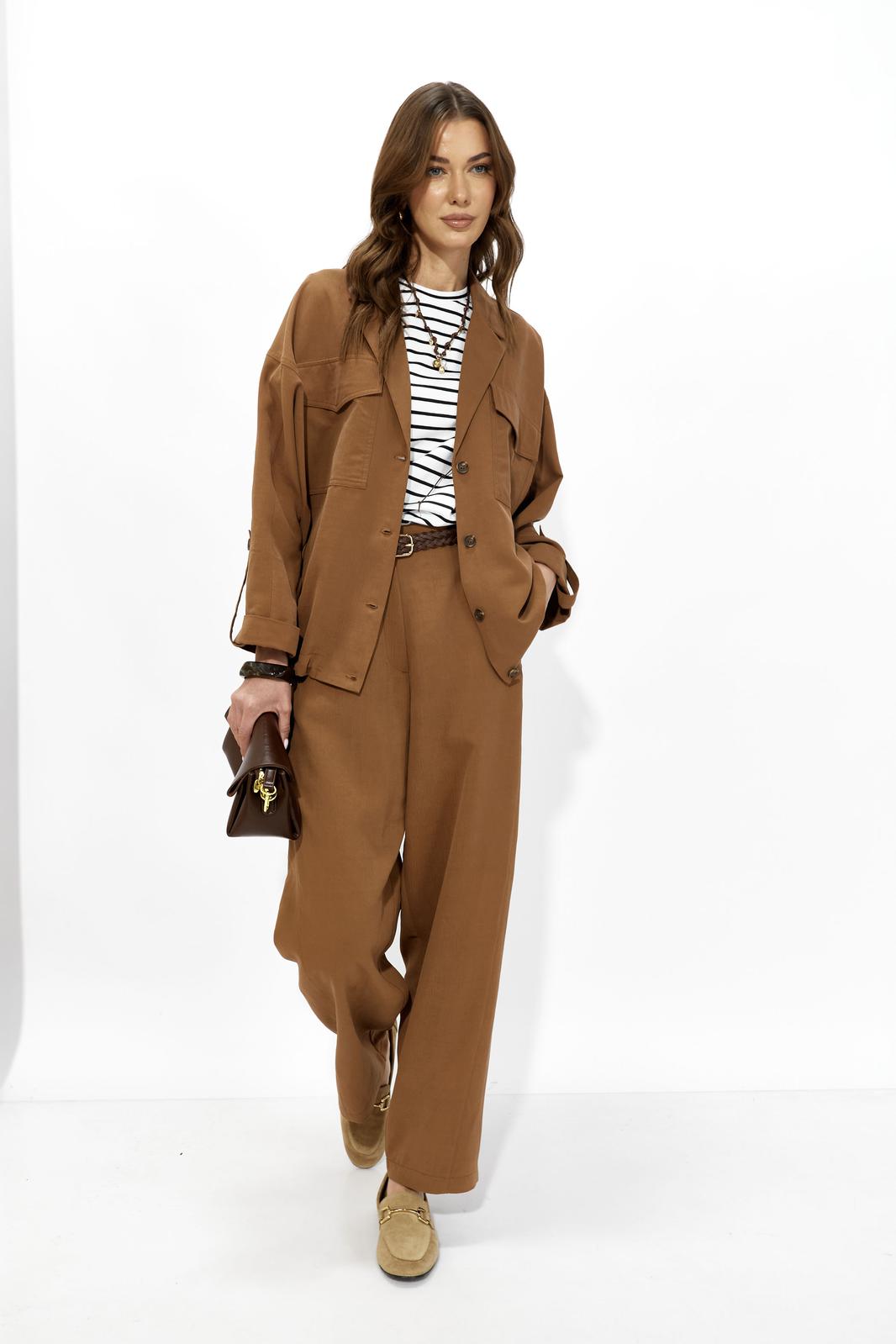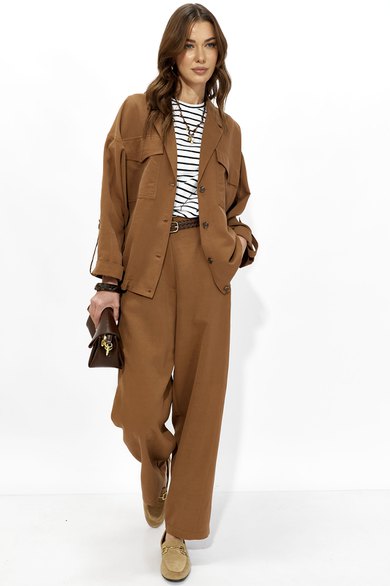 Костюм свободного кроя из вискозной ткани. Жакет свободного, расширенного силуэта с центральной бортовой застежкой на петли и пуговицы. Рукав комбинированный на основе цельнокроеного. Воротник пиджачного типа с отложными лацканами. На переде обработаны накладные карманы с клапанами. Рукава длиной 7/8 с отложными манжетами и регулируемой патой , застегивающейся на пуговицы. По карманам, клапанам, рельефам проложены двойные отделочные строчки в цвет ткани. По низу изделия по переду и спинке предусмотрена небольшая сборка на резинку, регулируемая фиксаторами.