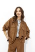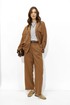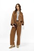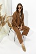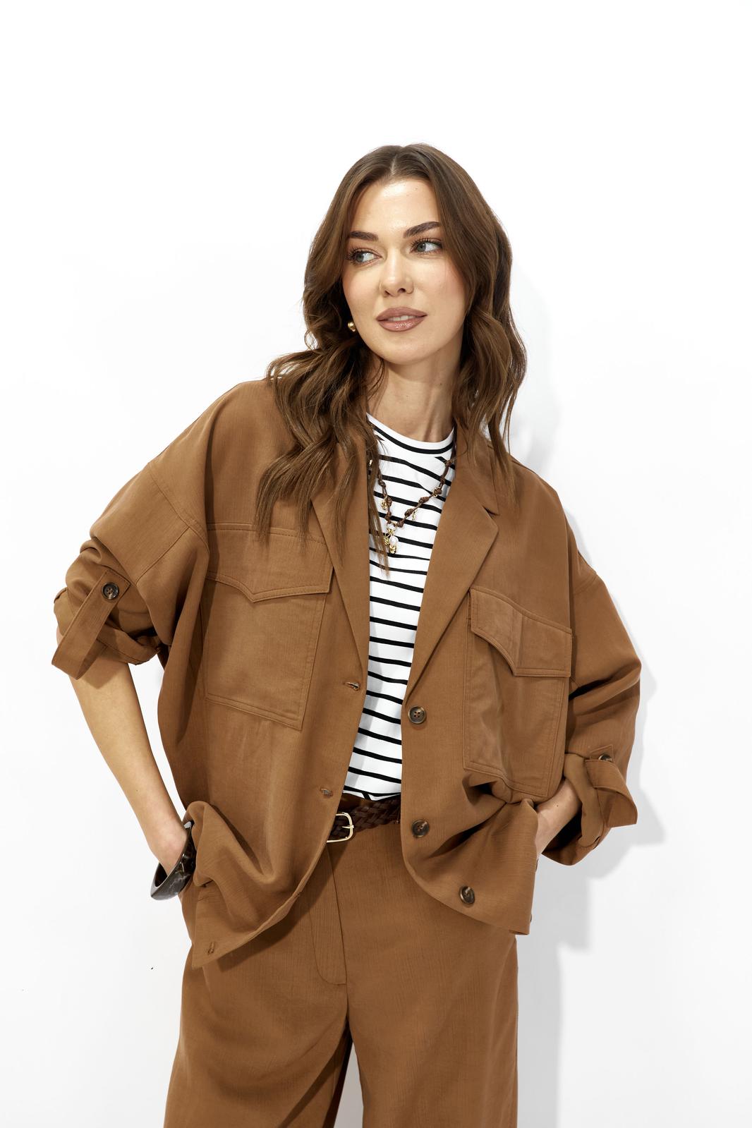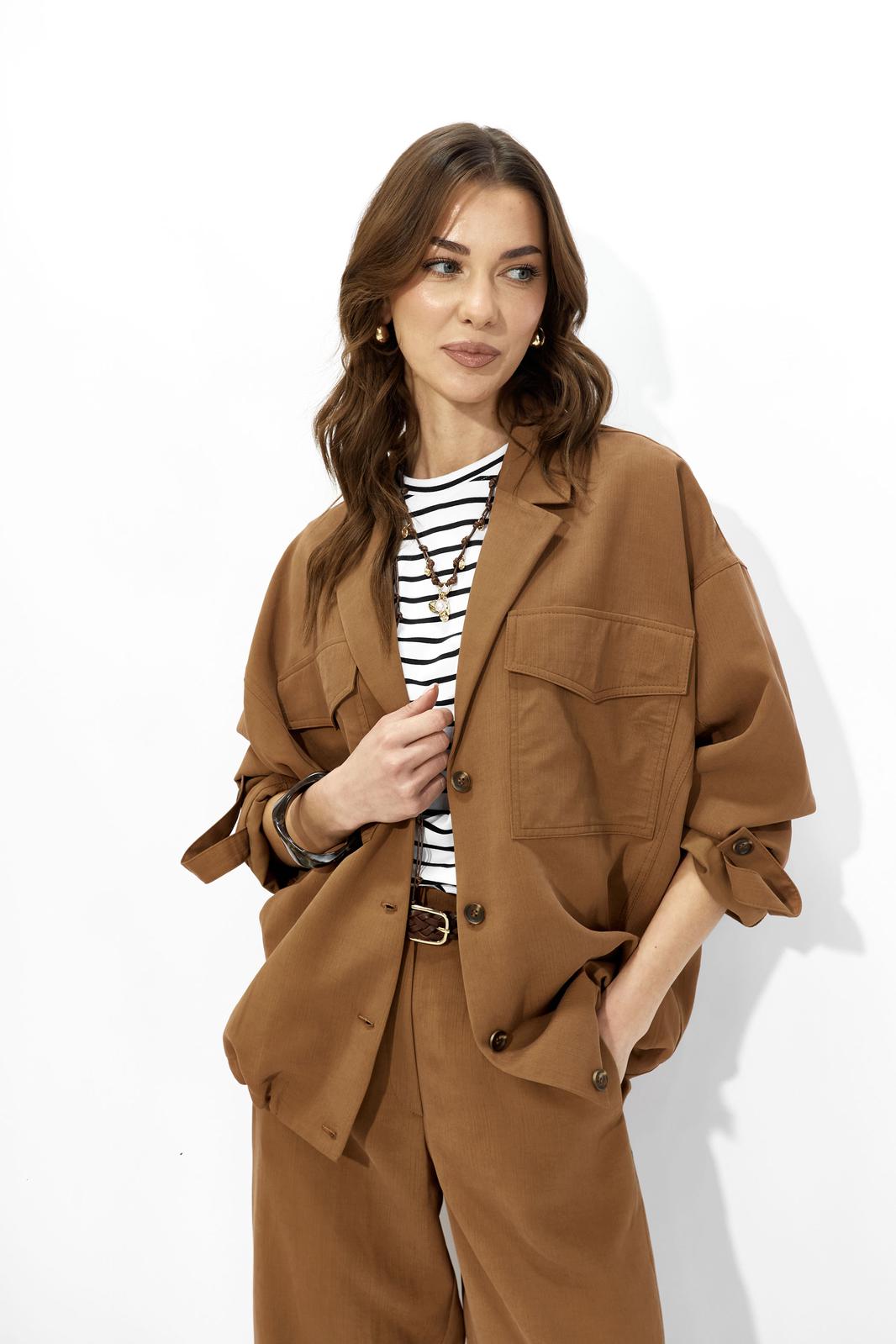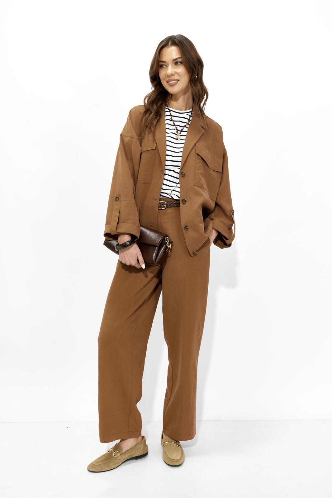 Костюм свободного кроя из вискозной ткани. Жакет свободного, расширенного силуэта с центральной бортовой застежкой на петли и пуговицы. Рукав комбинированный на основе цельнокроеного. Воротник пиджачного типа с отложными лацканами. На переде обработаны накладные карманы с клапанами. Рукава длиной 7/8 с отложными манжетами и регулируемой патой , застегивающейся на пуговицы. По карманам, клапанам, рельефам проложены двойные отделочные строчки в цвет ткани. По низу изделия по переду и спинке предусмотрена небольшая сборка на резинку, регулируемая фиксаторами.