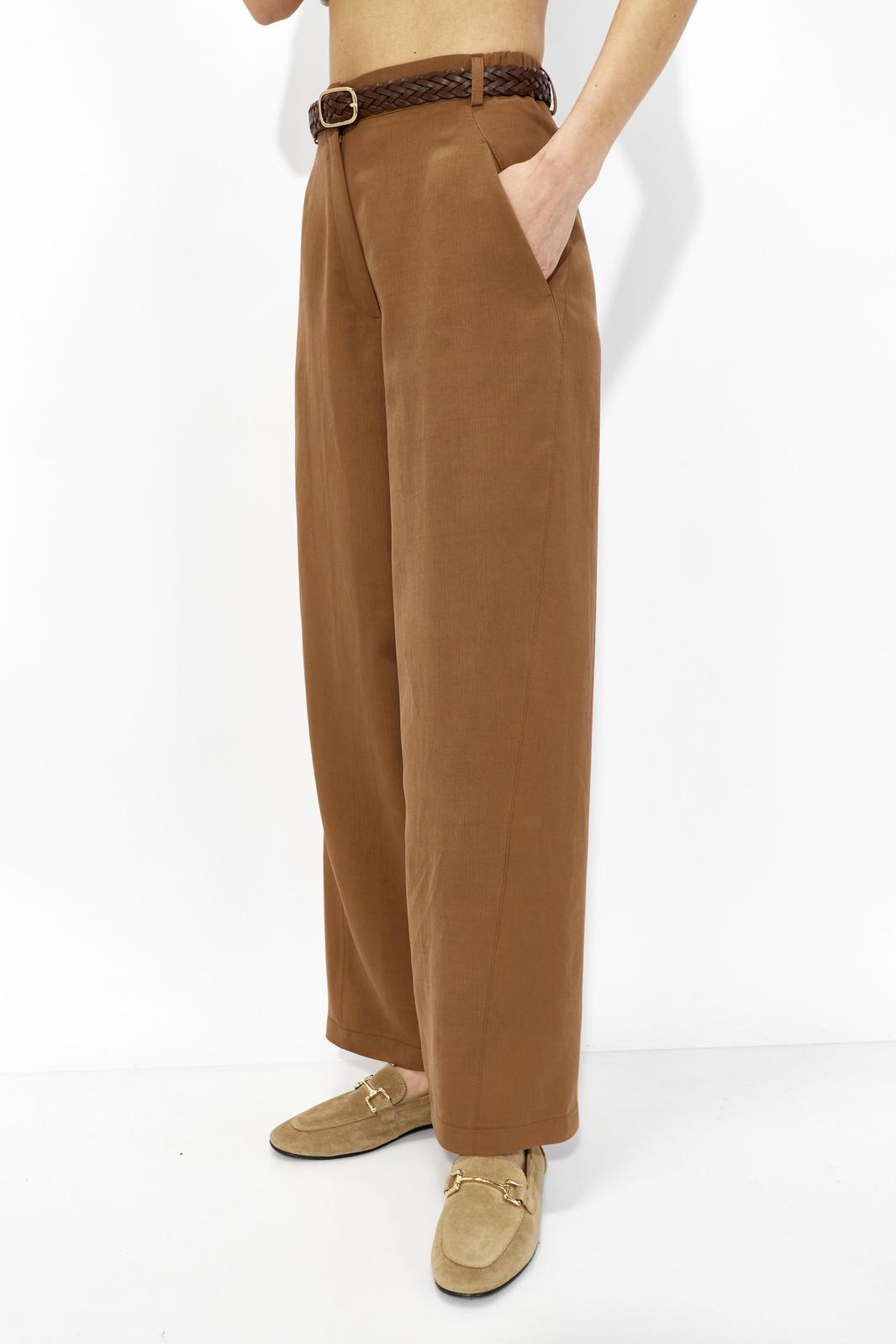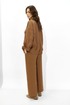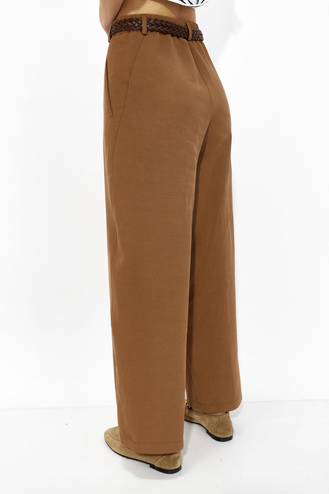 Брюки прямого, расширенного силуэта, слегка зауженные к низу. Пояс притачной, частично с резинкой по переду и спинке и с застежкой спереди на молнию и петлю-пуговицу. Боковые швы смещенные. Брюки по переду с карманами в отрезных бочках.