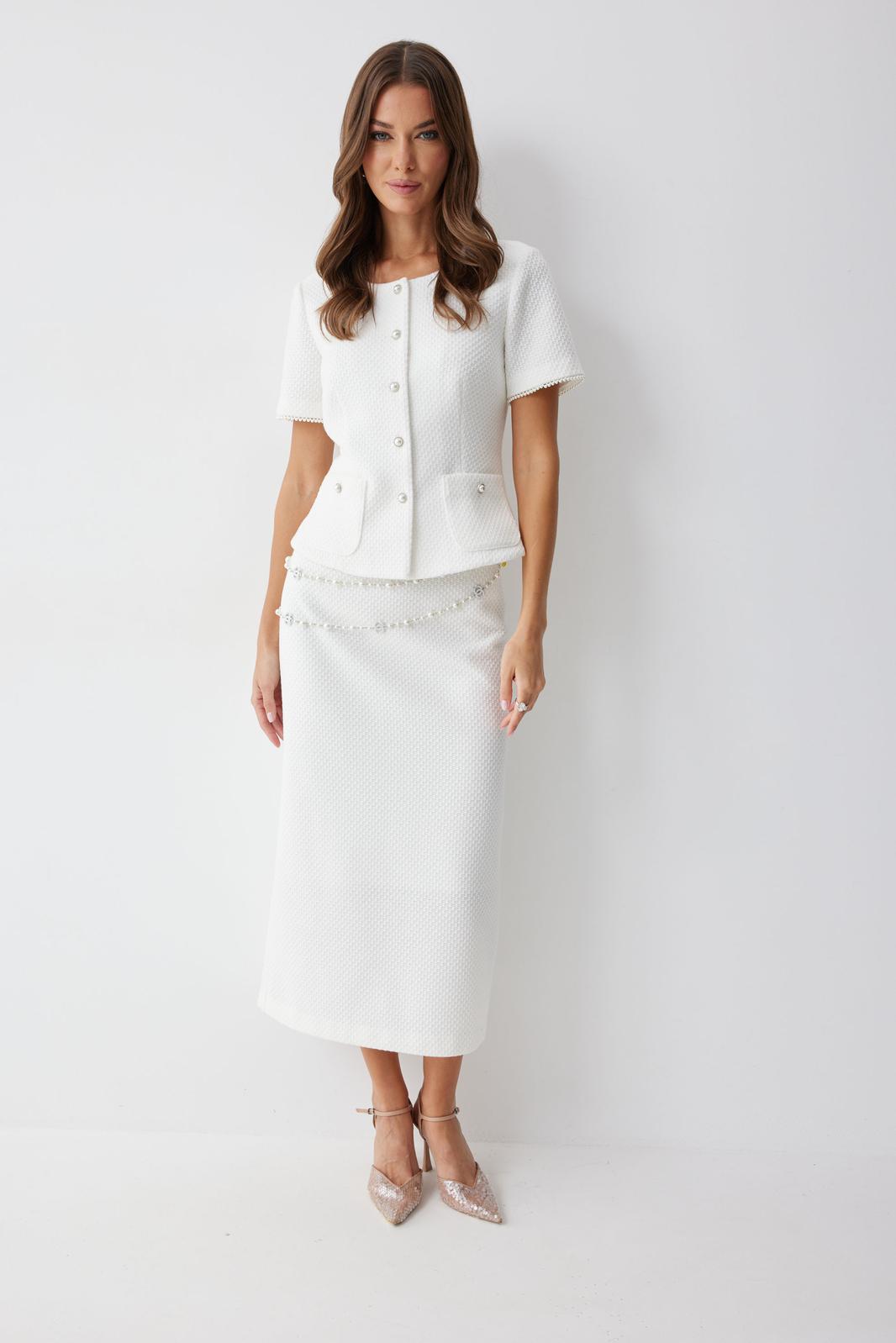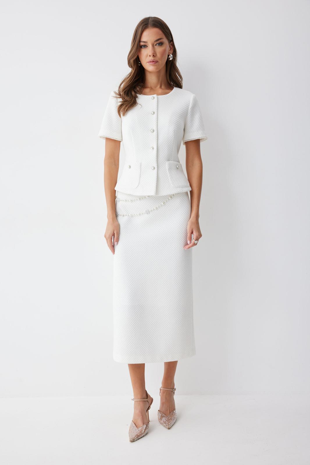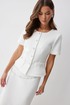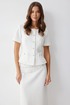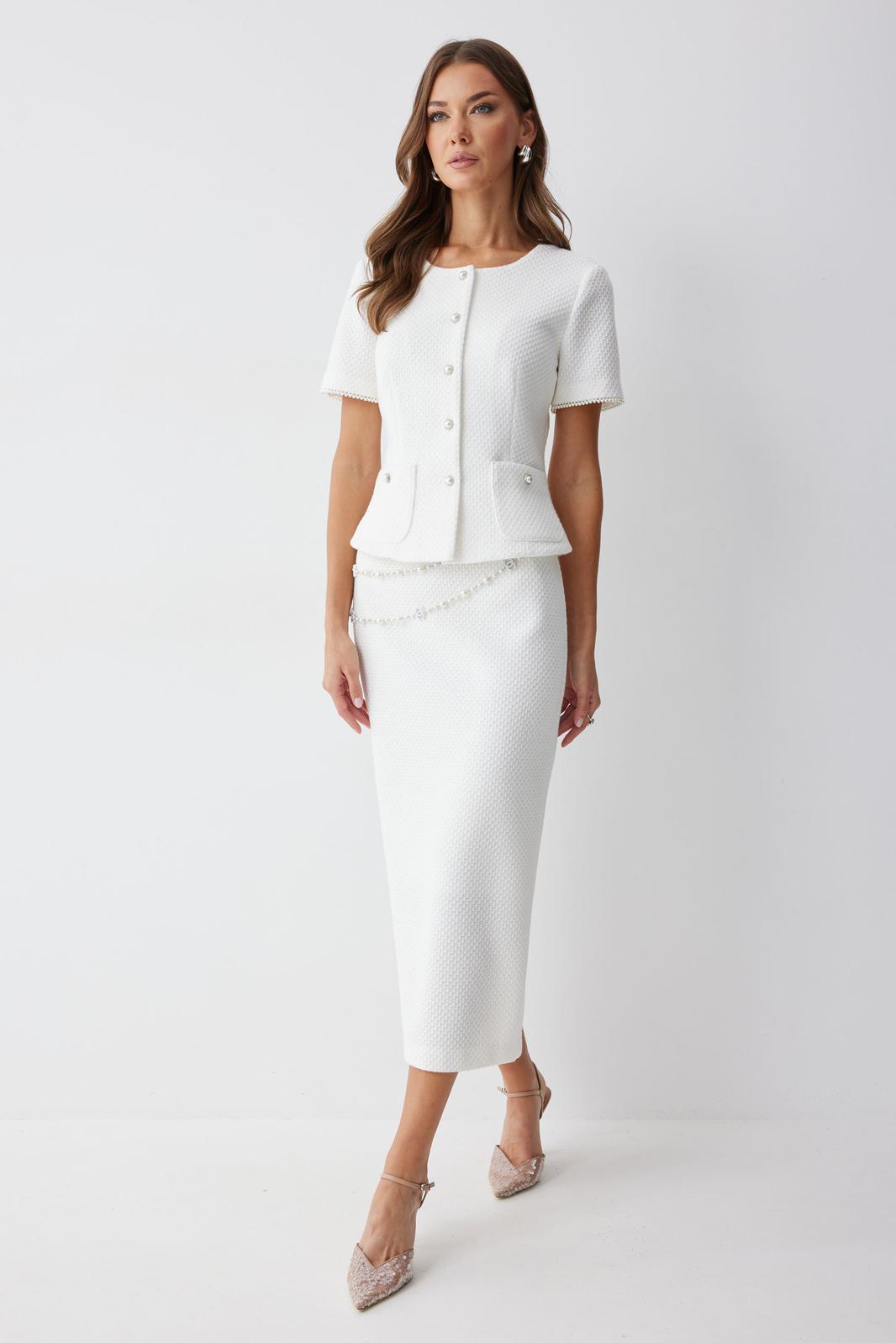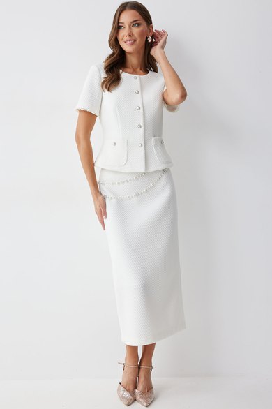 Жакет полуприлегающего силуэта из трикотажного полотна. Горловина округлая по центру застежка на петли и пуговицы. Рукав втачной короткий. По переду талиевые вытачки и накладные карманы, на спинке – талиевые вытачки. Жакет на подкладке. Обращаем ваше внимание, что фурнитура может отличаться от фото.