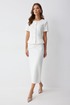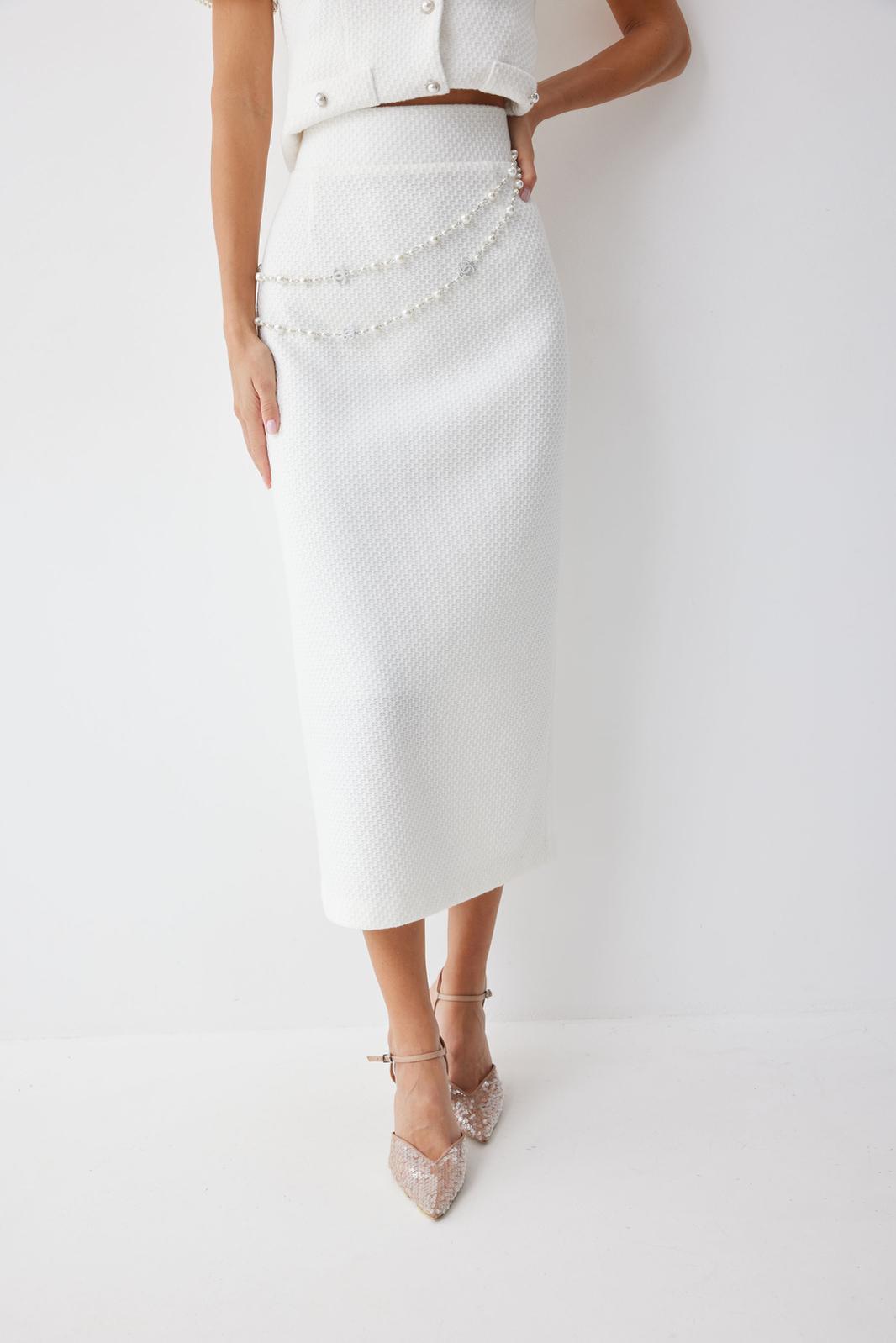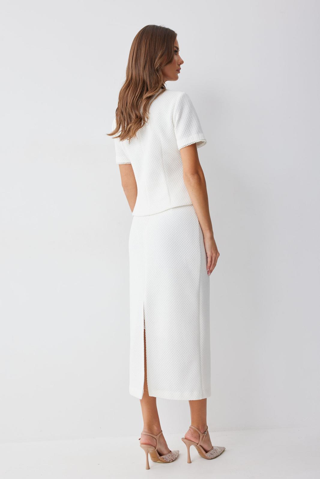Юбка прямого силуэта из трикотажного полотна. По верху юбки притачной пояс. На спинке юбки в центральном шве застежка на потайную молнию, по низу разрез. Юбка на подкладке.