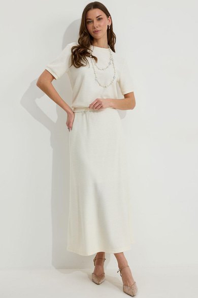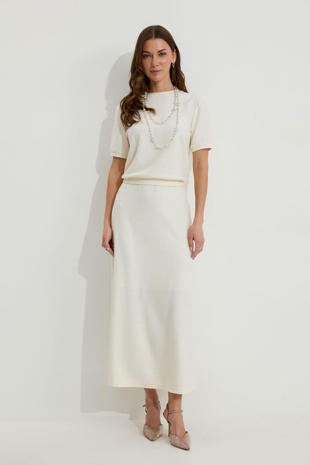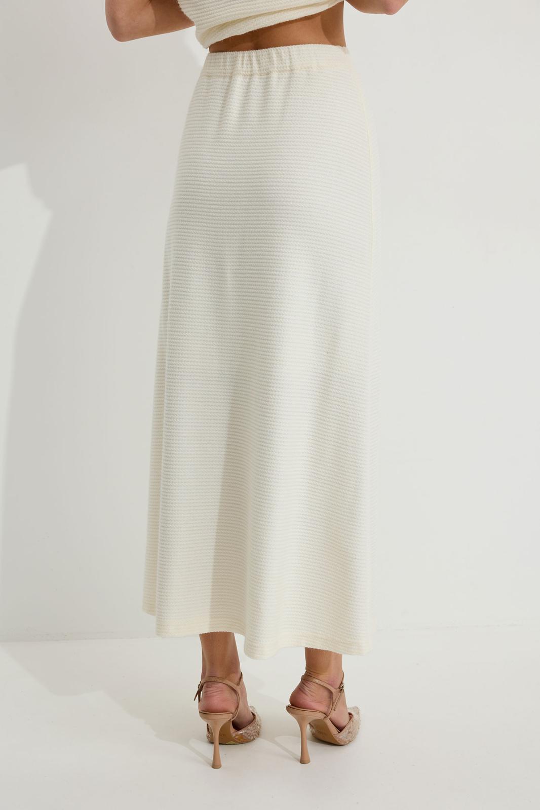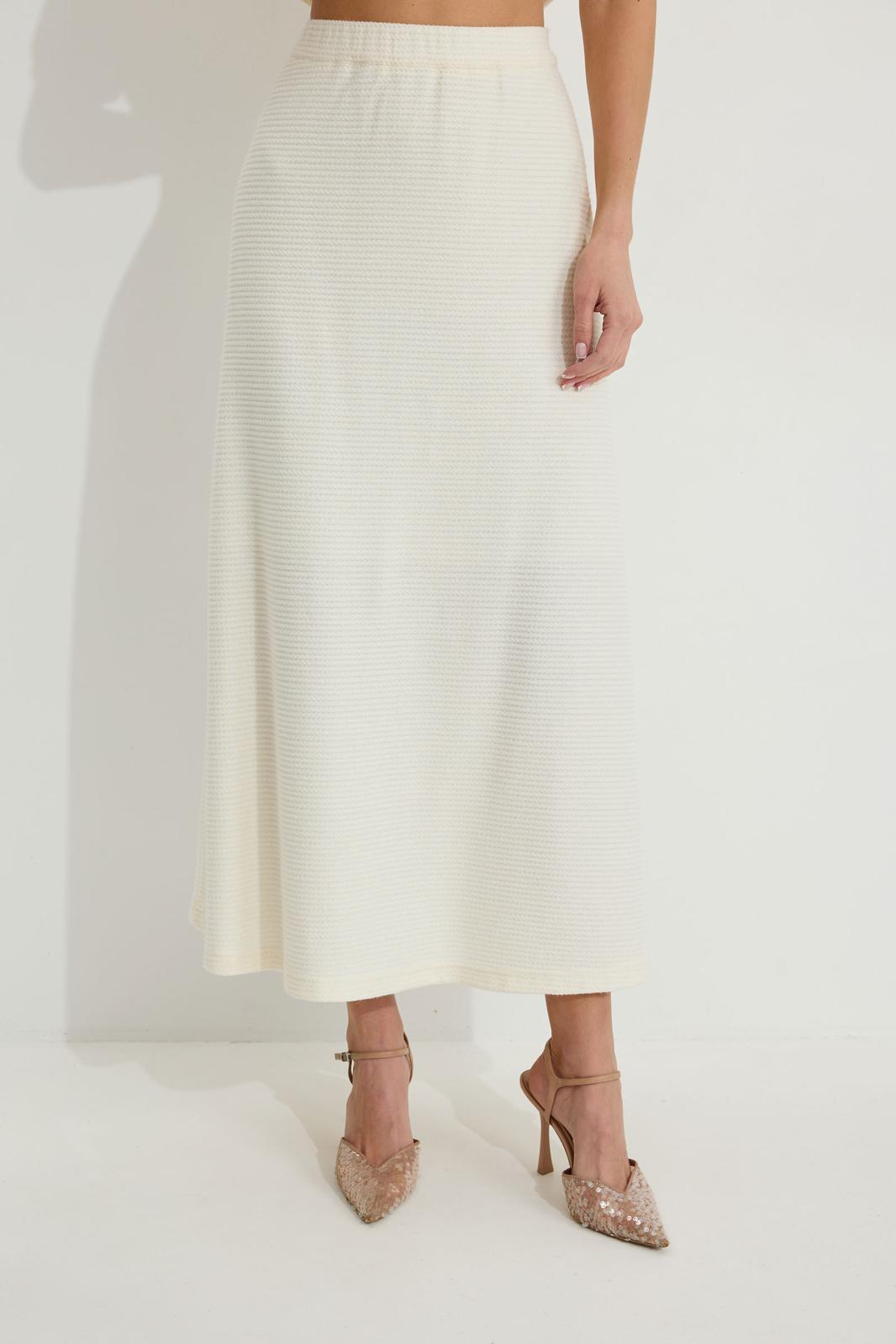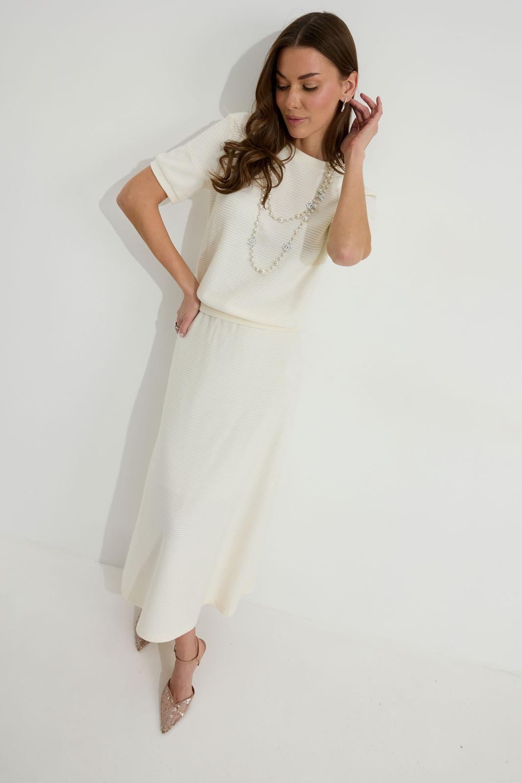 Юбка А-силуэта расширенная книзу из трикотажного полотна. По верху юбки притачной пояс с эластичной тесьмой (резинкой).