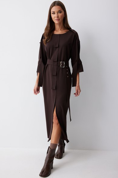 Платье прямого силуэта из костюмной ткани. Горловина округлая. Рукав со спущенной линией плеча длиной 7/8. По переду и спинке по центру декоративный элемент. В комплект входит съемный ремень. Обращаем ваше внимание, что фурнитура может отличаться от фото.