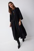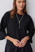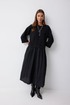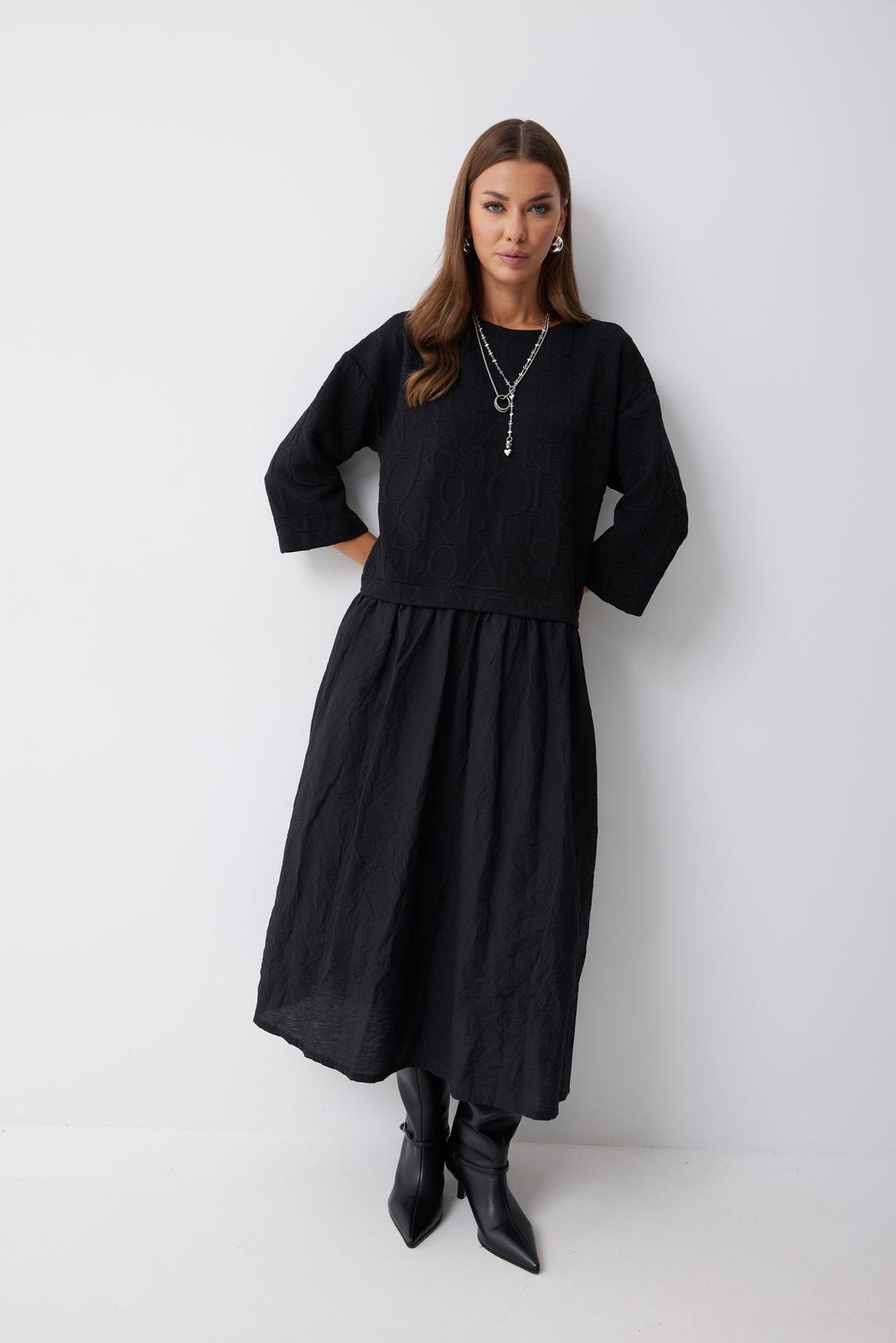 Платье А-силуэта из трикотажного полотна комбинированного хлопковой тканью. Горловина округлая, на спинке застежка на молнию. Рукав со спущенной линией плеча, длиной 7/8. Под линией талии подрез, в подрез вставлена юбка из хлопка. В боковых швах карманы. Платье частично на подкладке.