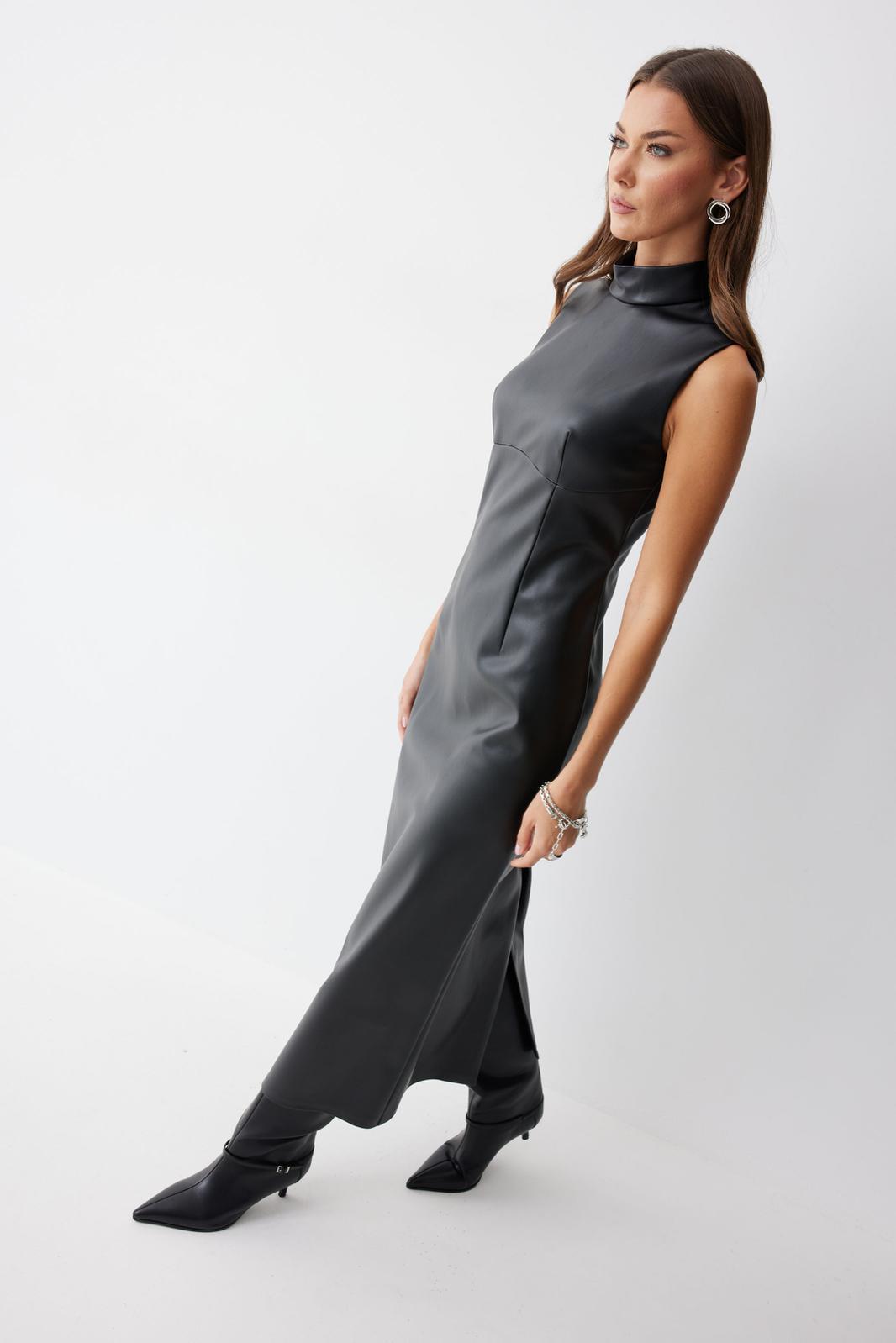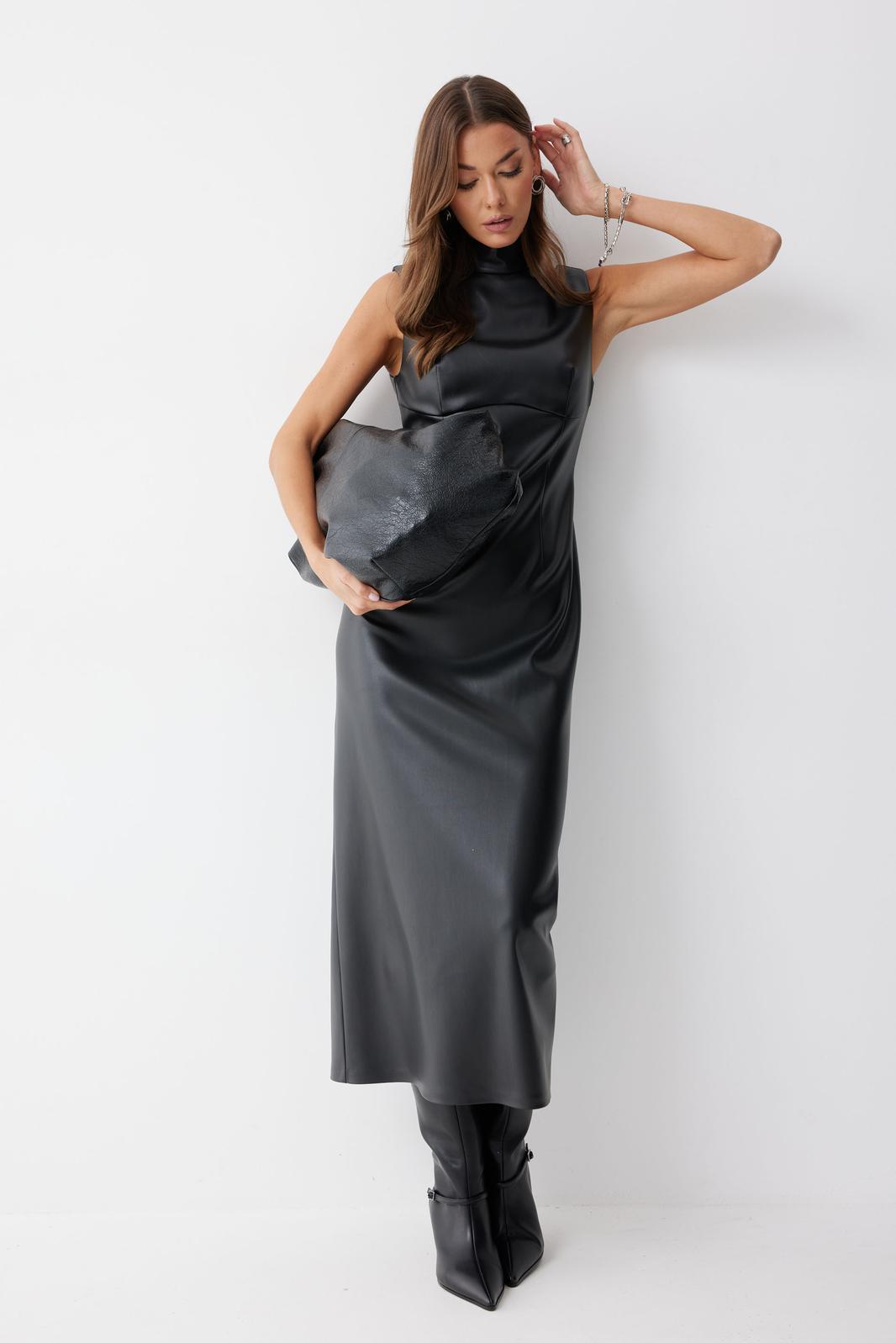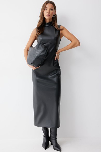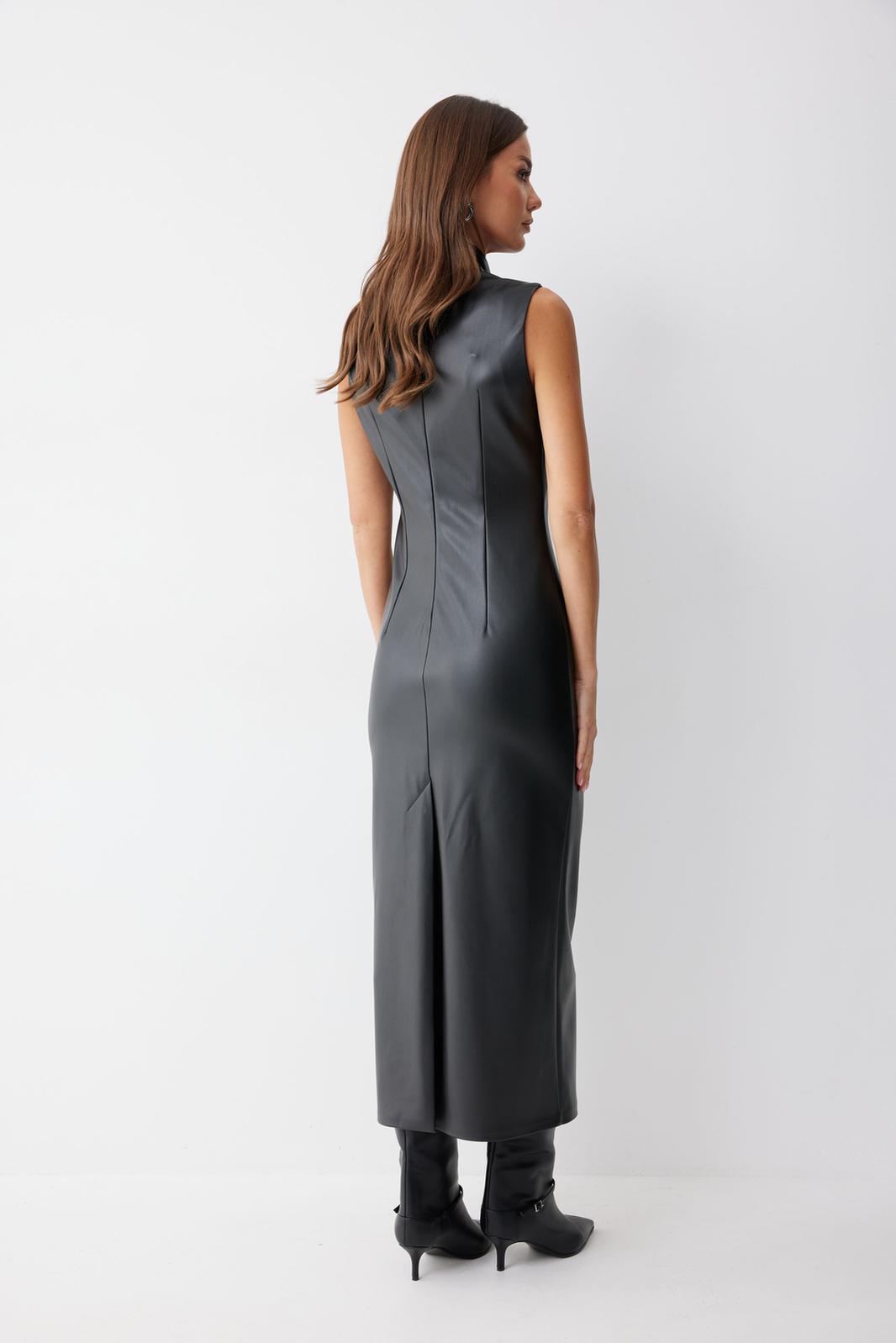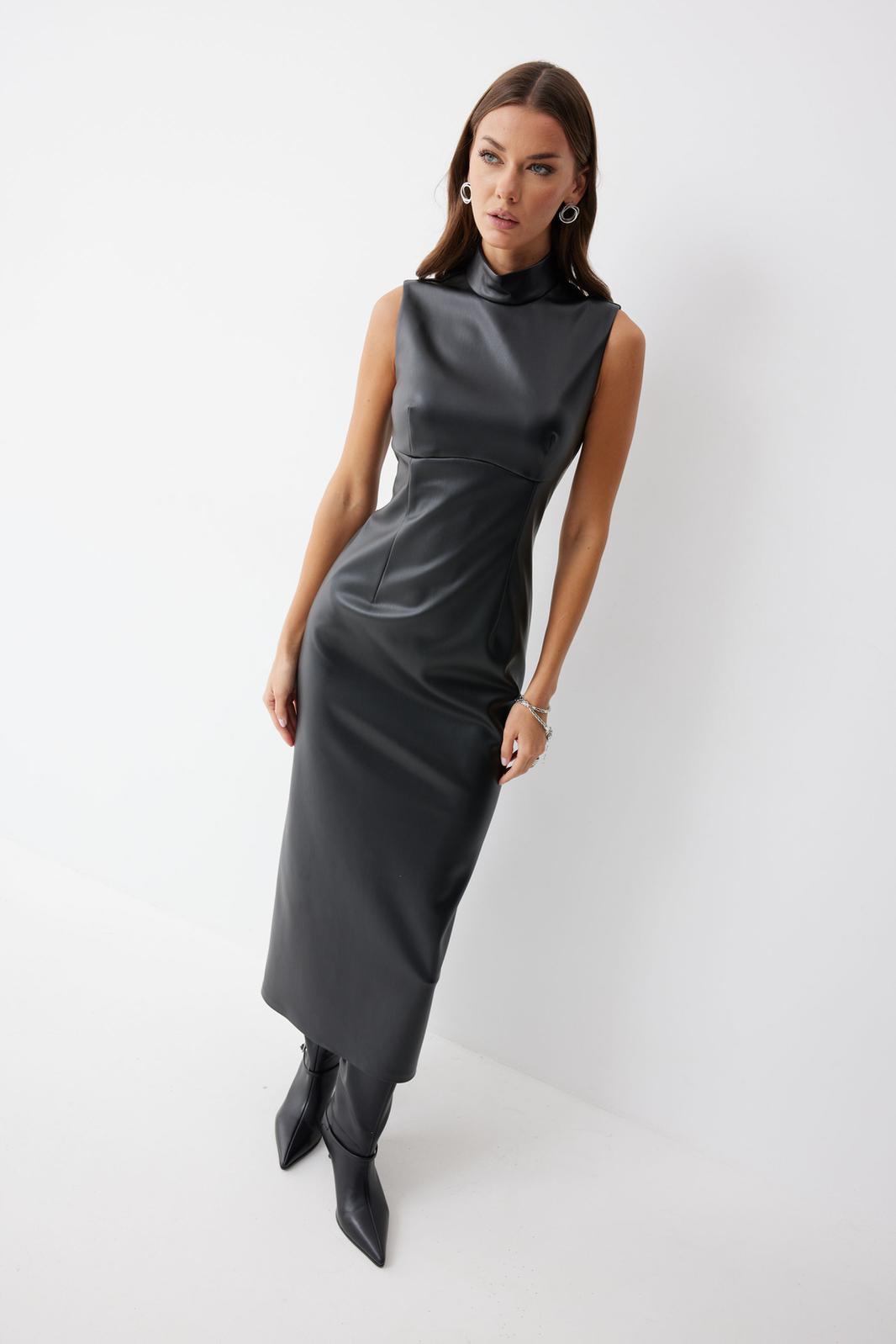 Платье прилегающего силуэта из экокожи длиной миди. Горловина-стойка. Спереди под грудью подрез, нагрудные и талиевые вытачки. На спинке в центральном шве потайная молния, по низу шлица. На спинке платья талиевые вытачки.
