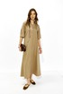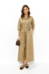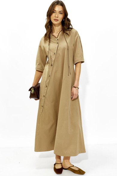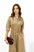 Стильное платье А-силуэта, расширенное к низу из плательной ткани. Застежка смещенная на отрезную планку с пуговицами в натуральном стиле. По переду фигурный ассиметричный подрез. Спинка по линии талии отрезная. Линия плеч спущена, рукава со встречными складками по центру и притачными манжетами по низу. Платье дополняет пояс, застегивающийся на пуговицы планки. При желании пояс можно завязать или носить платье самостоятельно без пояса. Обращаем ваше внимание, что фурнитура может отличаться от фото.