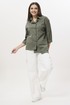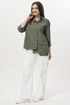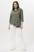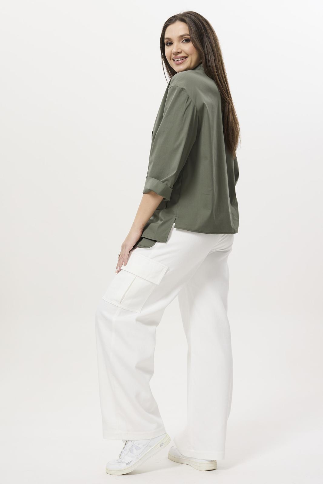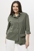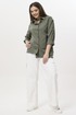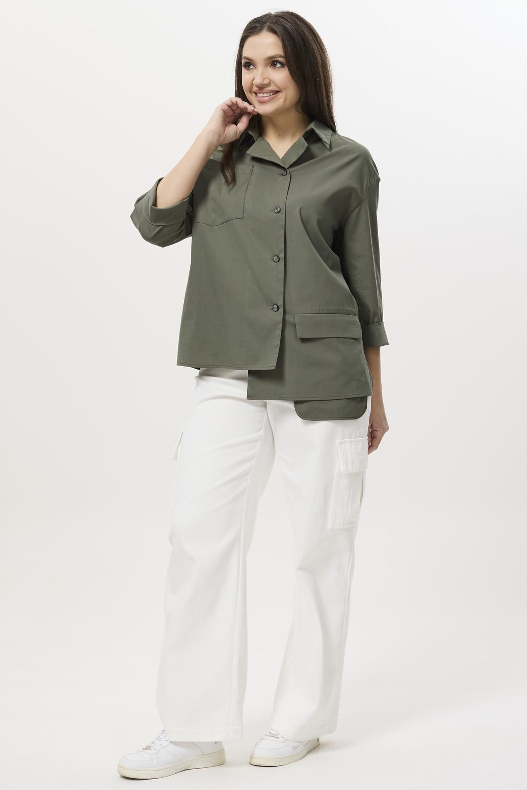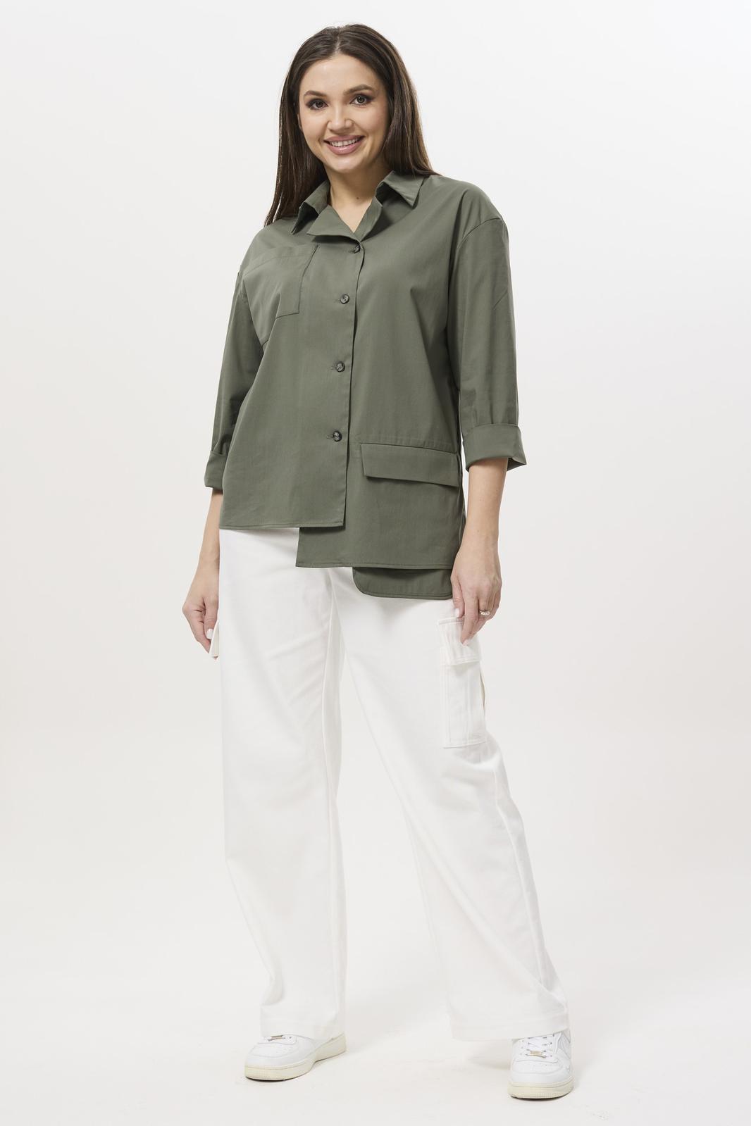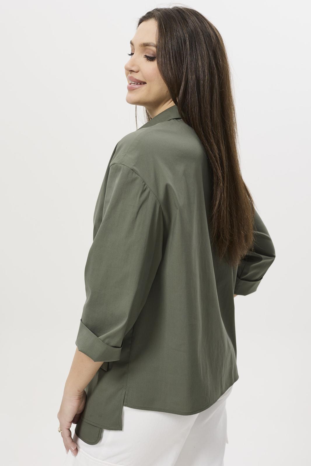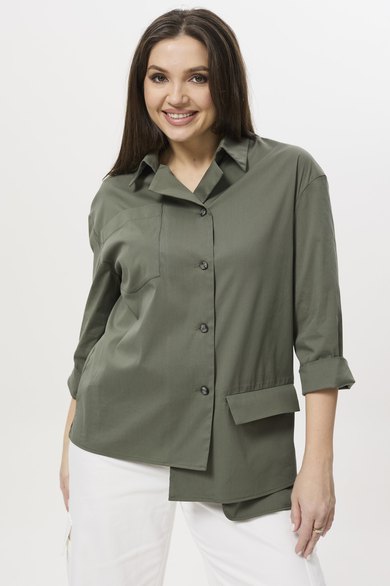 Воротник рубашечный. Застежка центральная на петли и пуговицы. На правой полочке функциональный накладной карман, на левой - прорезной карман с клапаном. Спинка цельная. Рукав втачной одношовный со спущеным плечом.