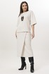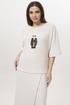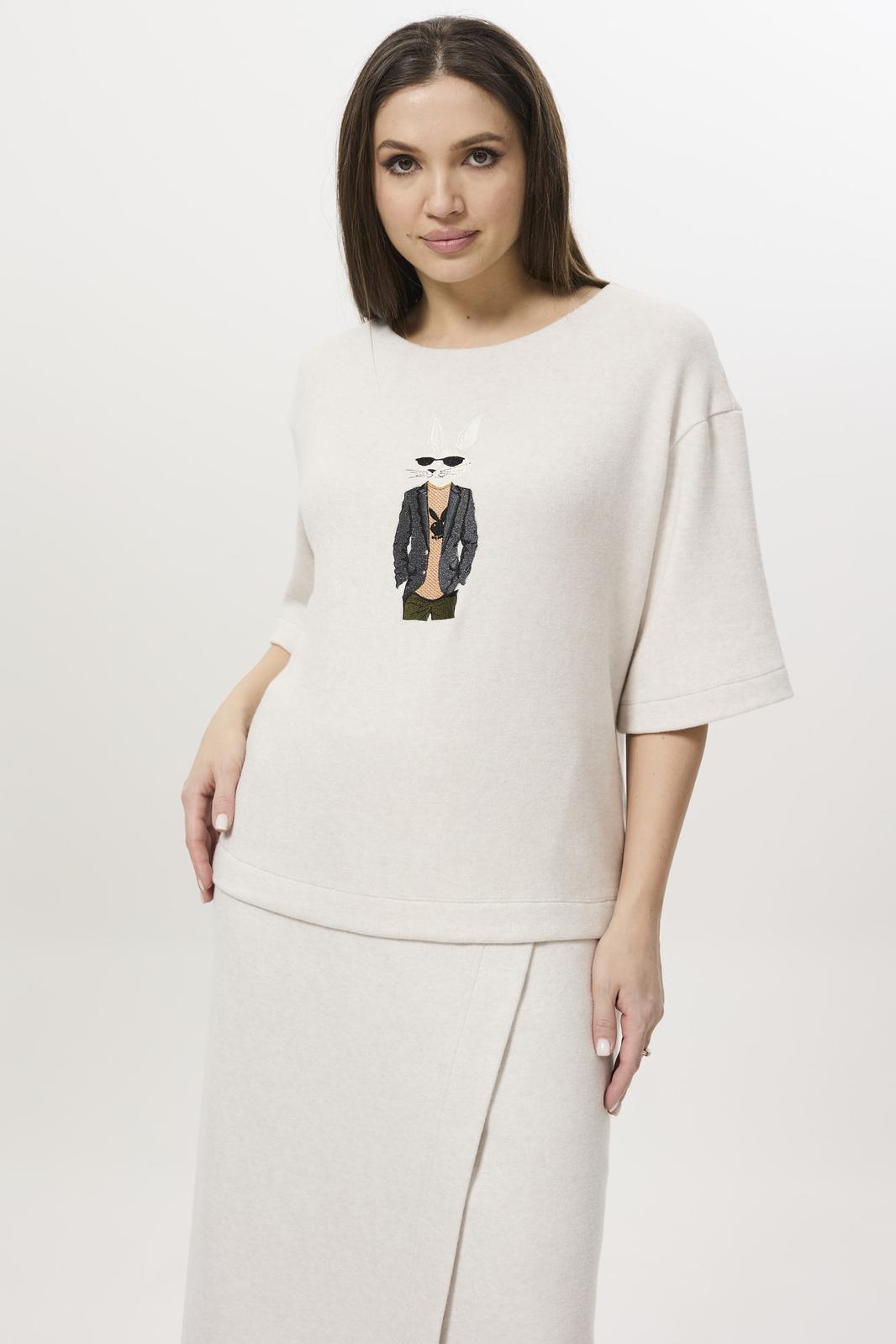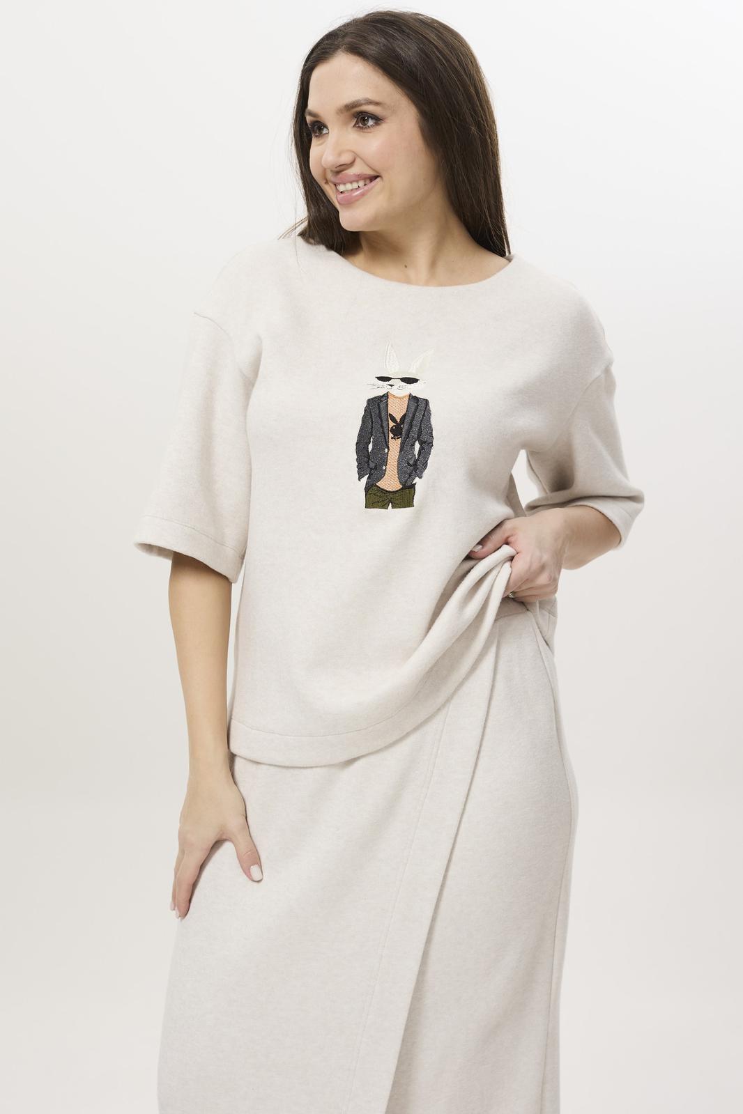 Джемпер свободного силуэта. Горловина округлая, обработана обтачкой. Полочка цельная, на груди дизайнерская вышивка заяц. Спинка со средним швом. Рукав одношовный втачной длиной по локоть, линия плеча спущена.
