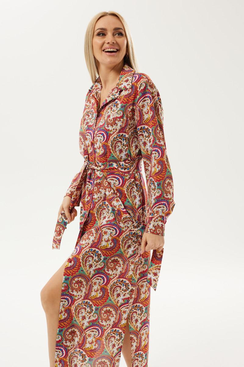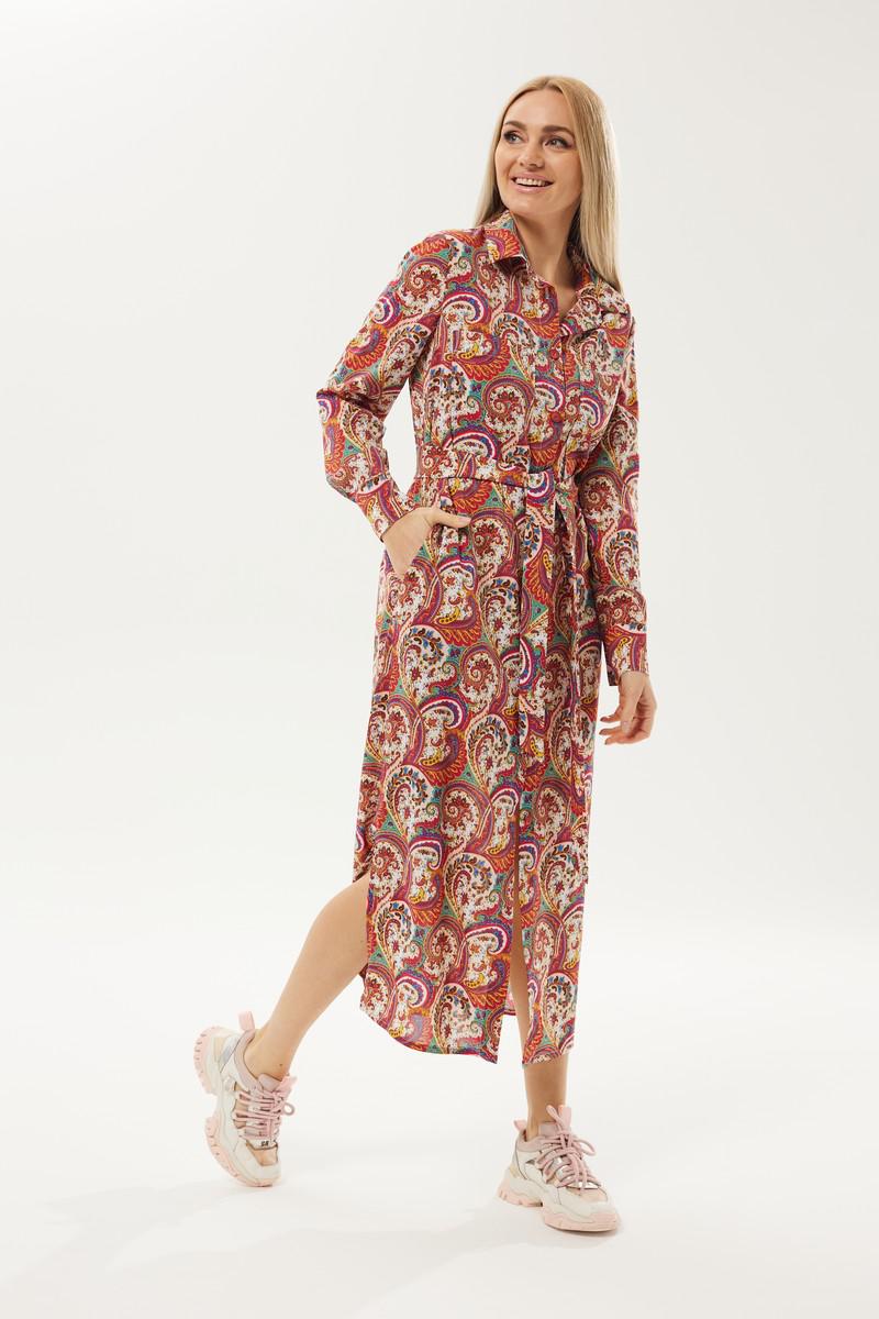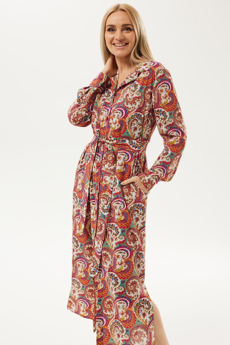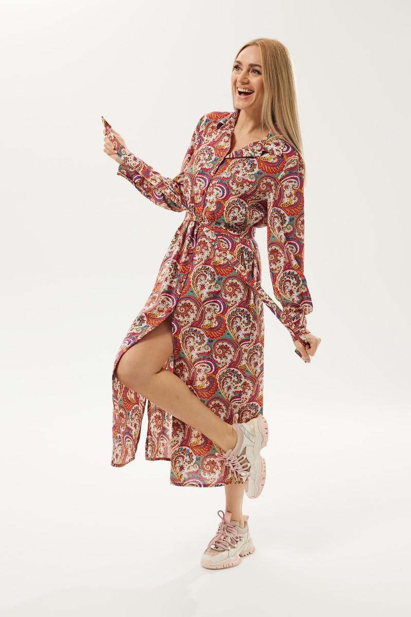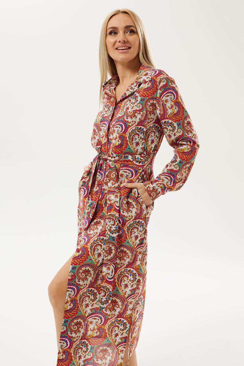Длинное платье рубашечного типа с ярким запоминающимся принтом. Застежка центральная на петли и пуговицы. Горловина с отложным рубашечным воротником на стойке. Рукав длинный одношовный втачной, низ рукава оформлен манжетой на две петли и пуговицы. Нижняя часть платья фгурная, в боковых швах разрезы. В комплект идет пояс из основной ткани.