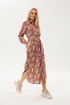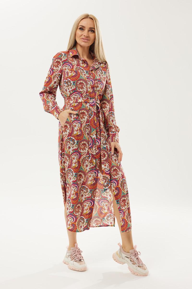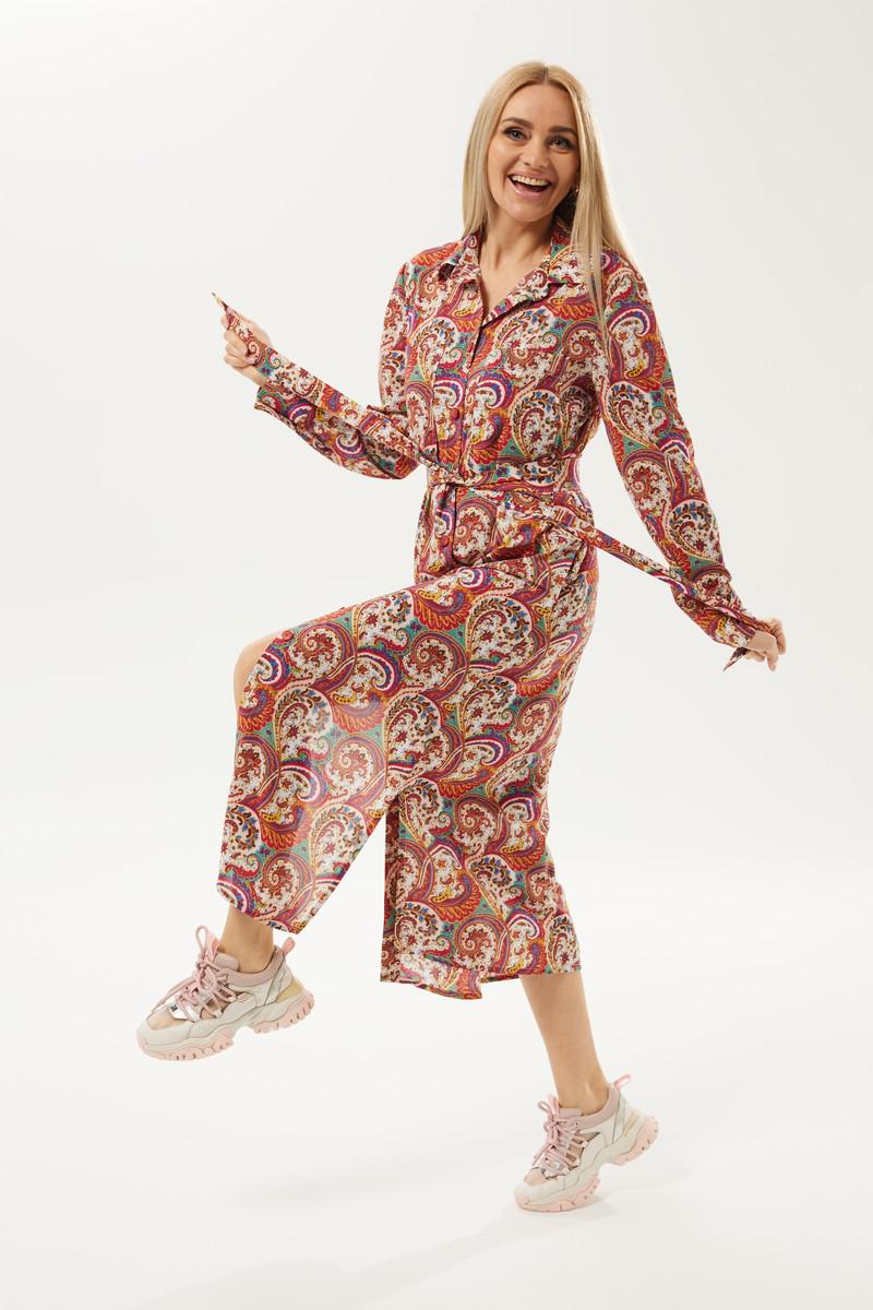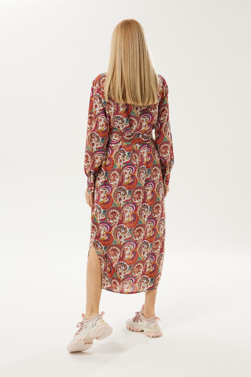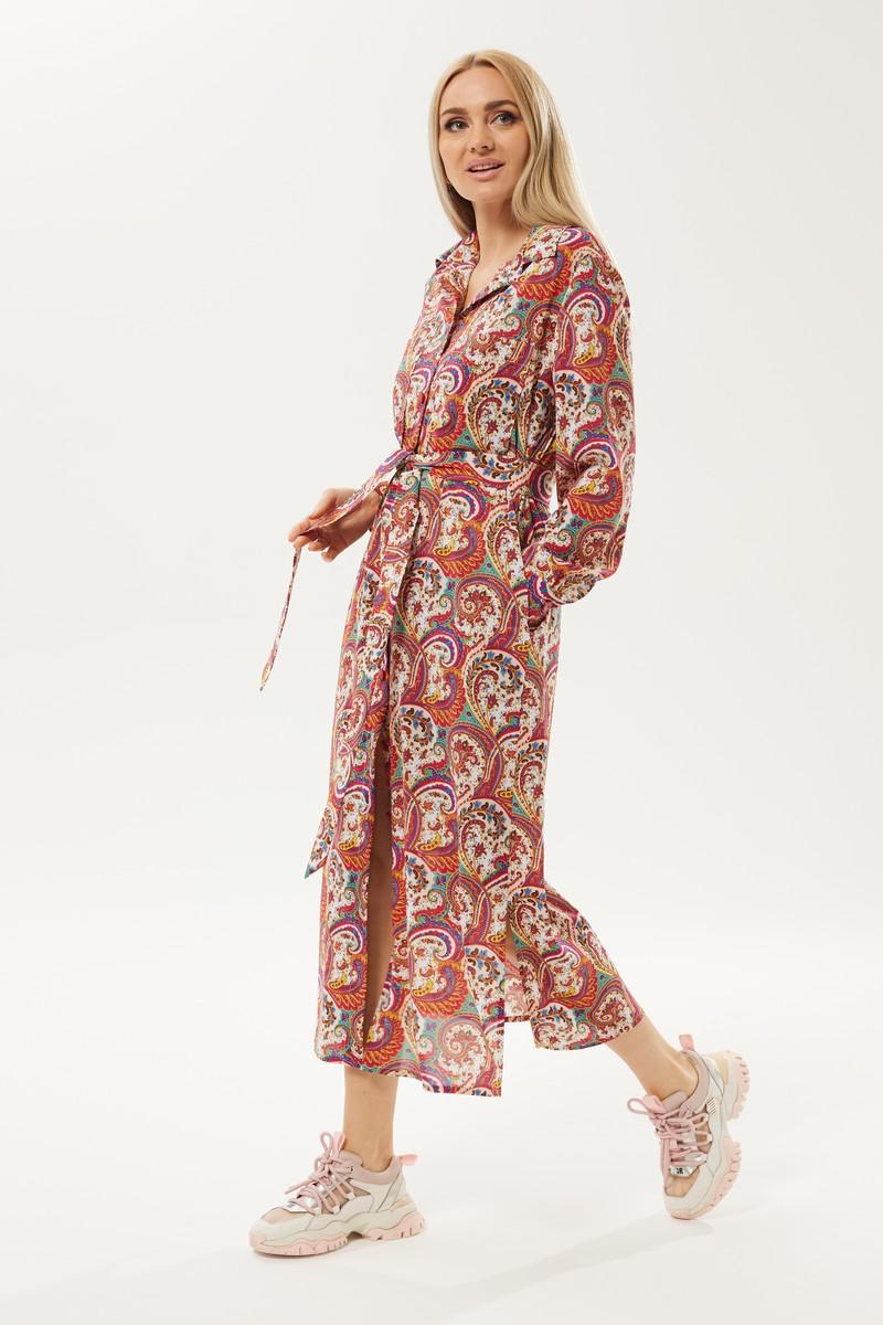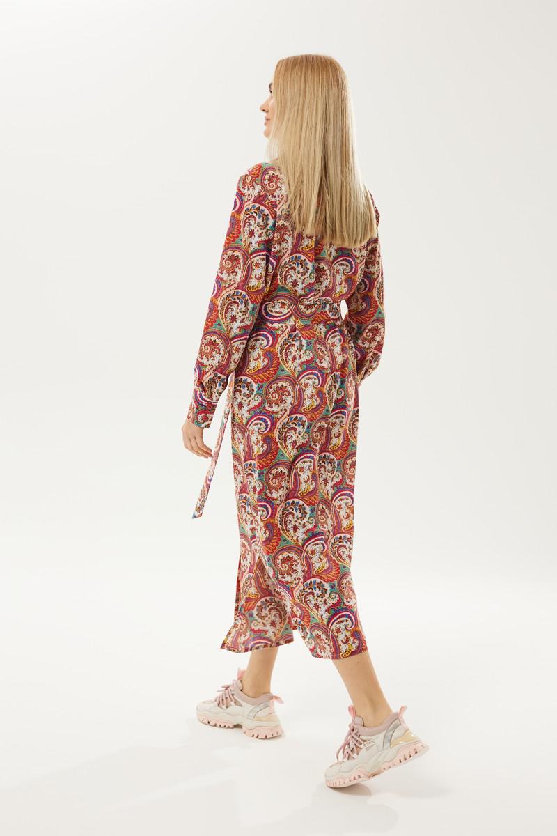 Длинное платье рубашечного типа с ярким запоминающимся принтом. Застежка центральная на петли и пуговицы. Горловина с отложным рубашечным воротником на стойке. Рукав длинный одношовный втачной, низ рукава оформлен манжетой на две петли и пуговицы. Нижняя часть платья фгурная, в боковых швах разрезы. В комплект идет пояс из основной ткани.