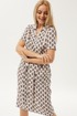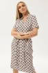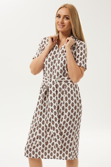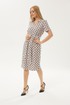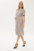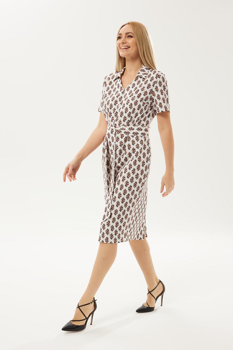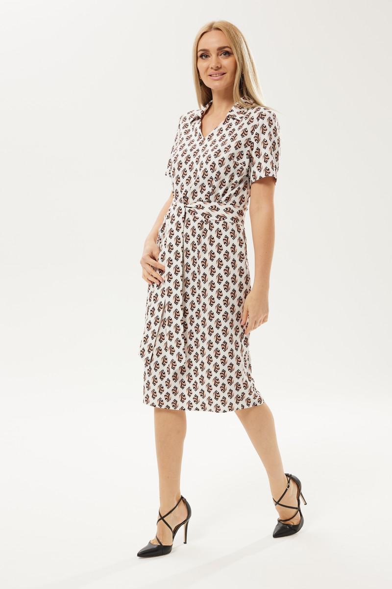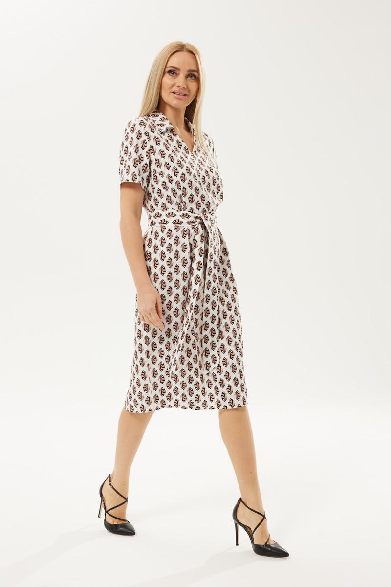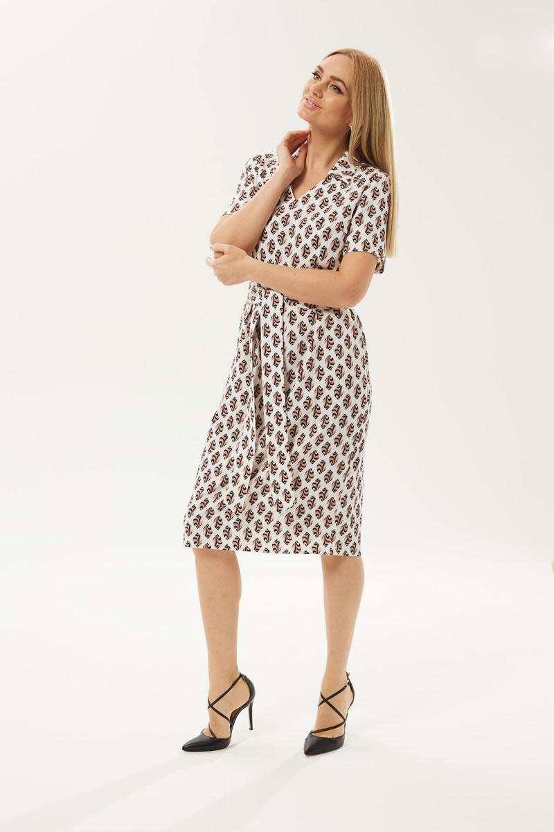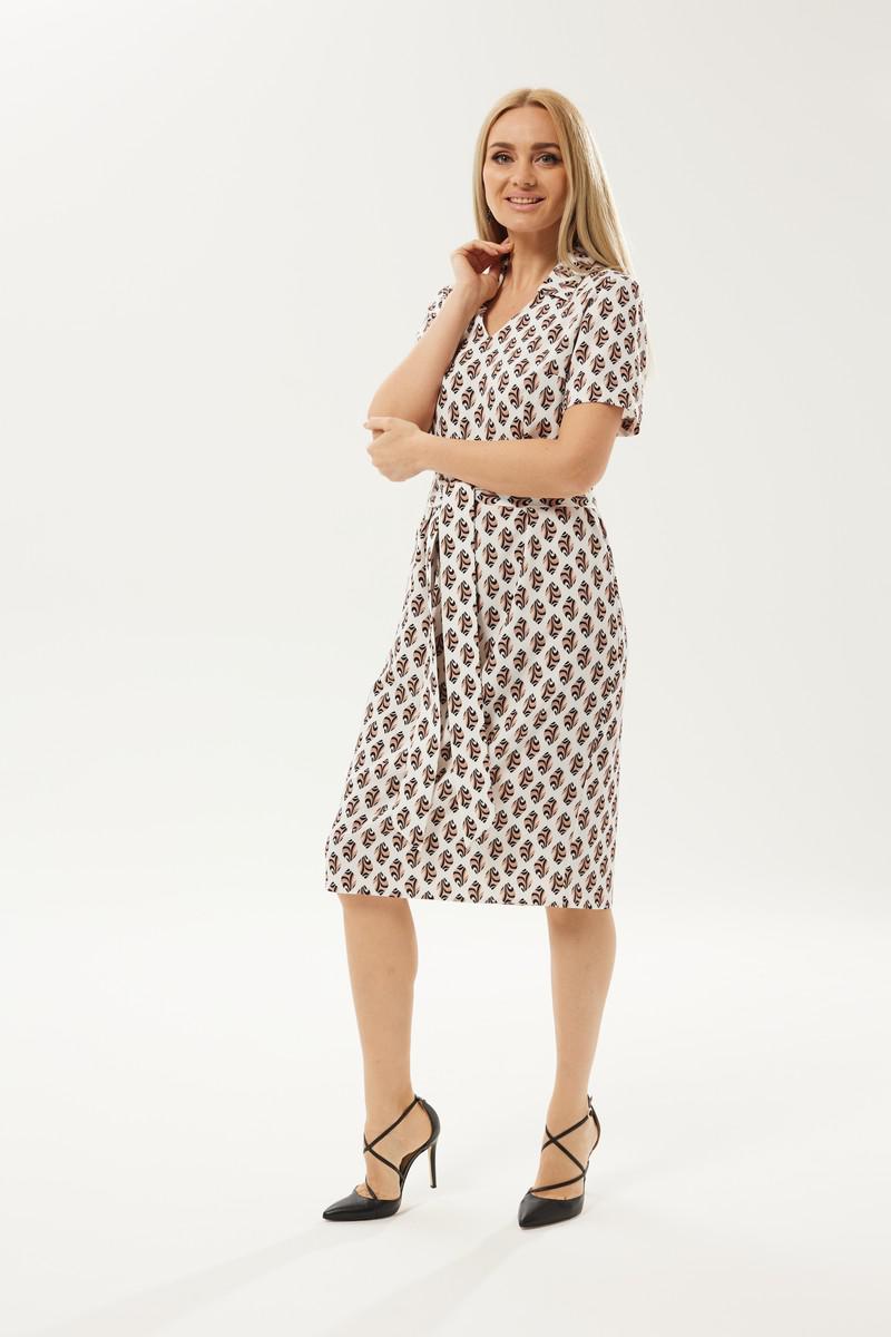 Платье длиной по колено полуприлегающего силуэта. Перед с нагрудными вытачками и V-образным вырезом. Спинка со средним швом, в котором расположена шлица. Горловина оформлена отложным воротником на полустойке. На полочке и спинке талиевые вытачки для прилегания. В боковом шве расположена потайная тесьма-молния. Рукав втачной короткий.