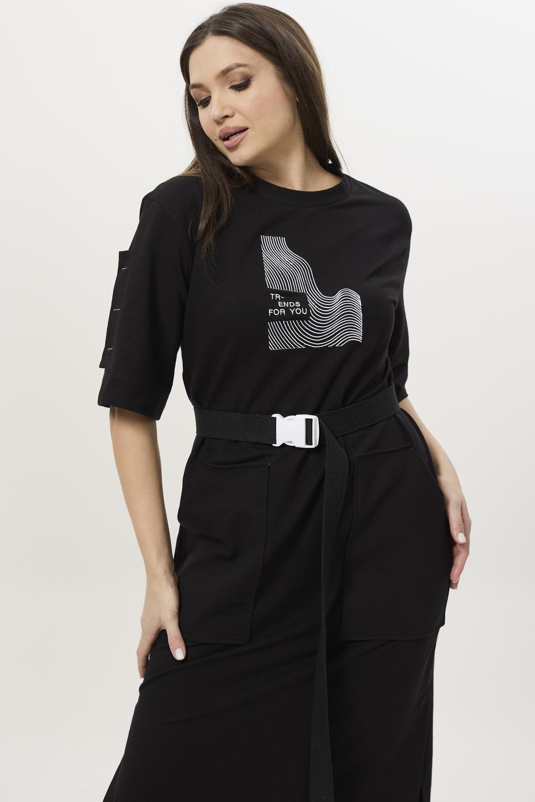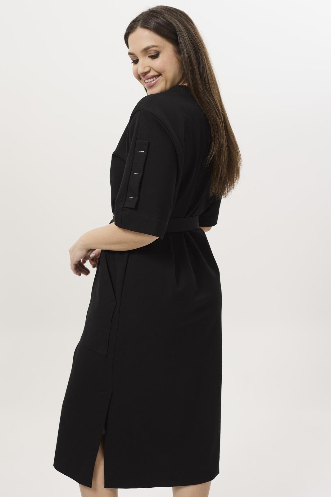 Перед цельный с декоративной дизайнерской вышивкой и двумя настрочными карманами. Горловина округлой формы, обработана бейкой. Спинка цельная, в боковых швах шлица. Рукав двухшовный втачной с патой, длиной по локоть. Линия плеча немного спущена. Пояс в комплекте.