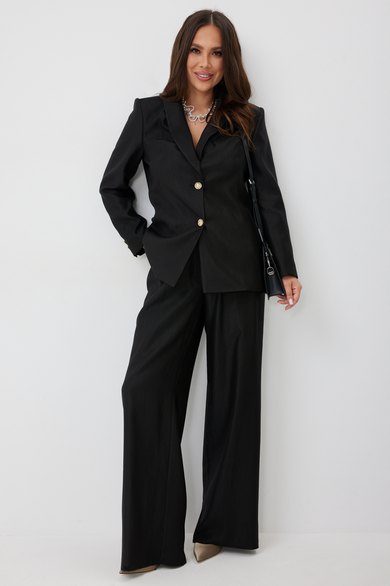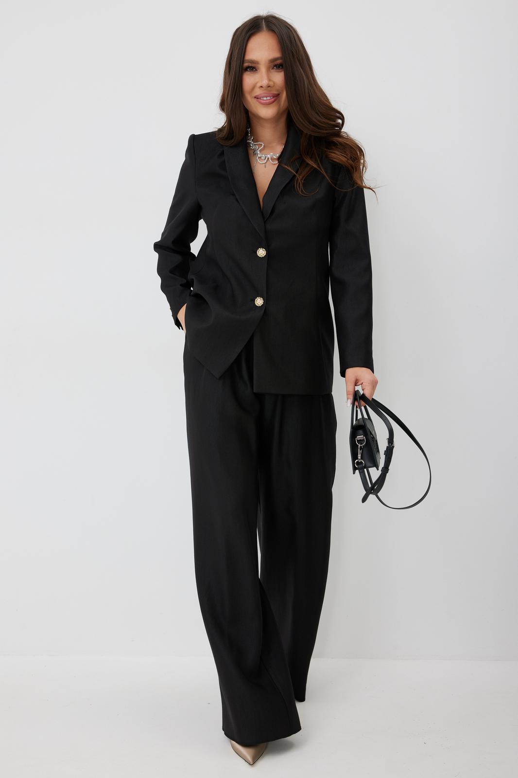 Элегантный и безумно красивый костюм из жакета и брюк. Выполнен из красивой гладкой костюмной ткани с легким жемчужным отблеском. Жакет прямого свободного кроя с красивыми рельефами, на подкладке, с центральной застежкой на пуговицы. Брюки классического прямого кроя с притачным поясом, дополненным эластичной тесьмой. Дополнены удобными боковыми и задними карманами. Застежка гульфик на молнию и пришивную пуговицу. Длина жакета от плечевого шва 73 см. Длина рукава 60см. Длина брюк 107 см