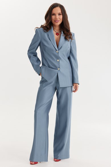 Элегантный и безумно красивый костюм из жакета и брюк. Выполнен из красивой гладкой костюмной ткани с легким жемчужным отблеском. Жакет прямого свободного кроя с красивыми рельефами, на подкладке, с центральной застежкой на пуговицы. Брюки классического прямого кроя с притачным поясом, дополненным эластичной тесьмой. Дополнены удобными боковыми и задними карманами. Застежка гульфик на молнию и пришивную пуговицу.