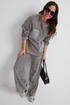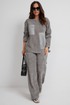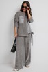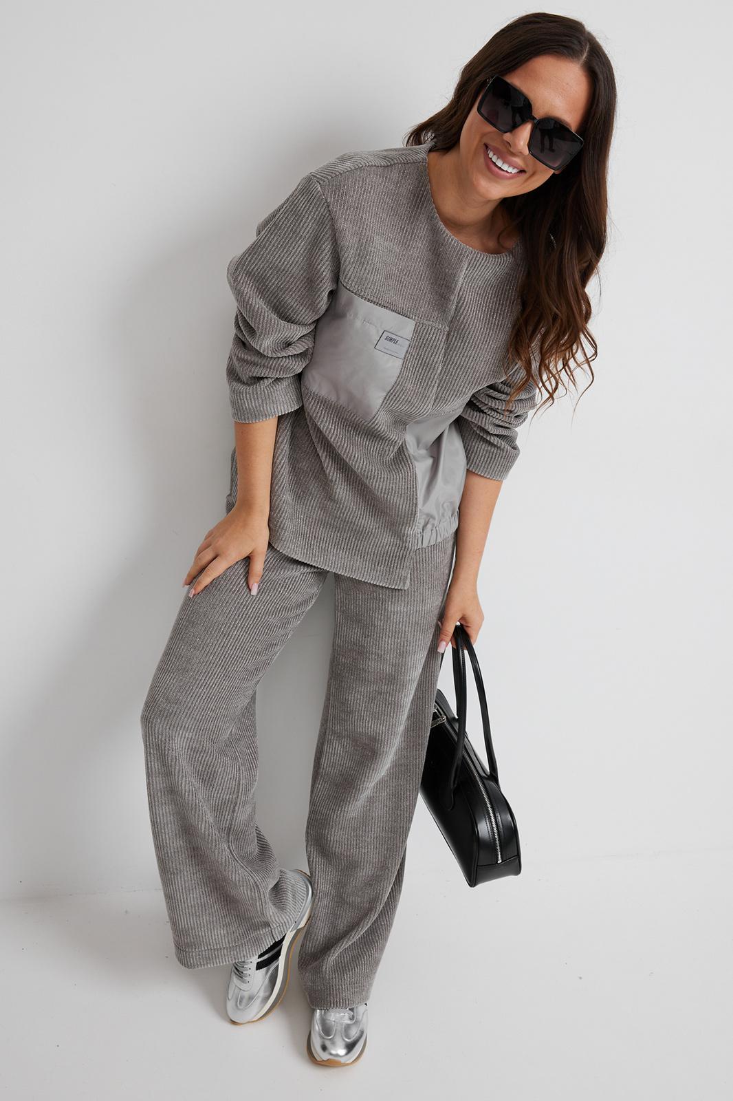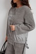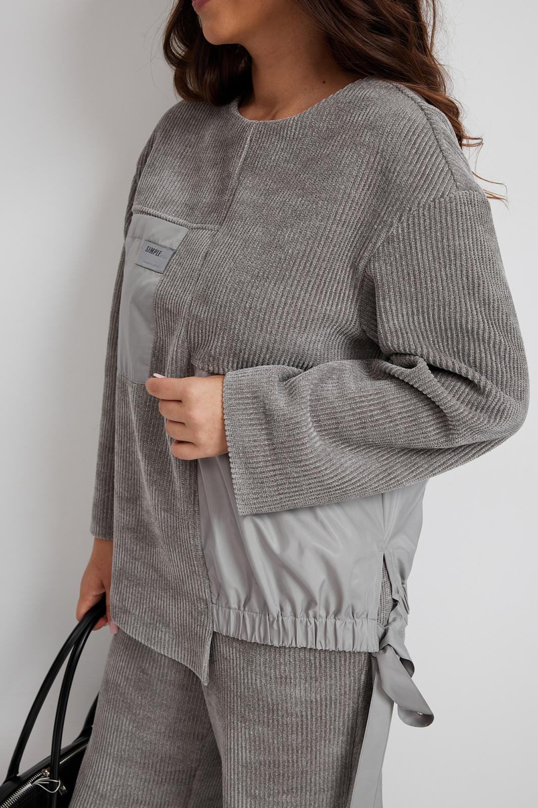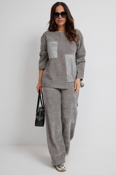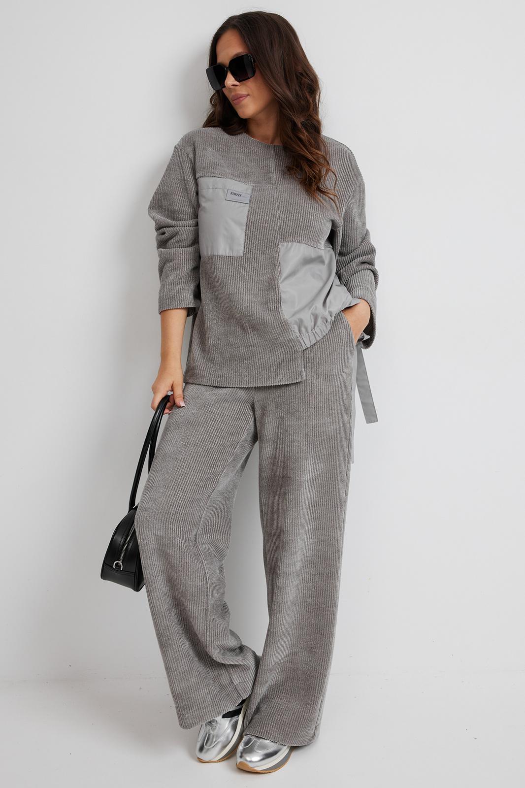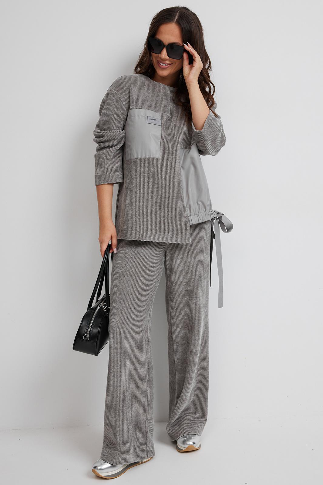 Стильный костюм из джемпера и брюк. Выполнен из фактурного трикотажного полотна (штрукс) в комбинации с красивой мягкой плащевой тканью. Джемпер свободного кроя с застежкой по спинке на кнопки. Рукав слегка спущен. По низу джемпер дополнен красивой сборкой на эластичную тесьму и завязывается в красивый бант. Брюки прямого свободного кроя, с притачным поясом, дополненным эластичной тесьмой. Посадка средняя. По бокам брюки дополнены удобными карманами. Длина спинки 69 см. Длина брюк по боковому шву 104 см.