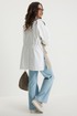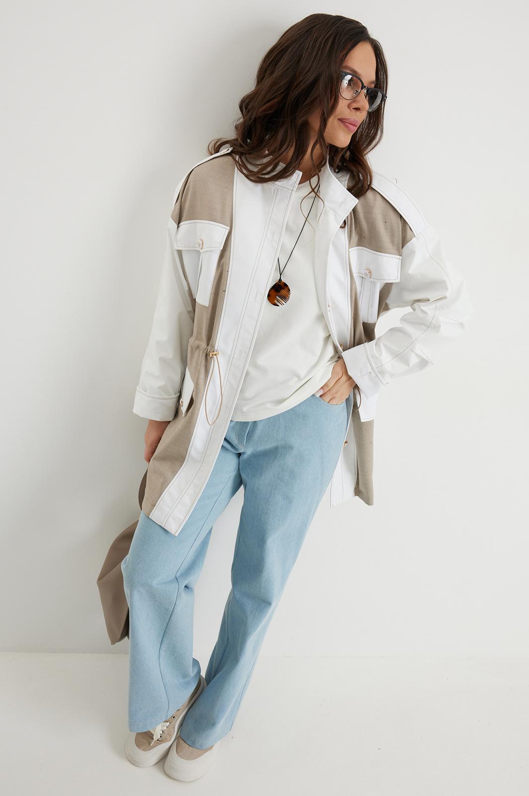 Стильный комплект из легкой парки и брюк из джинсовой ткани. Парка свободного кроя over, на подкладке, с центральной застежкой на красивые пришивные пуговицы. Горловина обработана стойкой. Выполнена из двух видов ткани: костюмной ткани с редкими мерцающими пайетками и плащевой ткани. По талии парка дополнена кулиской с эластичной тесьмой и фиксаторами, за счет которой можно формировать различный силуэт. Джинсы прямого классического кроя с застежкой гульфик на пуговицу и металлическую молнию. Посадка средняя. Дополнены удобными боковыми и задними карманами. Длина парки от плечевого шва 88 см. Длина рукава 60 см. Длина брюк по боковому шву 105 см.