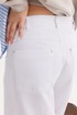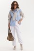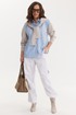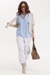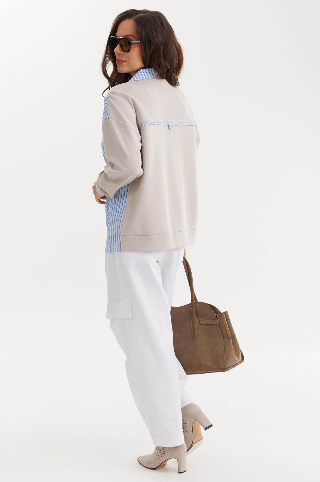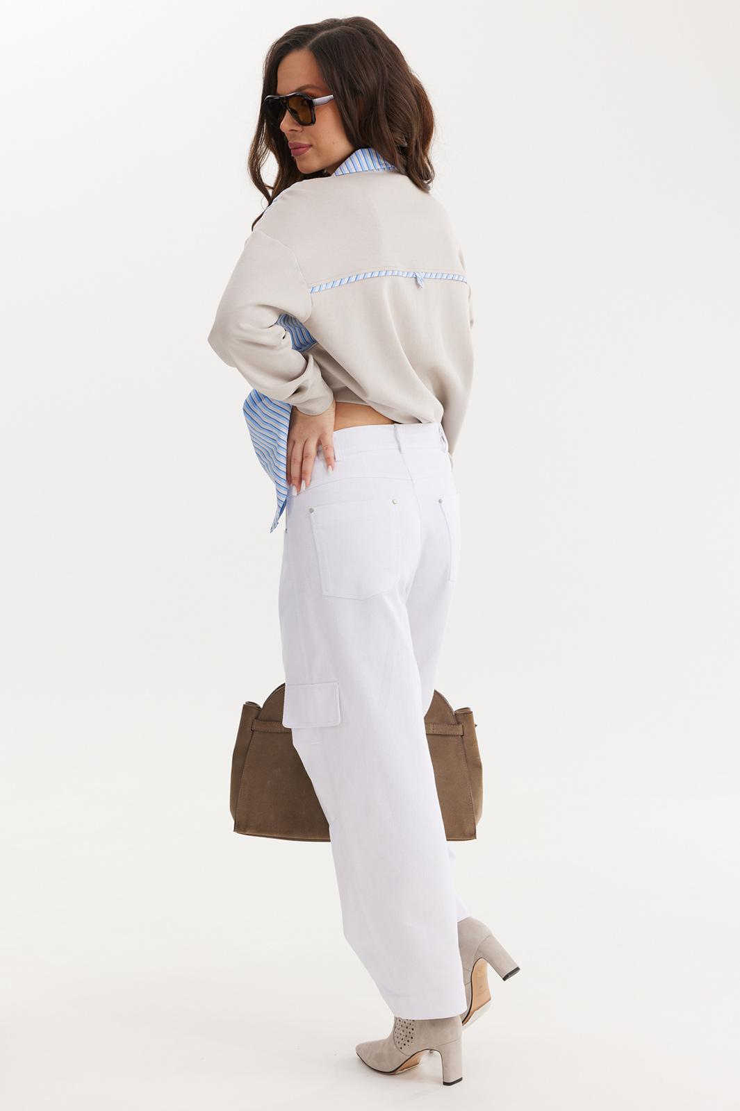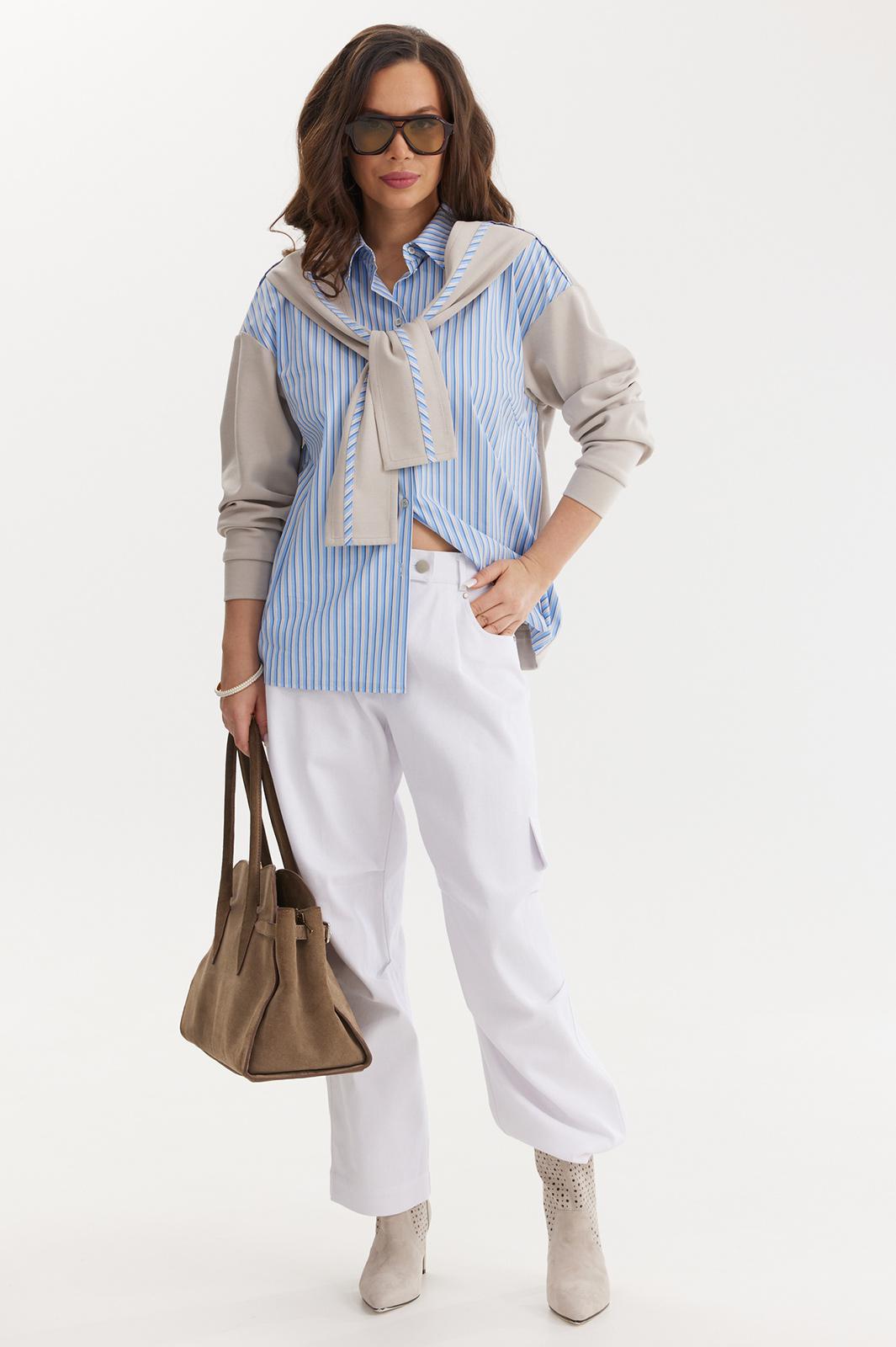 Стильный комплект из блузы и брюк. Блуза свободного рубашечного кроя, с центральной застежкой на пришивные пуговицы. Горловина обработана отложным воротником на стойке. Спинка и рукава выполнены из комфортного гладкого трикотажного полотна. Декоративный элемент на плечах, имитирующий завязанные рукава , придает образу непринужденный шарм и свежесть. Брюки свободного кроя с притачным поясом, дополненным эластичной тесьмой. Посадка средняя. Застежка гульфик на молнию и красивые пуговицы. Выполнены из белой джинсовой ткани. Оригинальные защипы в районе колена придают джинсам модный силуэт. С правой стороны имитация кармана. Джинсы имеют классическое расположение боковых и задних накладных карманов, дополненных хольнитенами. Длина блузы от плечевого шва 67 см. Длина рукава 60 см. Длина брюк по боковому шву 96 см.