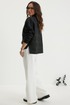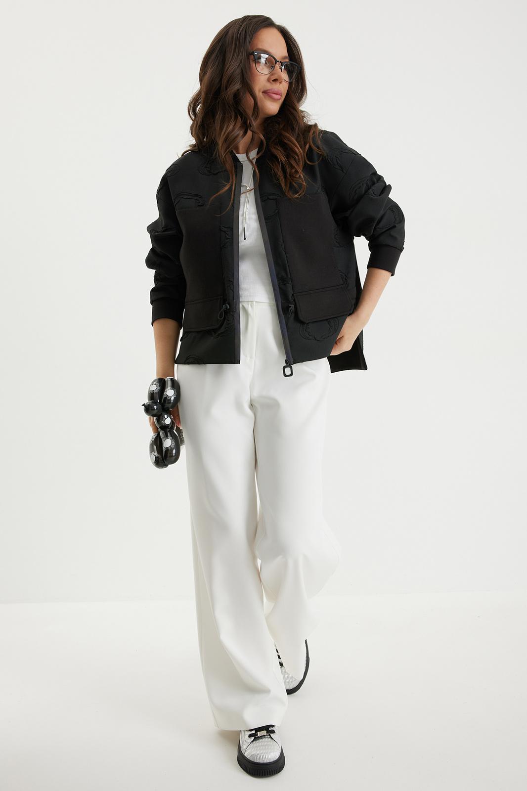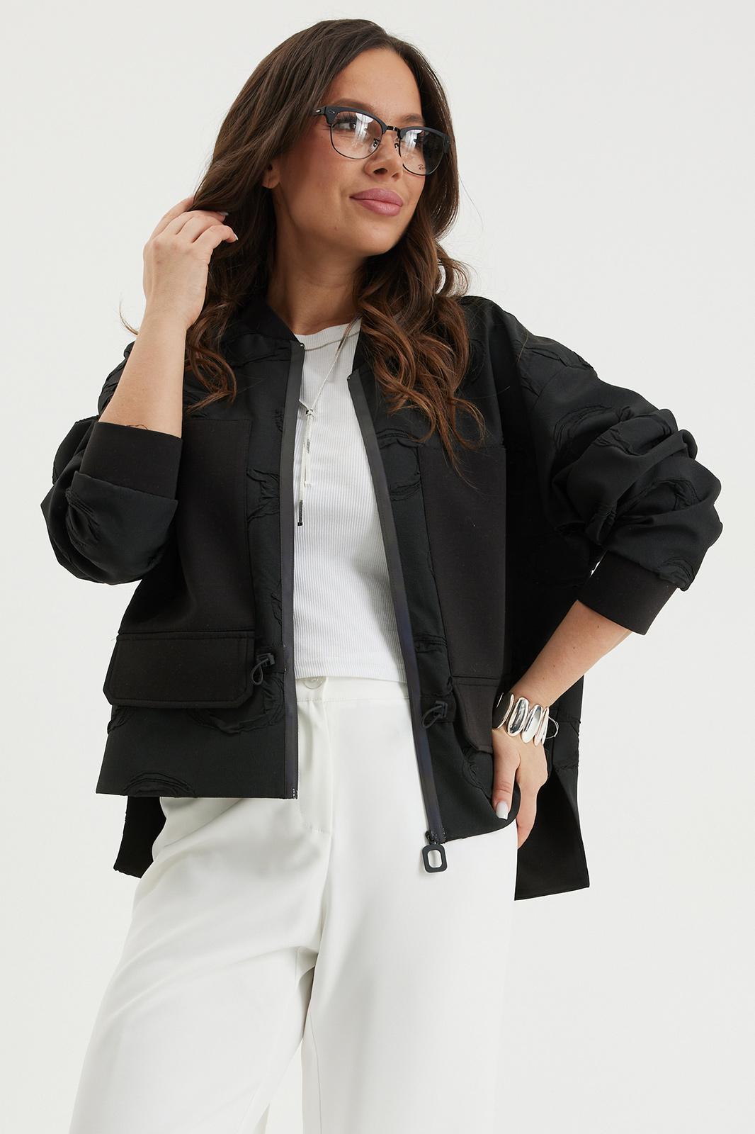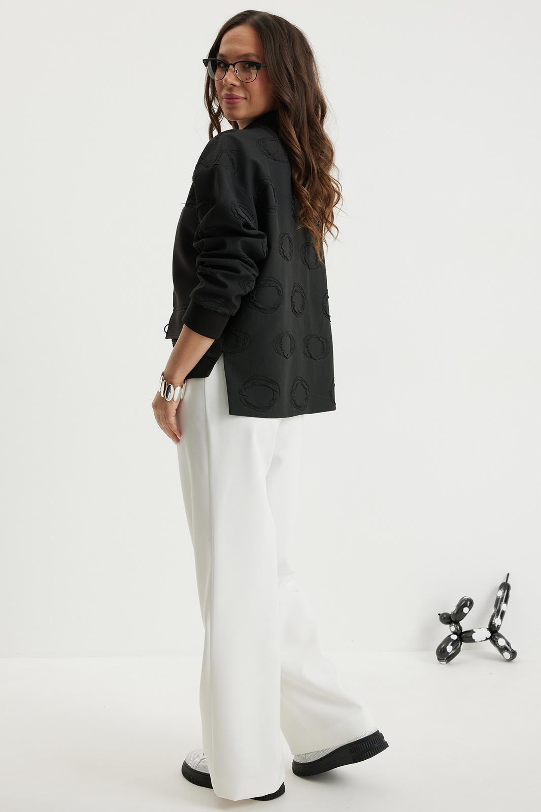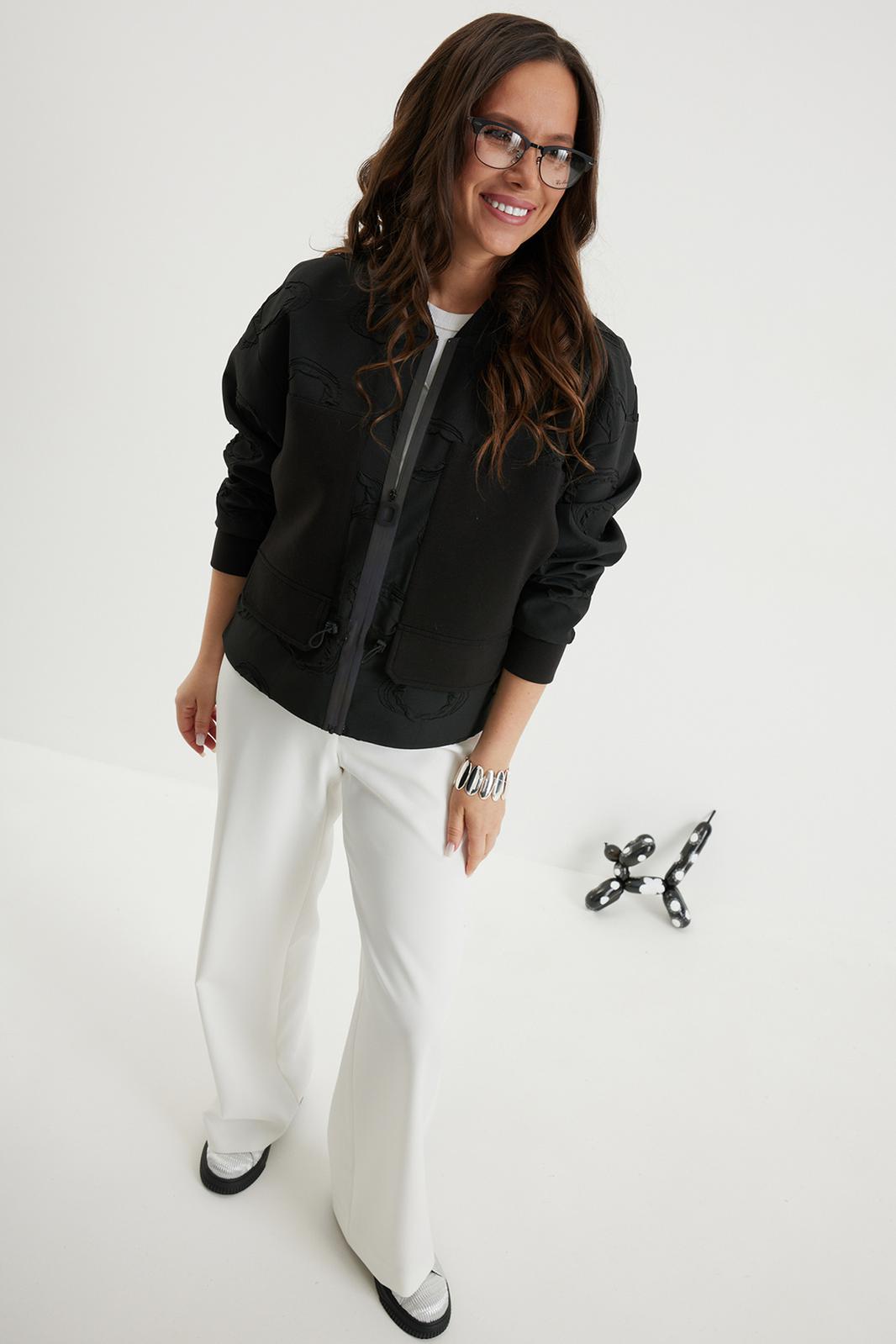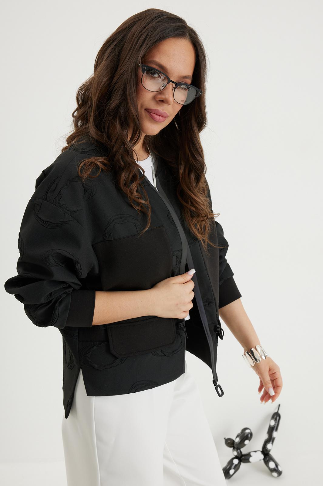 Стильный комплект из бомбера и брюк. Бомбер свободного кроя с центральной застежкой на красивую молнию. Выполнен из фактурного жаккардового полотна на подкладке. Дополнен удобными боковыми карманами. Рукав полной длины, слегка спущен, присборен по низу на эластичную тесьму. Брюки прямого классического кроя, с притачным поясом, дополненным эластичной тесьмой. Застежка гульфик на молнию и пуговицу. Брюки дополнены комфортной подкладкой телесного цвета, что исключает просвечивание белья и фактуры кожи. Длина бомбера по спинке 70 см., по переду 66 см., Длина рукава 60 см. Длина брюк по боковому шву 104 см.