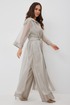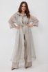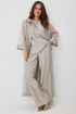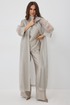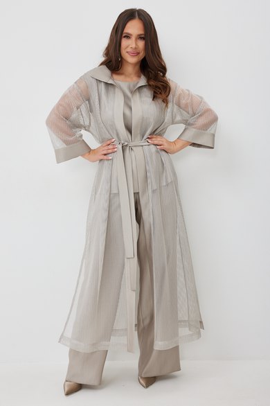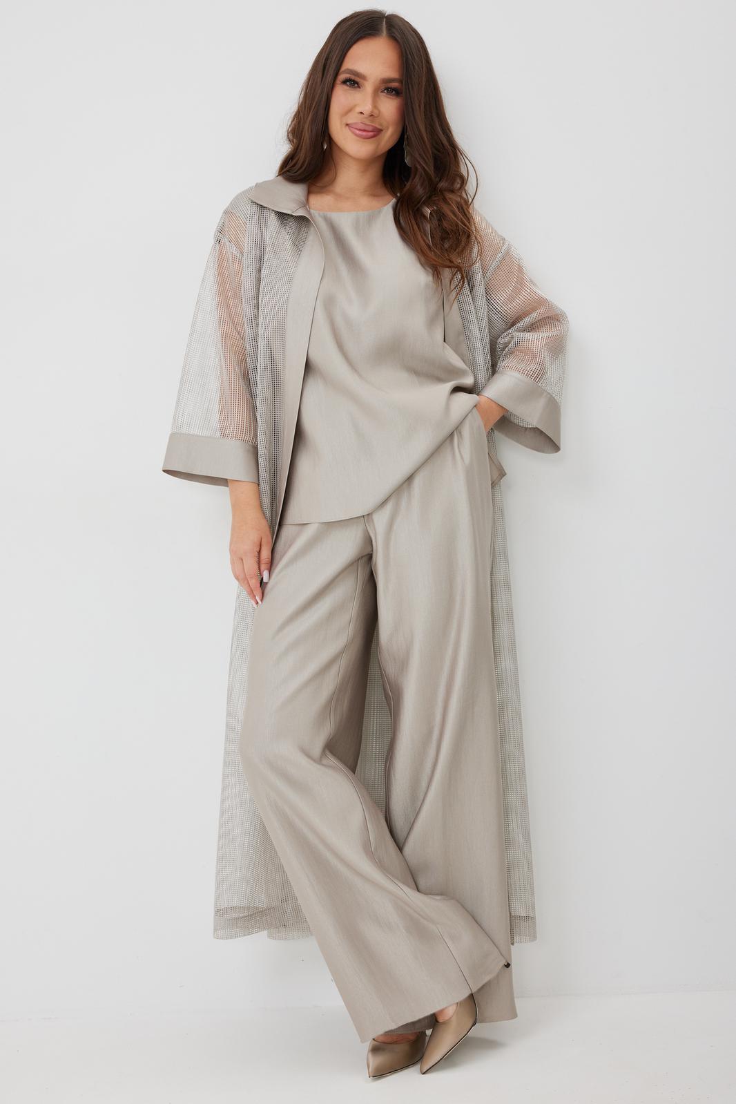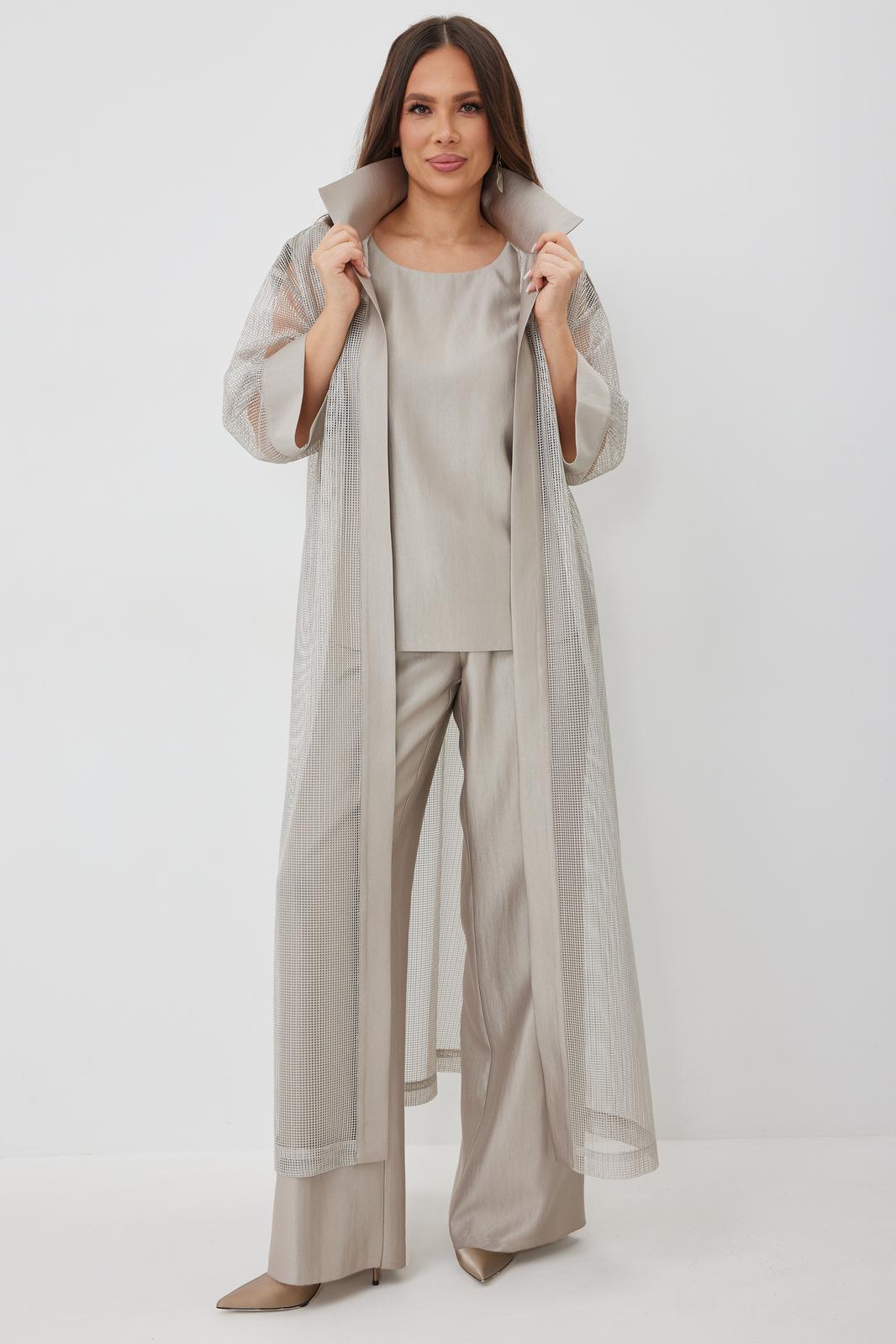 Стильный комплект из длинного кардигана, топа и брюк. Кардиган свободного прямого кроя с разрезами. Выполнен из текстильной сетки с отделкой из гладкой костюмной ткани. Рукав втачной, слегка спущен. Дополнен съемным поясом. Топ и брюки выполнены из красивой костюмной гладкой ткани. Топ свободного прямого кроя. Горловина округлой формы. Брюки классического прямого кроя. Посадка средняя. Пояс притачной, дополнен эластичной тесьмой. Брюки дополнены удобными боковыми и задними карманами. Застежка гульфик на молнию и пуговицу. Длина кардигана от плечевого шва 136см. Длина рукава 47см. Длина топа от плечевого шва 67см. Длина брюк по боковому шву 107см.