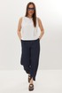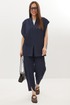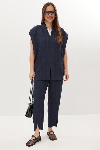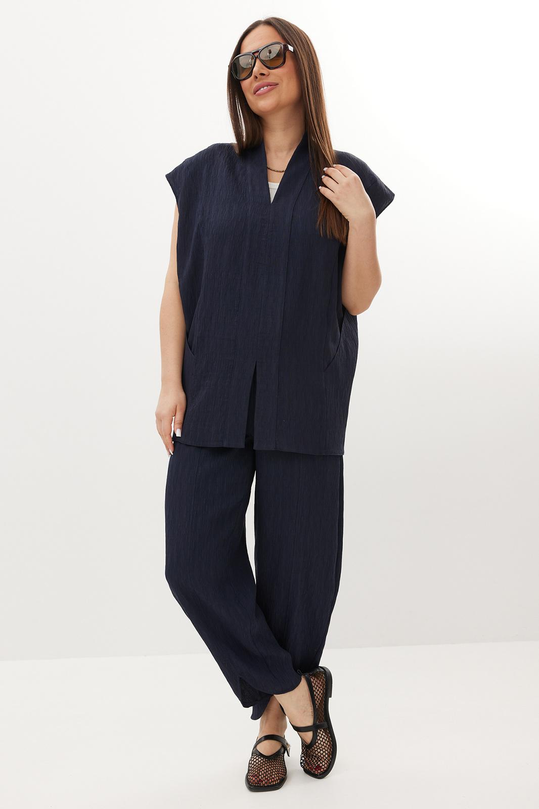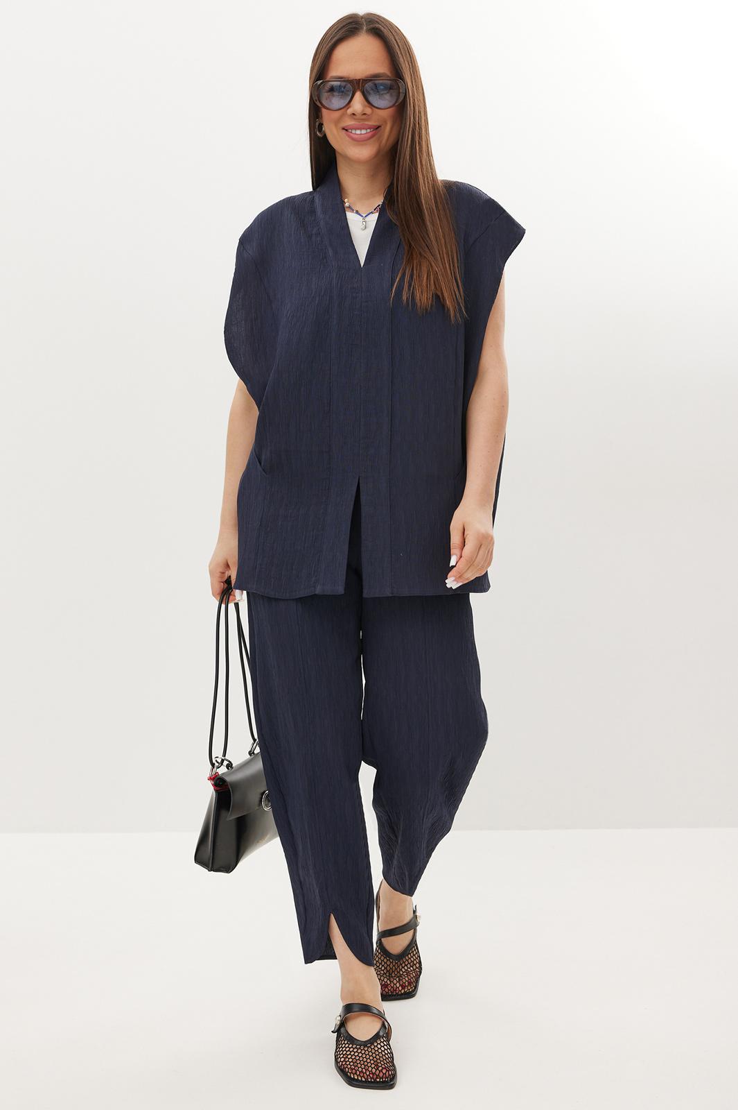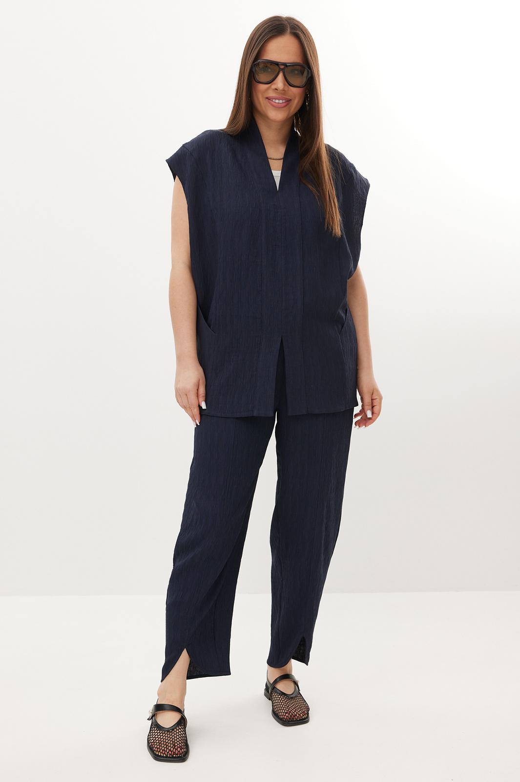 Стильный комплект из жилета, топа и брюк. Жилет и брюки выполнены из фактурной натуральной ткани. Топ свободного кроя из белой хлопковой ткани в рубчик. Удлиненный жилет свободного кроя со спущенной линией плеча. Дополнен оригинальными карманами. Брюки свободного кроя с притачным поясом, дополненным эластичной тесьмой. Посадка средняя. По спинке красивая кокетка. Брюки слегка заужены книзу с красивым вырезом. Удобные боковые карманы добавляют комфорта. Длина жилета от плечевого шва 74 см. Длина топа 58 см. Длина брюк по боковому шву 97 см.